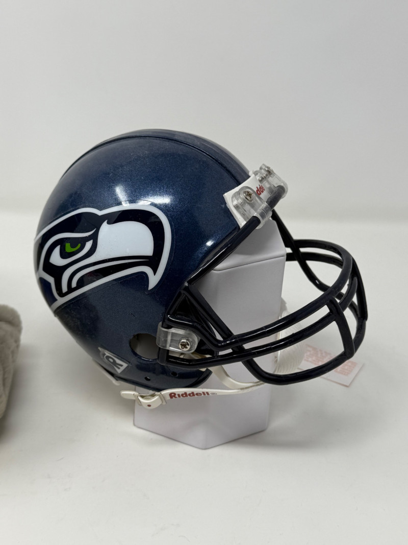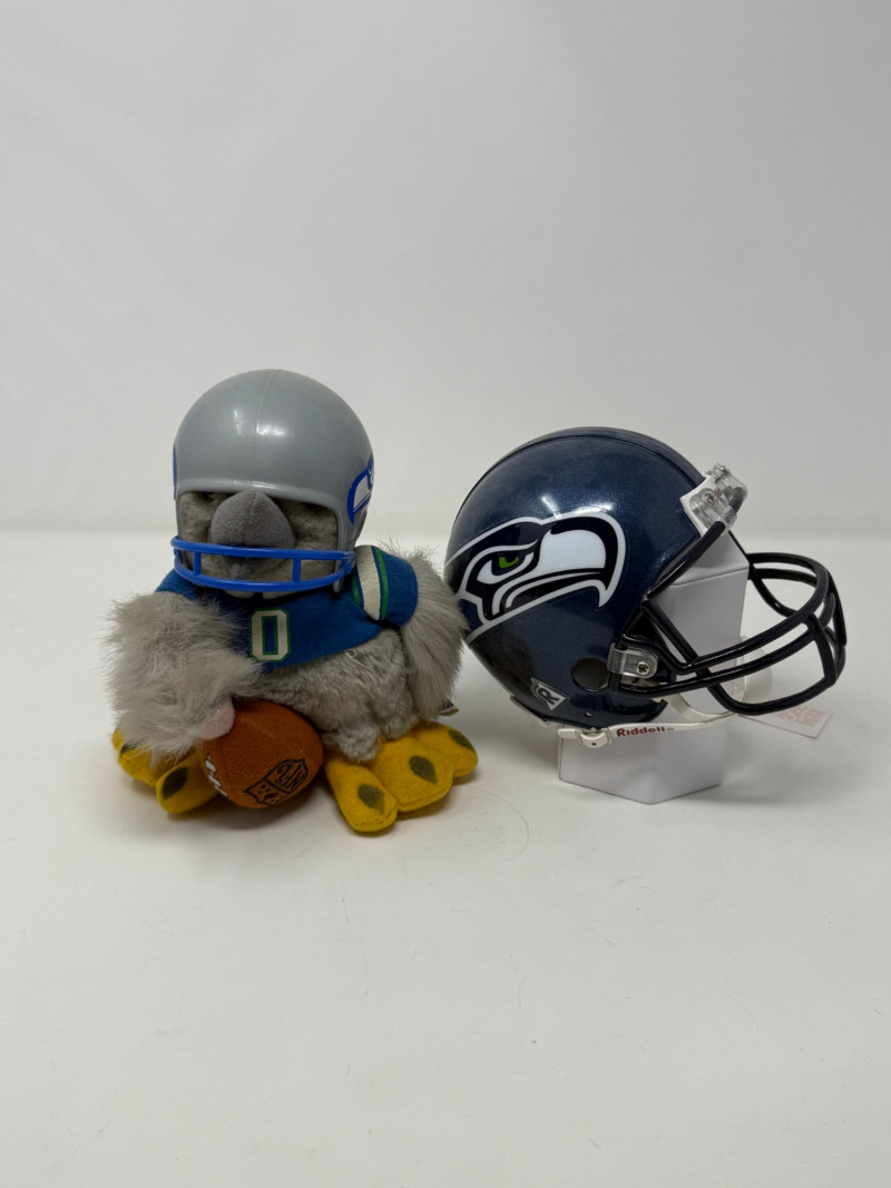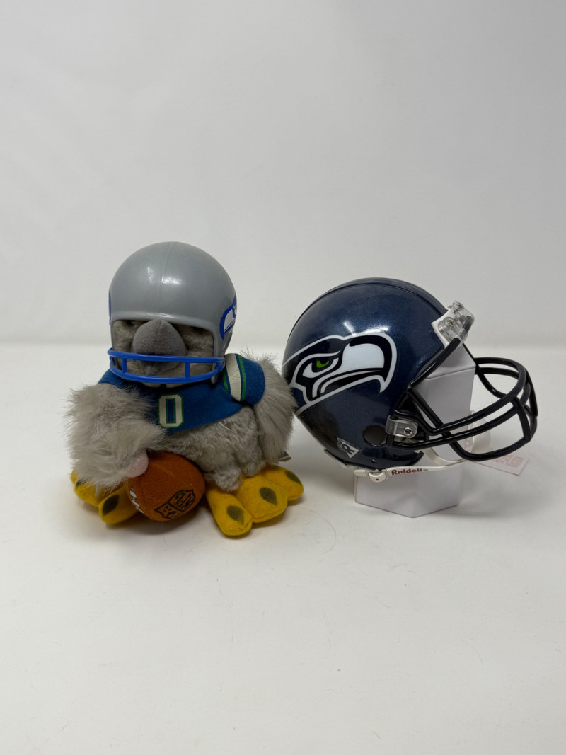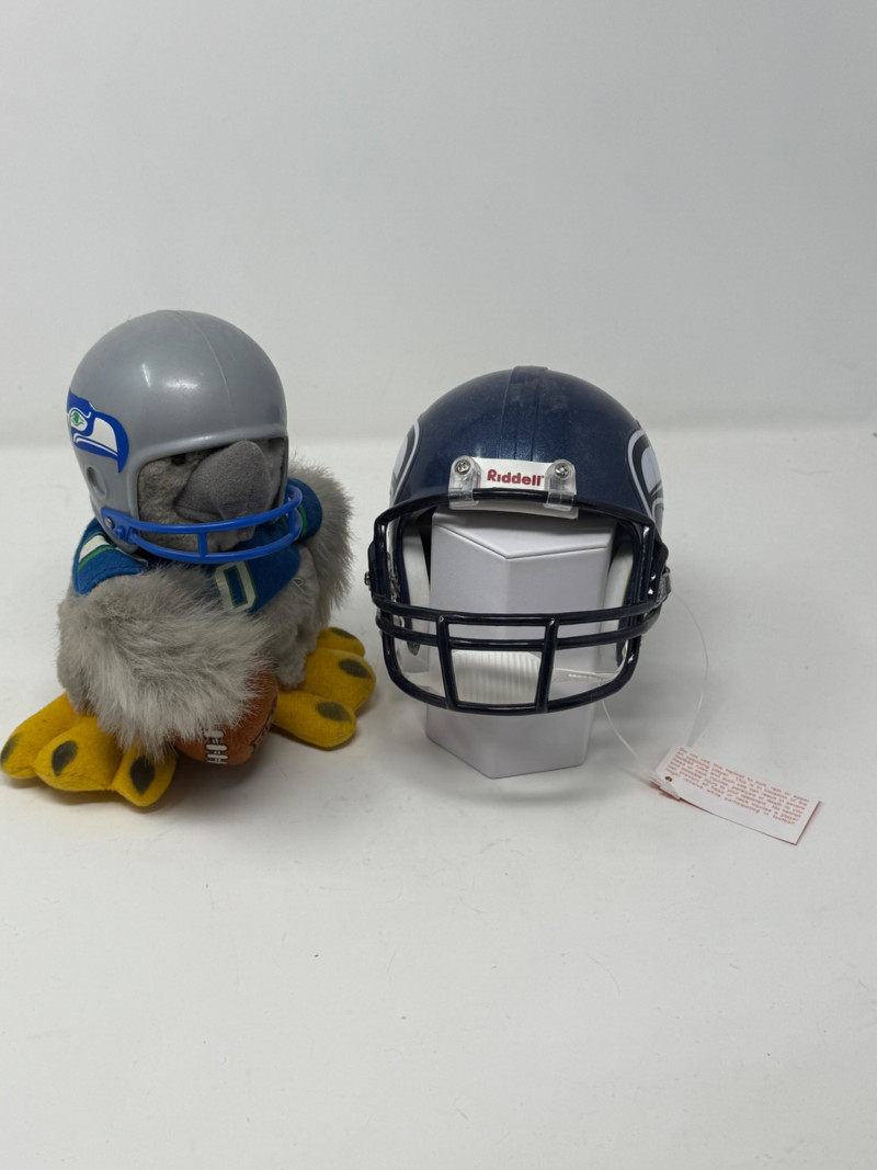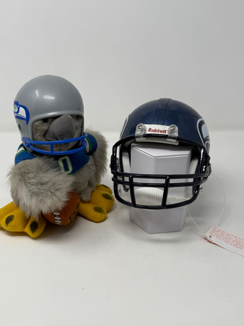 Seattle Seahawks Collectibles –1983 Mascot Plush & Riddell Mini Helmet Celebrate your love for the Seahawks with this fun collectible duo! Includes a vintage plush mascot dressed in Seahawks gear, complete with helmet and football, alongside an official Riddell mini helmet. Perfect for fans, collectors, or sports-themed décor. Gently used and in great condition. Measurments: Range from 8"H x 5"W to 15"H x 8"W