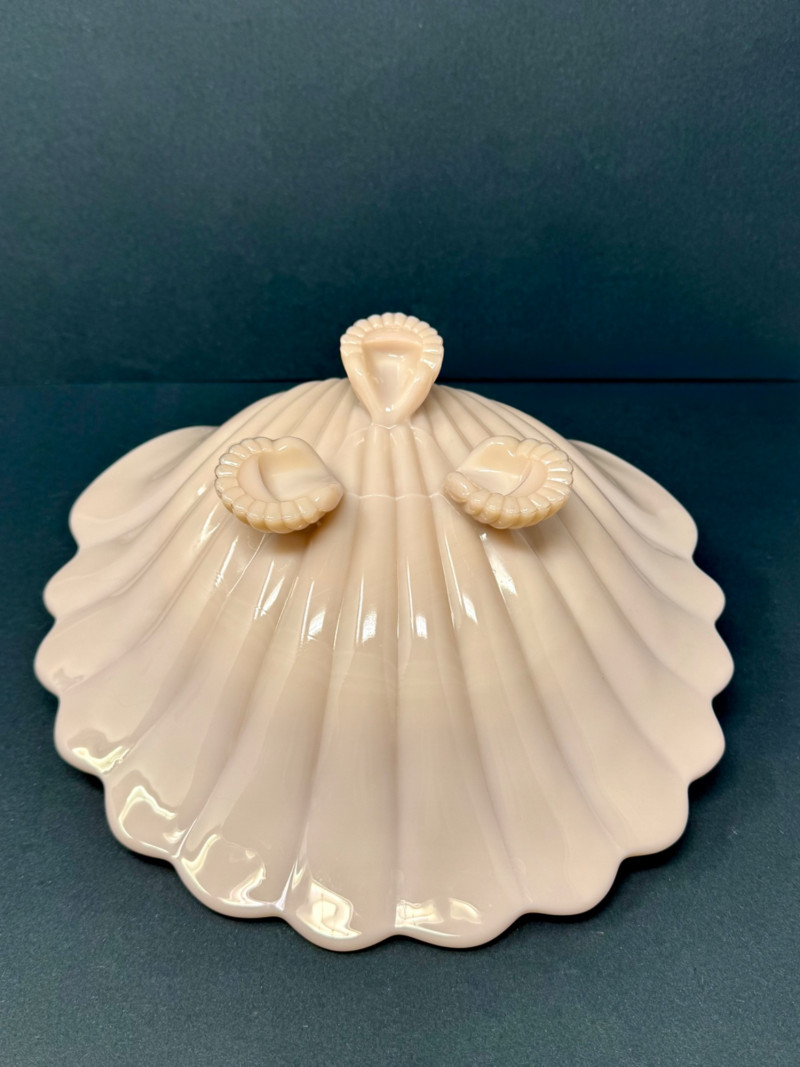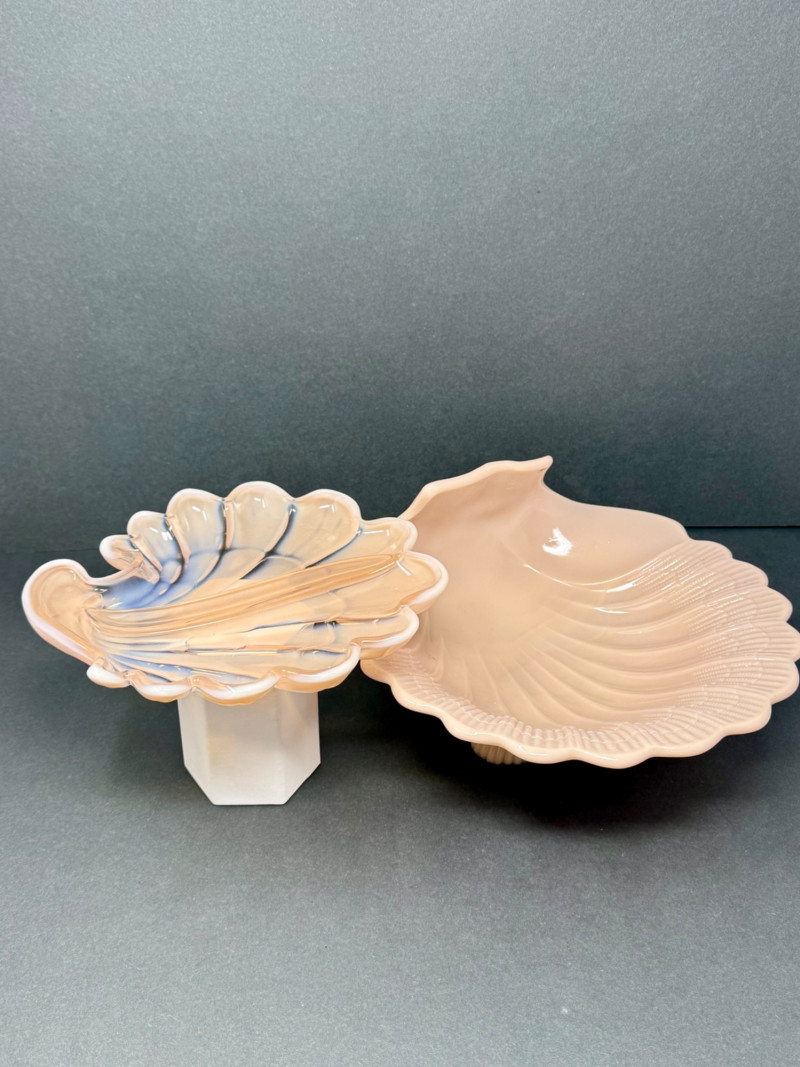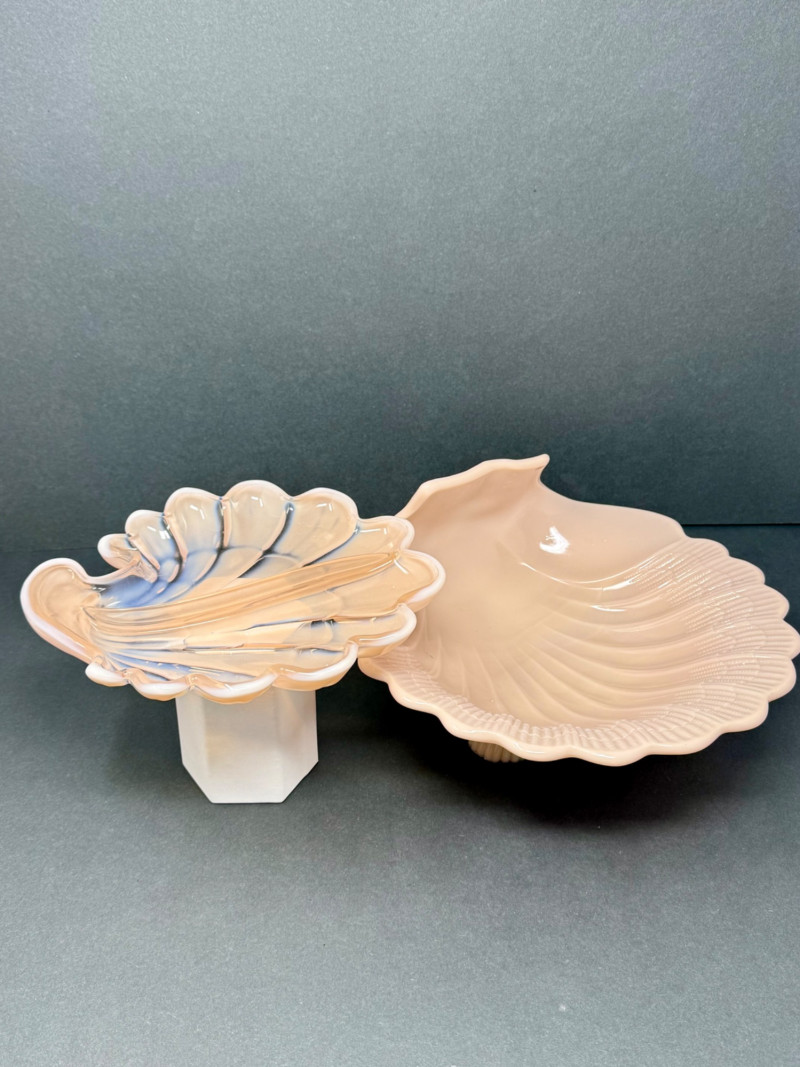 Vintage Shell-Shaped Ceramic Dishes – Iridescent & Matte Pink Set Elevate your coastal or vintage décor with this charming pair of shell-shaped ceramic dishes. The set includes: Measures: 9"W x 1"H 10"W x 6"H