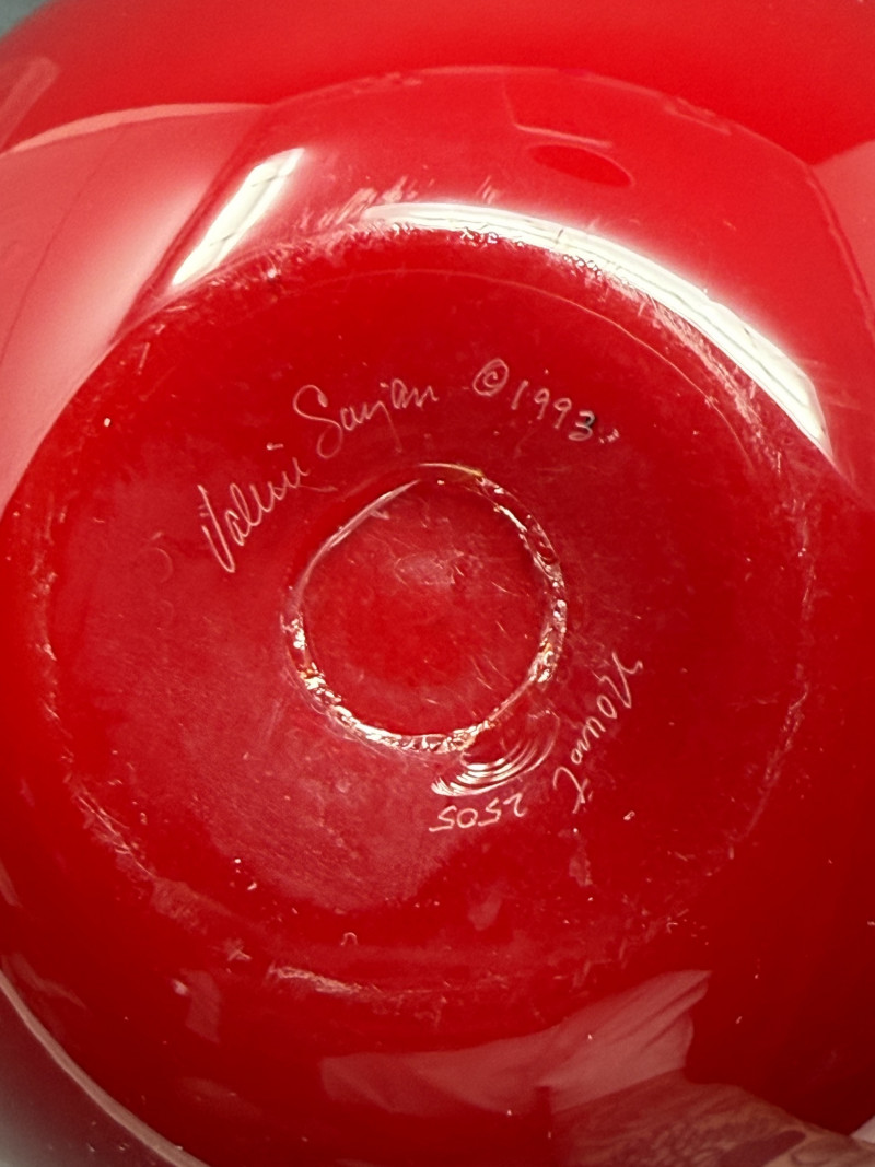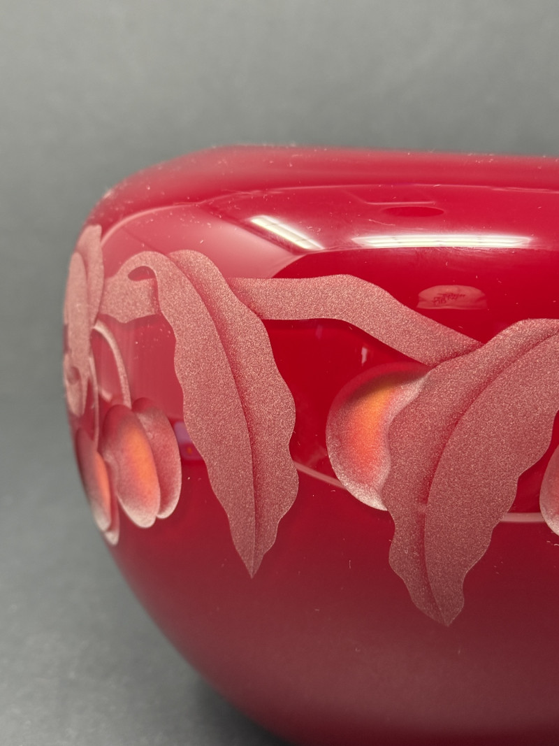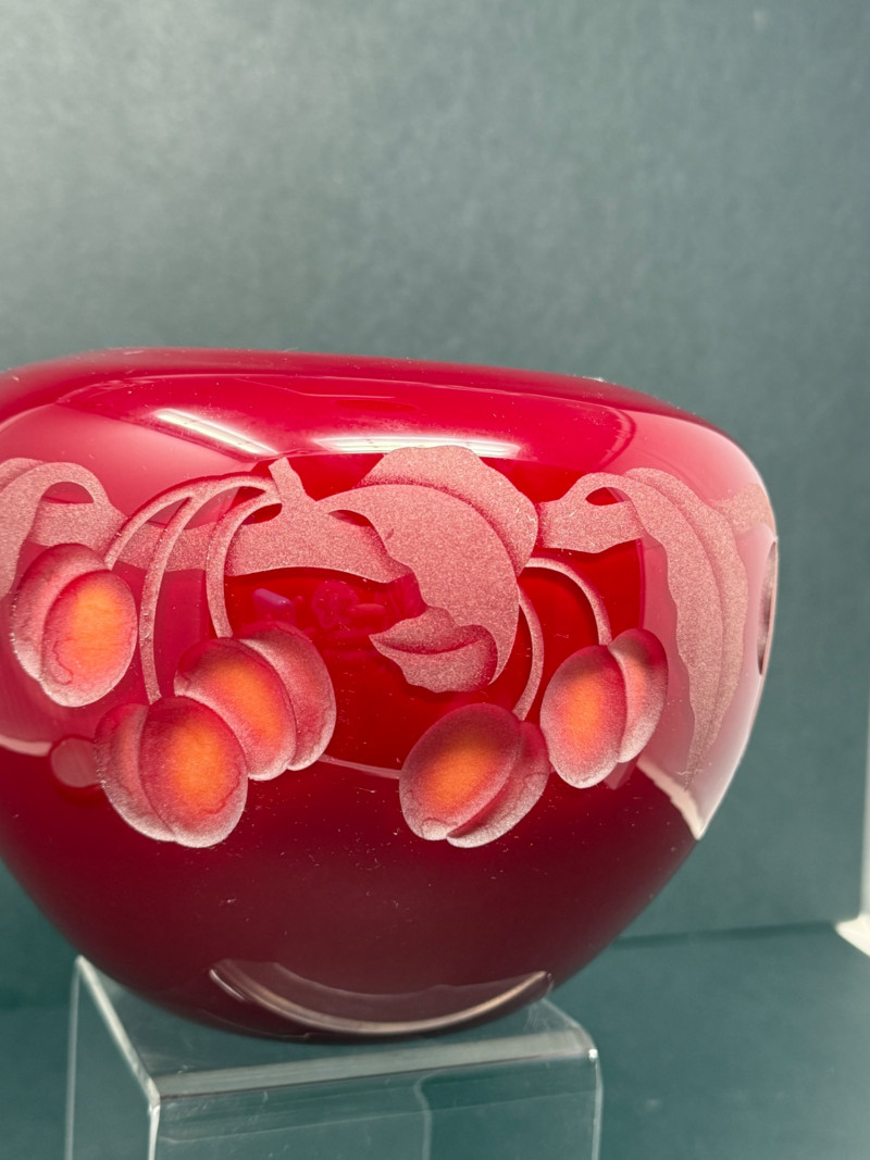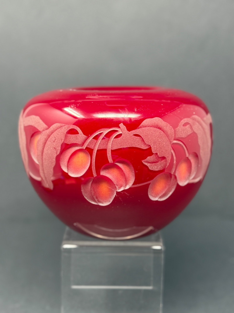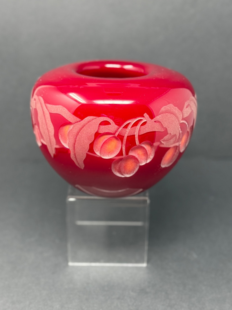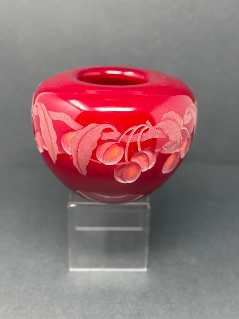 Valerie Surjan Signed Cameo Art Glass Vase – 1993 Peach Motif This exquisite signed art glass vase by Valerie Surjan (1993) features a stunning cameo glass design in rich ruby red with a soft satin finish. Etched in delicate detail, the piece showcases a beautiful peach and leaf motif in frosted pinks and oranges, giving it a warm, organic elegance.