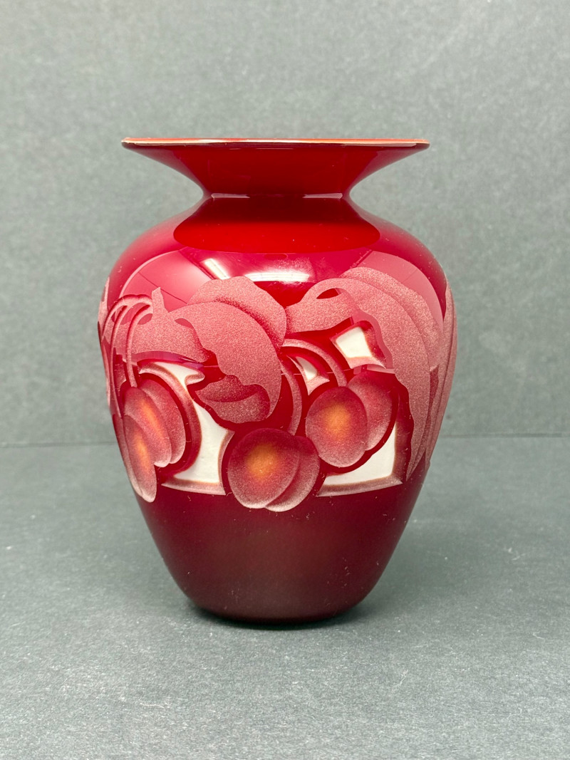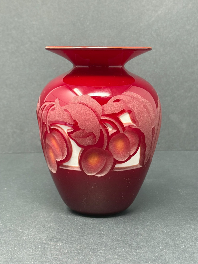 Valerie Surjan Signed Cameo Art Glass Vase – 1993 Ruby Red with Peaches A stunning and substantial cameo glass vase by Valerie Surjan, dated 1993. This handcrafted studio piece showcases deep ruby red cased glass, intricately acid-etched with a bold peach and leaf motif in layered pink and orange tones. The high-gloss upper body contrasts beautifully with the frosted lower finish, highlighting the dimensional artistry