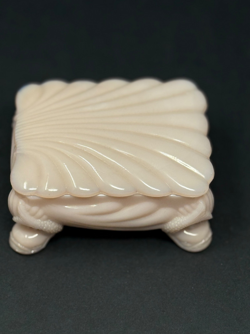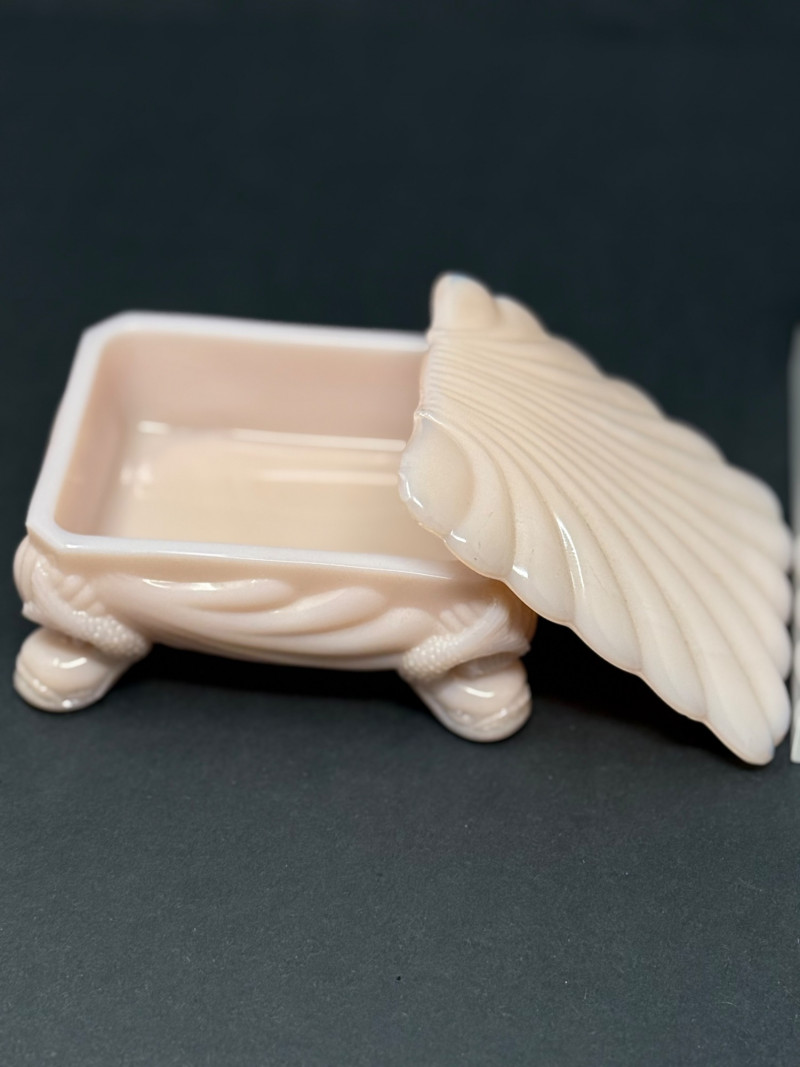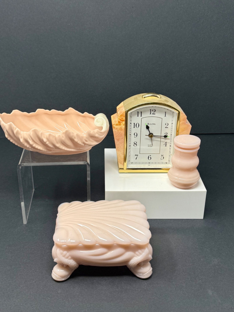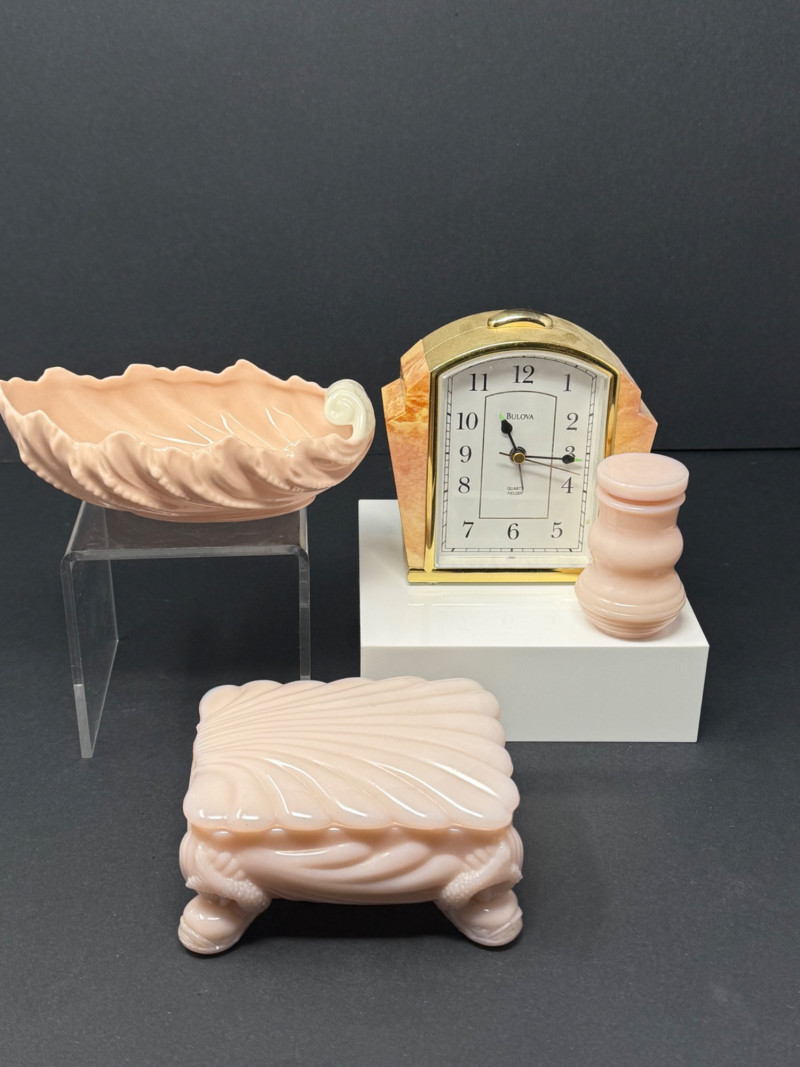 Lot of 4 Vintage Pink Depression Glass & Onyx Decor Pieces – Vanity & Display Set This elegant collection includes four vintage decorative pieces in soft pastel pink tones—perfect for vanity displays, feminine spaces, or Depression glass collectors. A mix of vintage glass and stoneware, this lot brings together creamy textures, shell motifs, and classic charm.