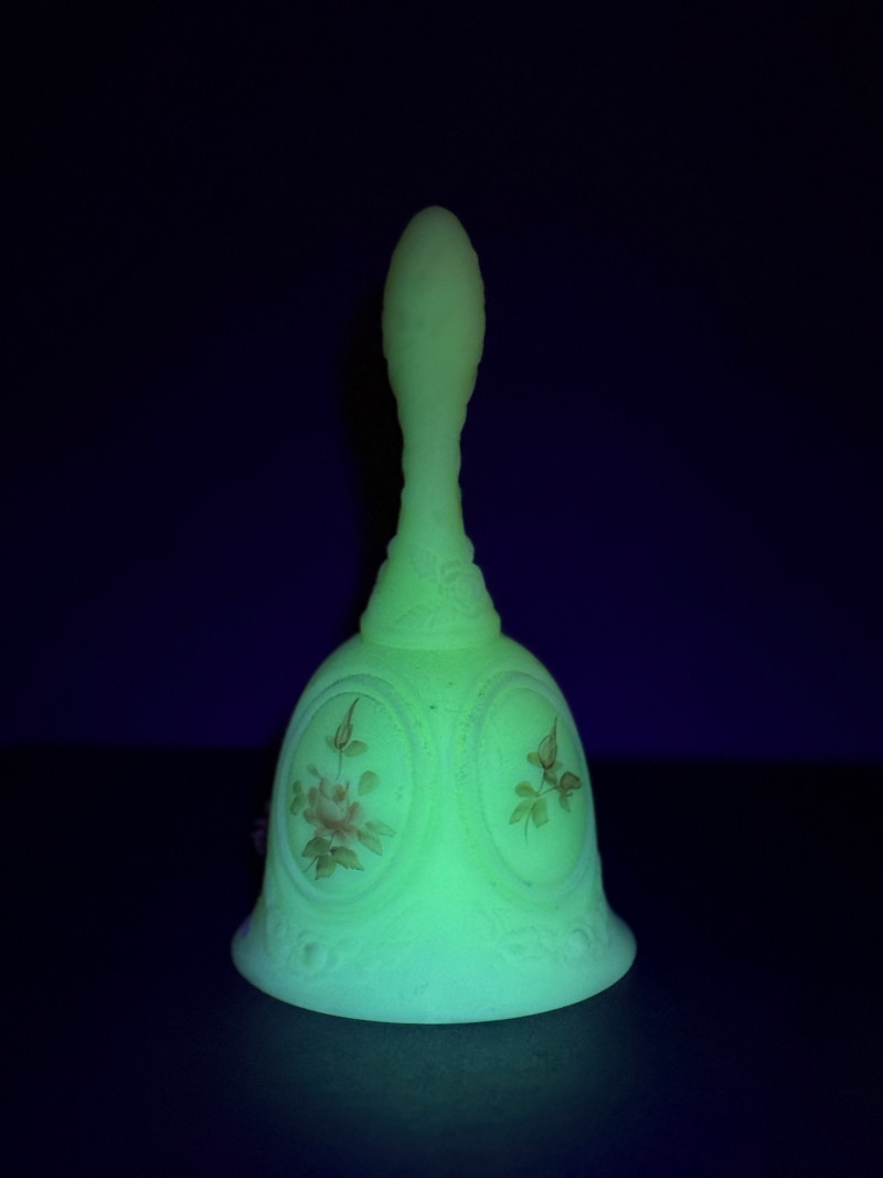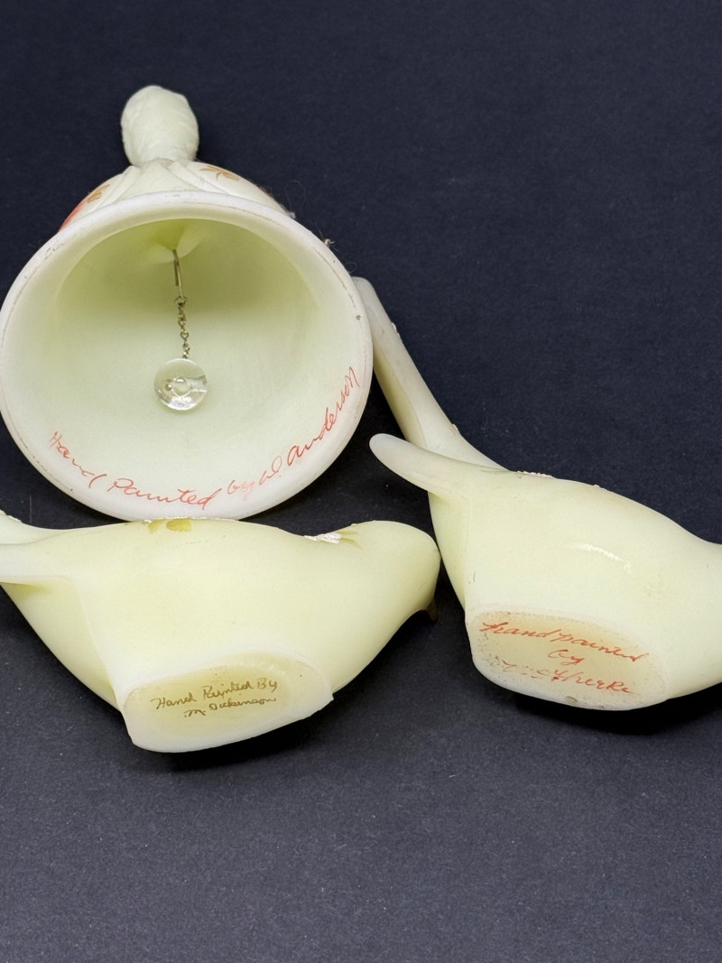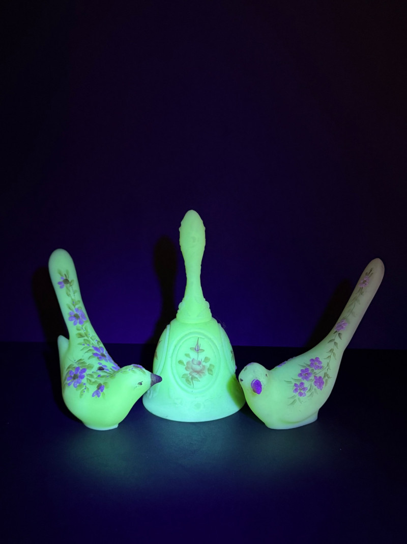 Fenton Uranium Custard Satin Glass Set – 2 Birds & Bell – Hand-Painted Floral – Glows Under UV Light This charming Fenton Art Glass trio includes two satin custard glass birds and a matching bell, each hand-painted with delicate purple floral motifs. Made from uranium custard glass, the set glows vibrantly under blacklight, making it a collector favorite for both its artistry and luminous properties. Set Includes: