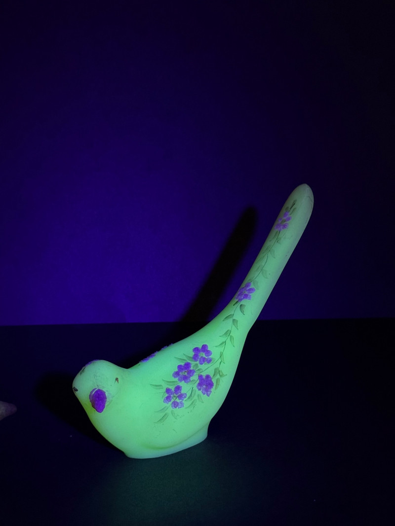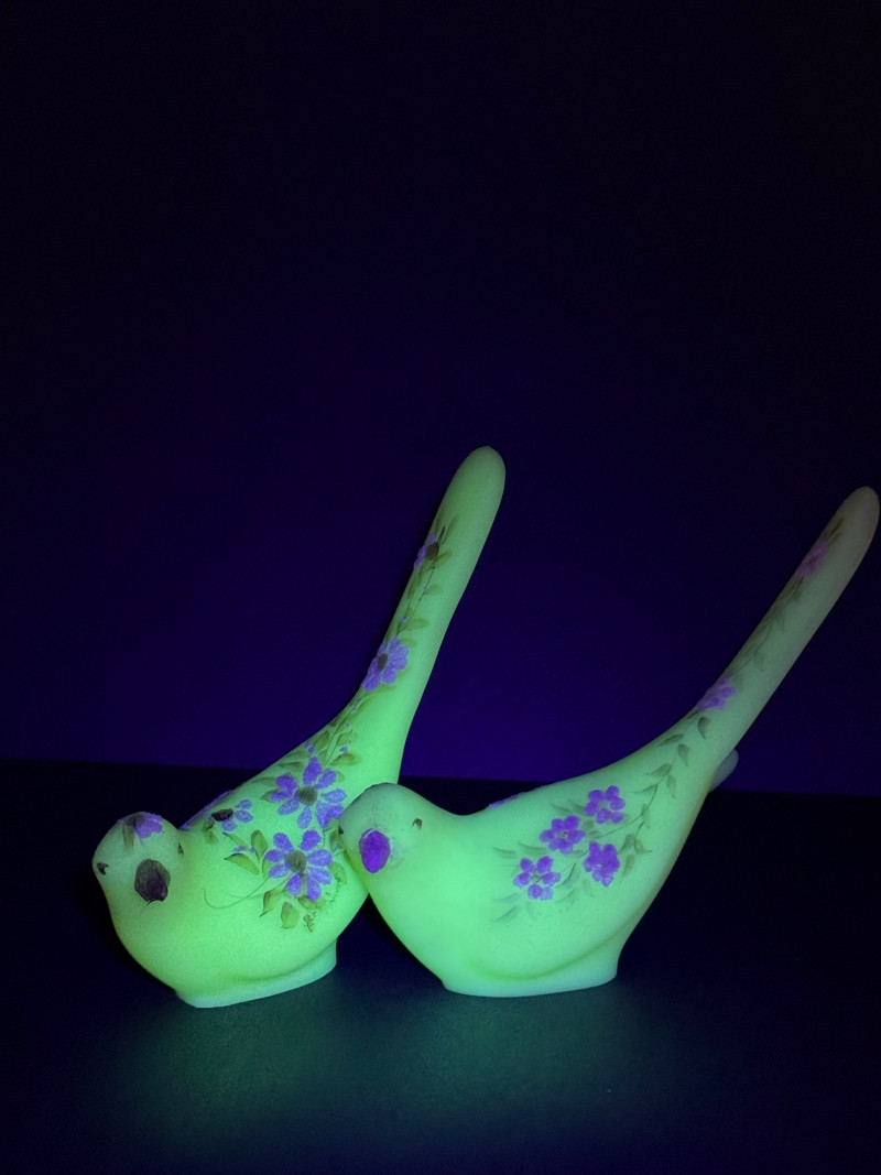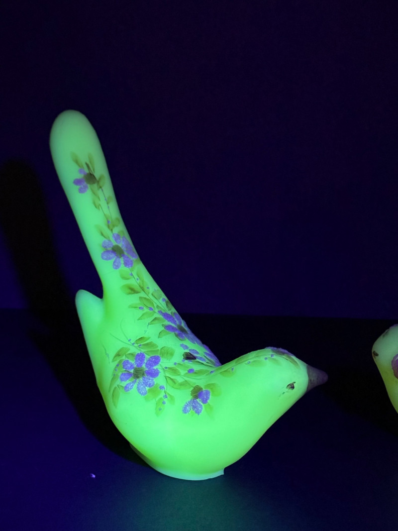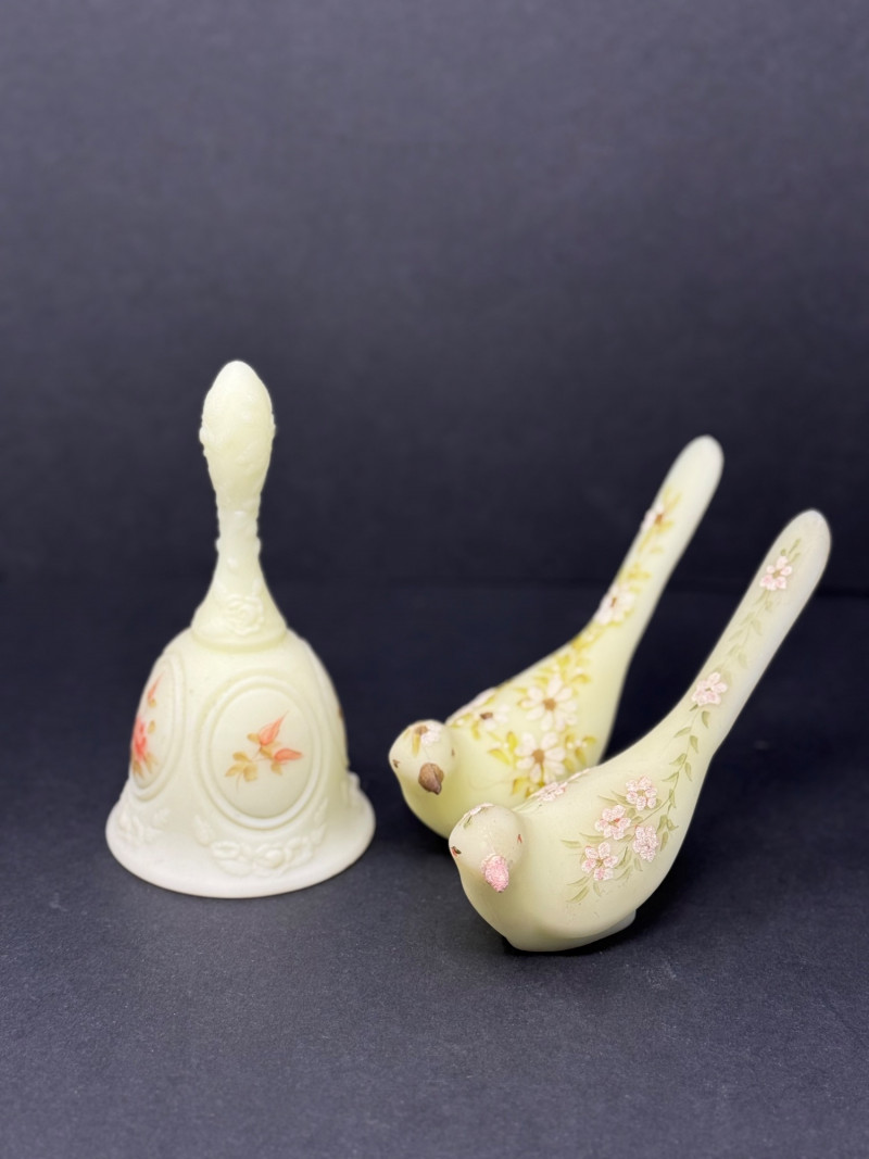 A lovely collectible set for fans of uranium glass, Fenton birds, or vintage hand-painted decor.