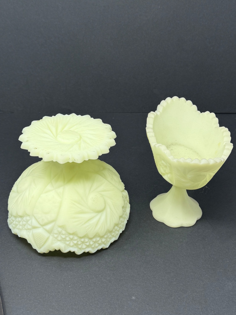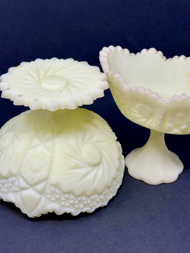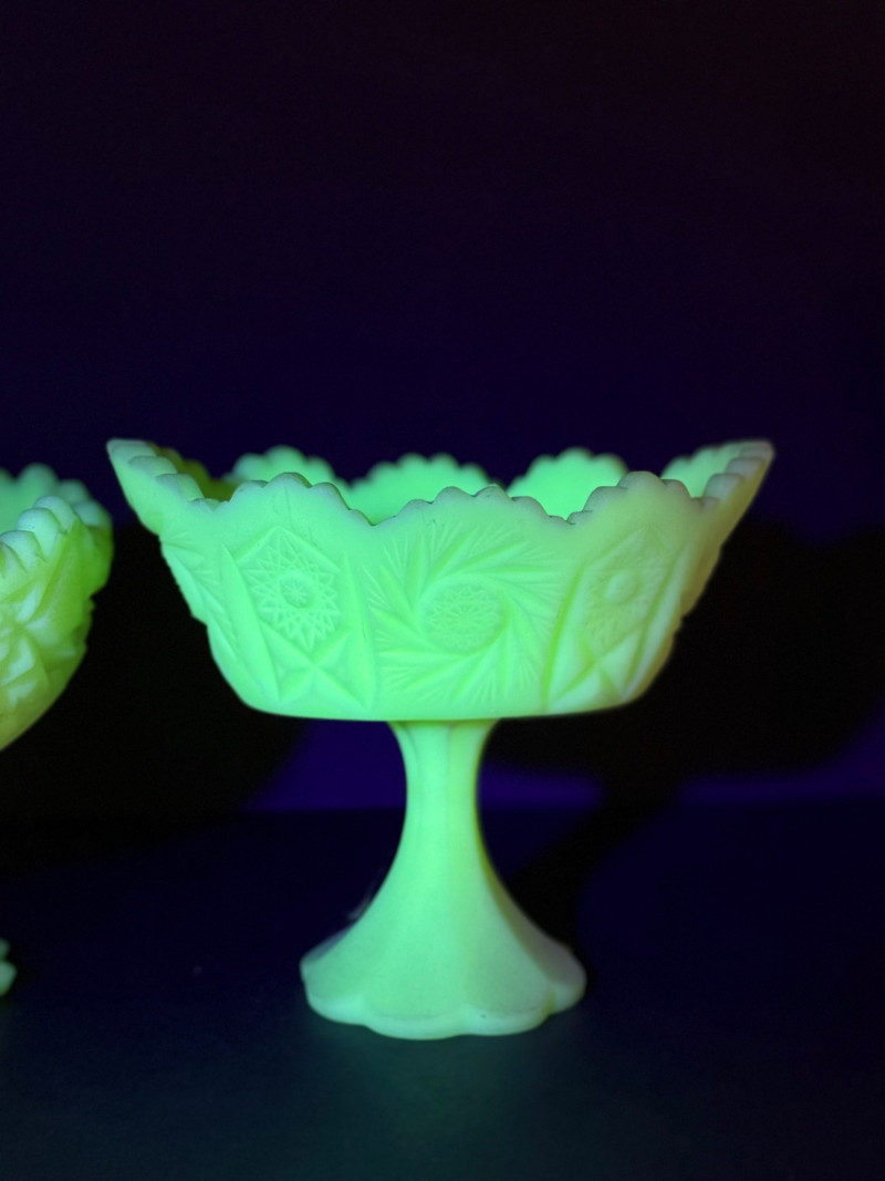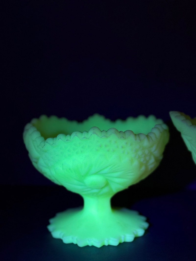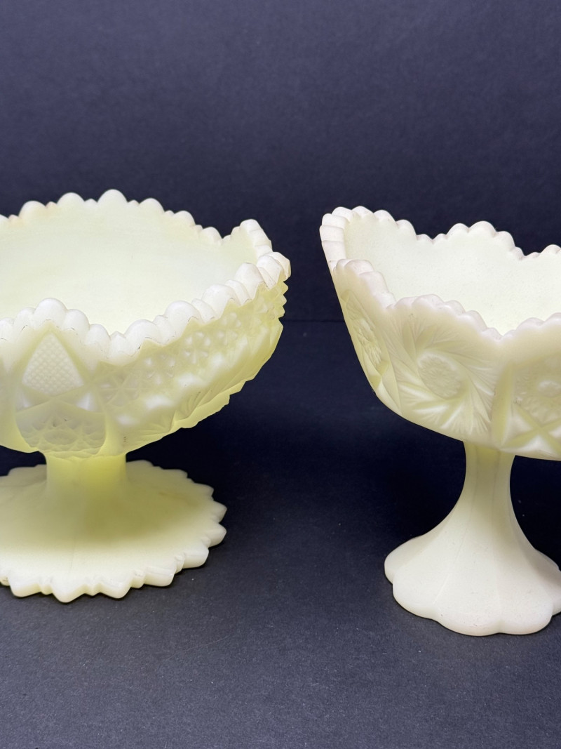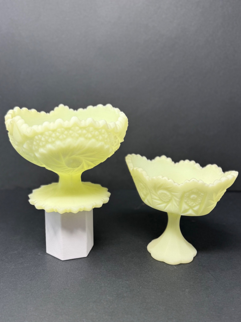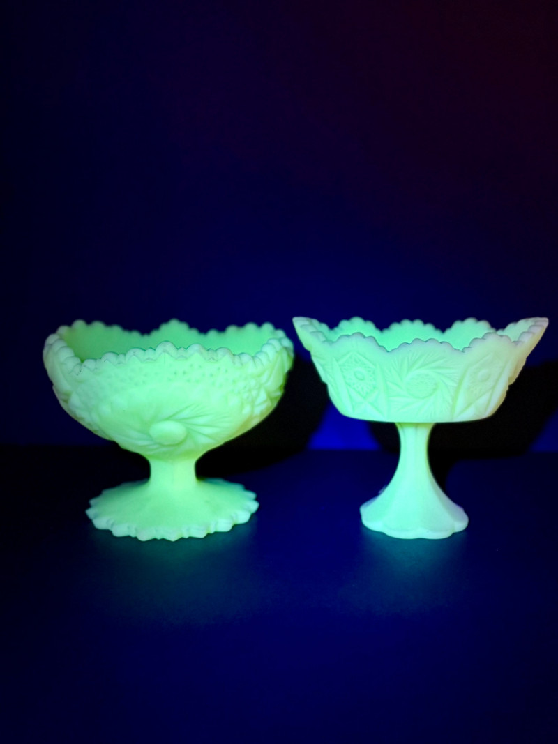 2 Fenton Uranium Custard Satin Glass Compotes – Glows Under UV Light This glowing duo features two elegant custard satin uranium glass compotes by Fenton Art Glass, each with a unique pattern and radiant UV-reactive glow. Beautifully crafted with scalloped edges and pressed patterns, these pedestal dishes are ideal for display, candy, or trinkets—and they shine in any blacklight collection. Included: