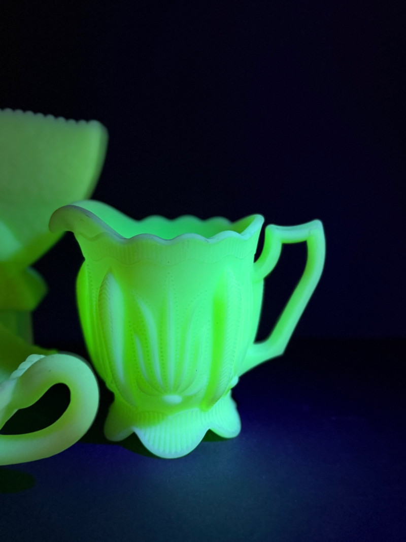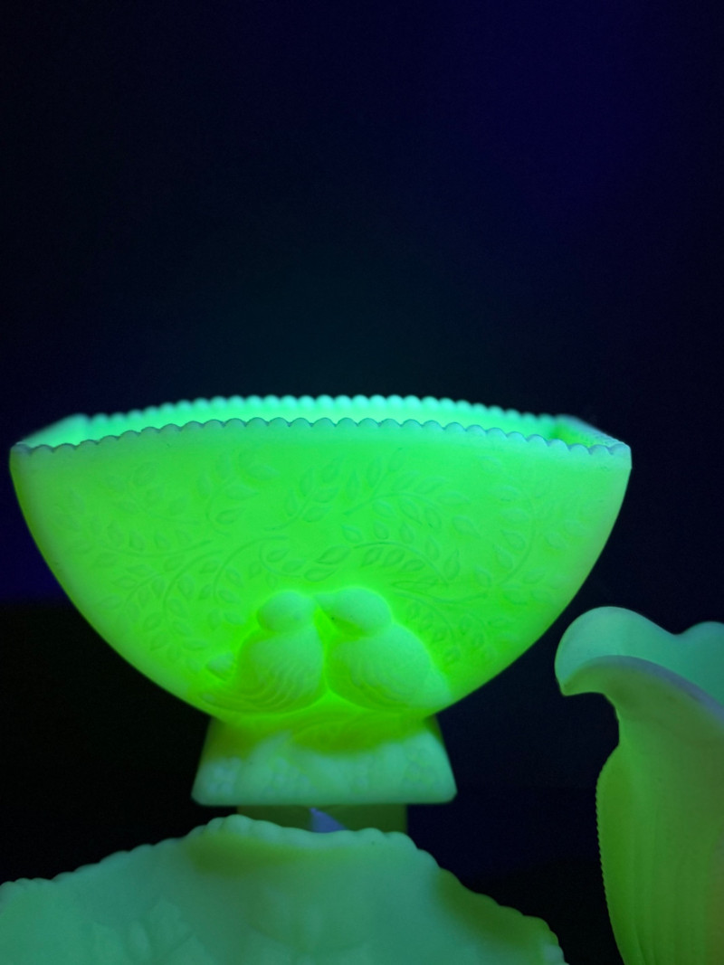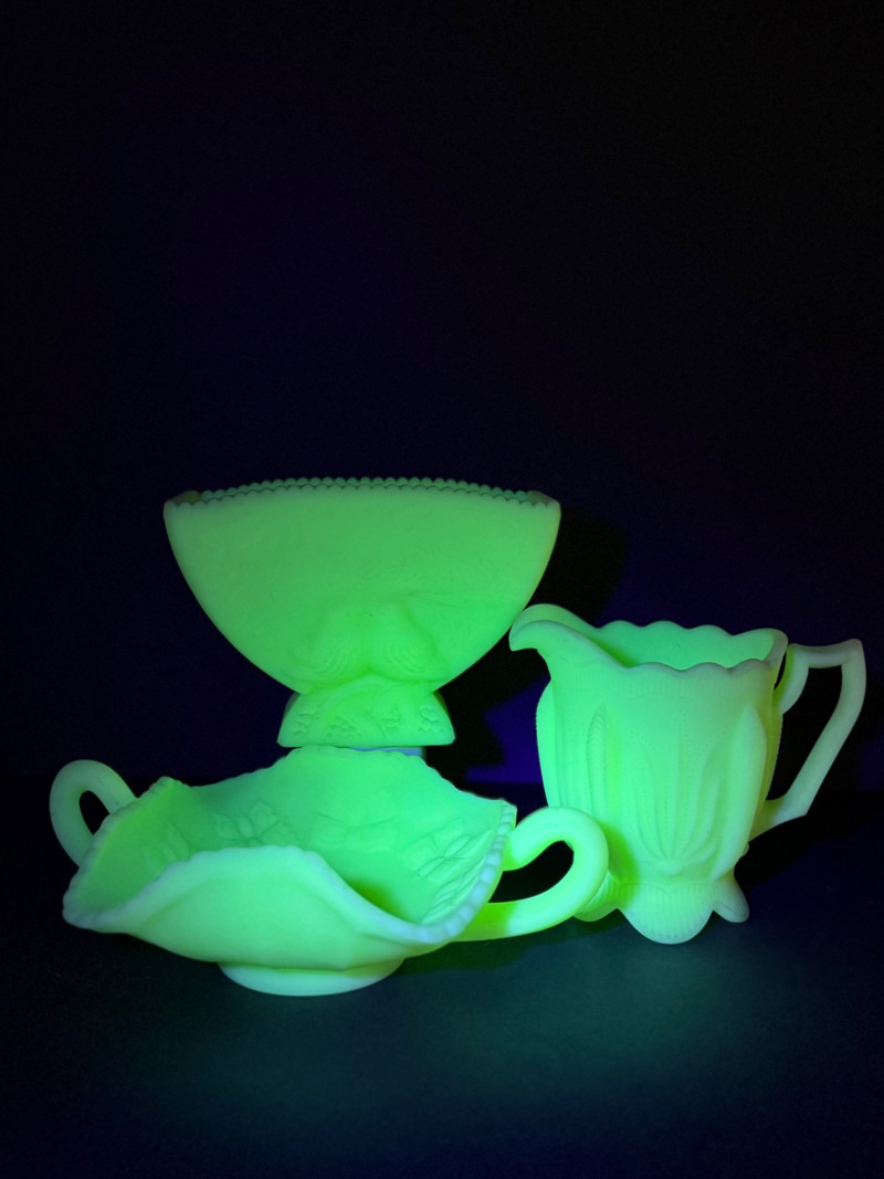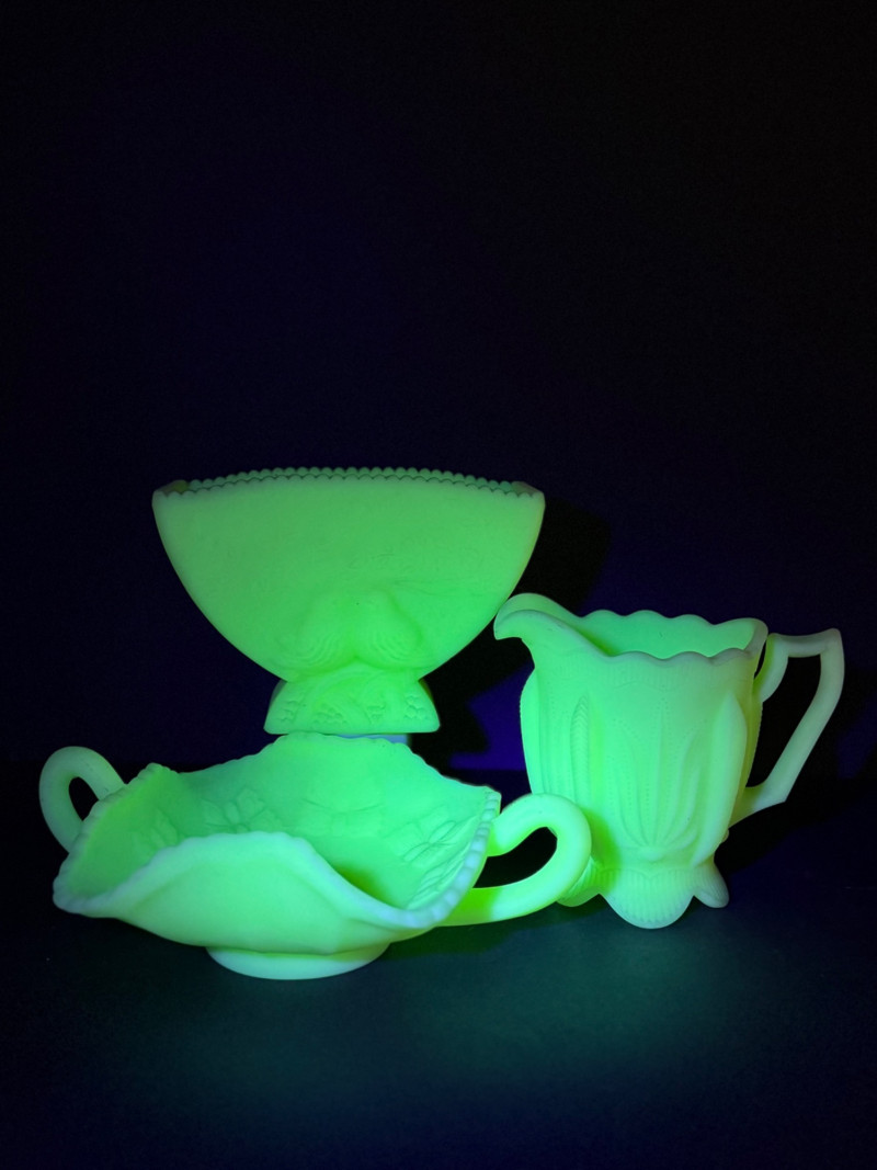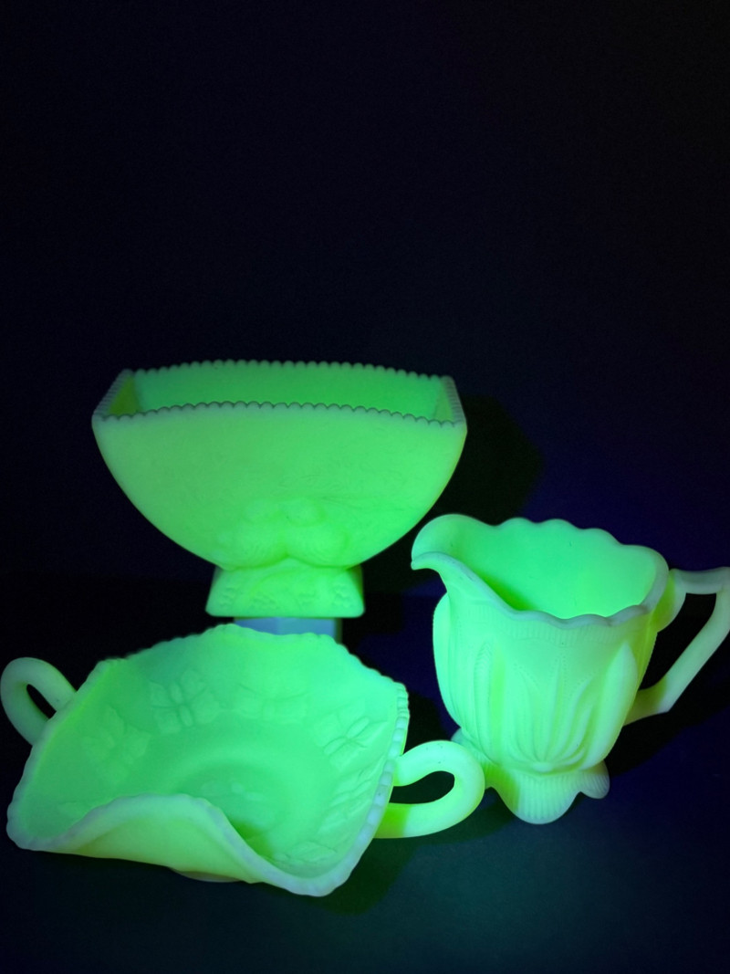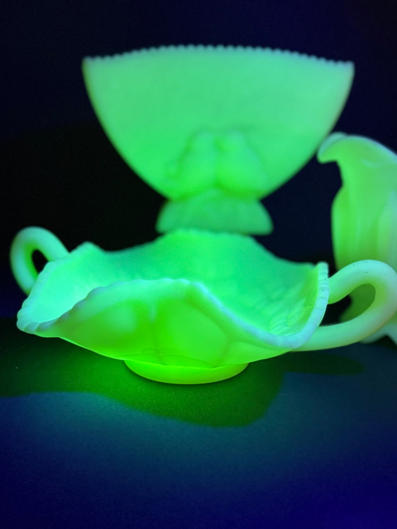 Lot # 37 - Fenton Uranium Glass Set – Creamer, Bowl & Compote with UV Glow