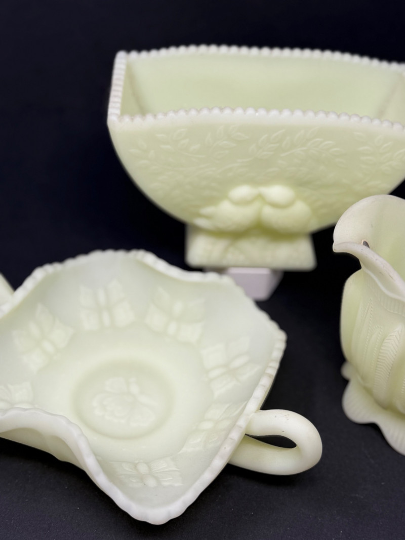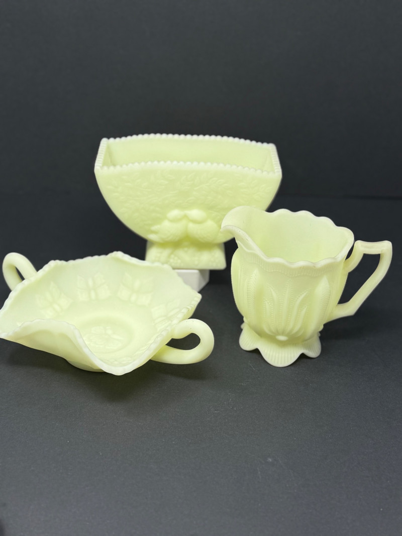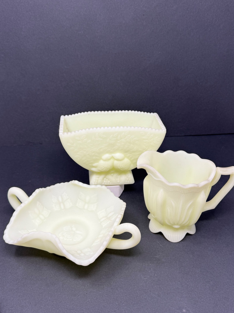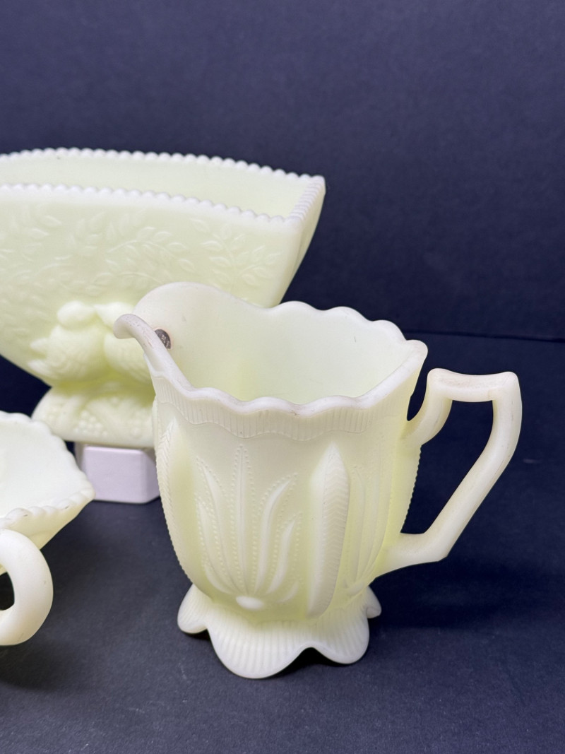 Fenton Custard Satin Uranium Glass – Creamer, Bowl & Compote – Glows Under UV Light (Lot of 3) This elegant trio of Fenton Art Glass pieces is made from classic custard satin uranium glass, which glows vibrantly under blacklight. Each piece showcases distinct pressed patterns and soft matte finishes, making them a gorgeous addition to any styled surface. Includes: Footed Compote with Bows & Ribbons Pattern Scalloped edge and raised detailing Approx. 5.25" tall x 5.75" wide Handled Bowl with Ruffled Edge Embossed floral and bow motif Approx. 2.75" tall x 6.5" wide (handle to handle) Creamer with Scalloped Rim Gently ribbed design with flared foot Approx. 4" tall x 4.5" wide (including handle) Brand: Fenton Art Glass Color: Custard yellow (uranium glass) Finish: Satin Glow: Bright fluorescent green under UV light Condition: All pieces in excellent condition with no chips, cracks, or repairs A soft and timeless set that brings warmth by day and a dramatic glow by night.