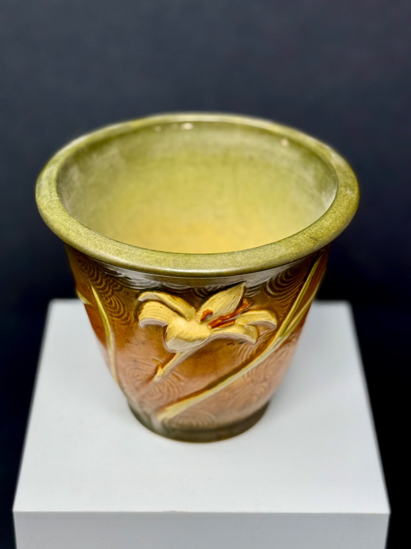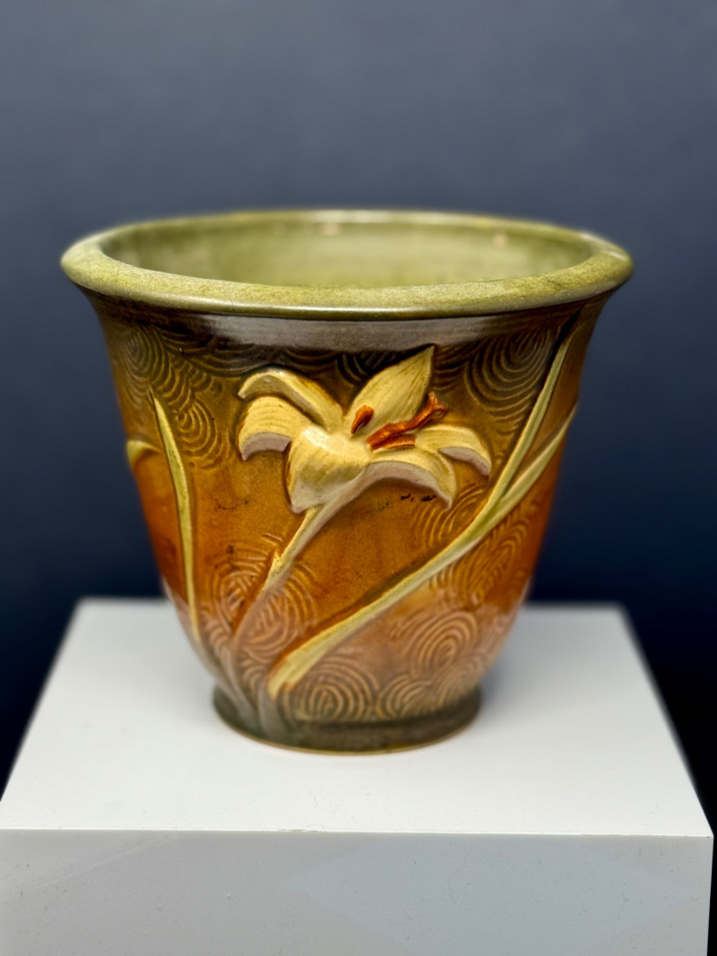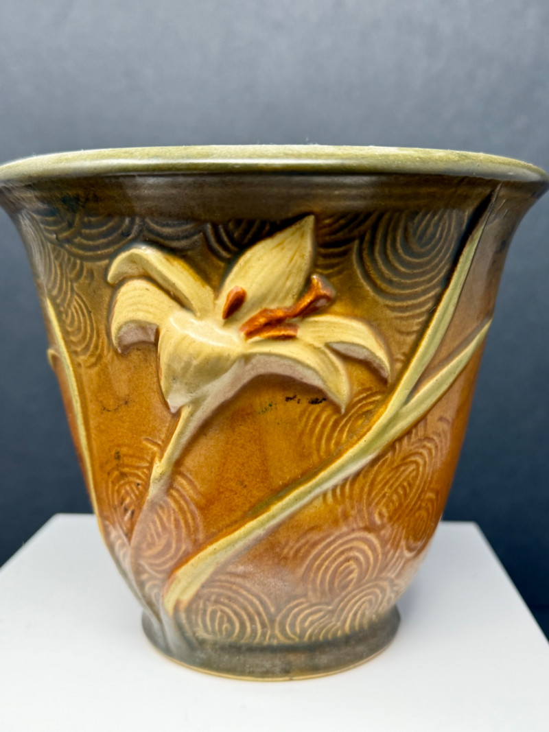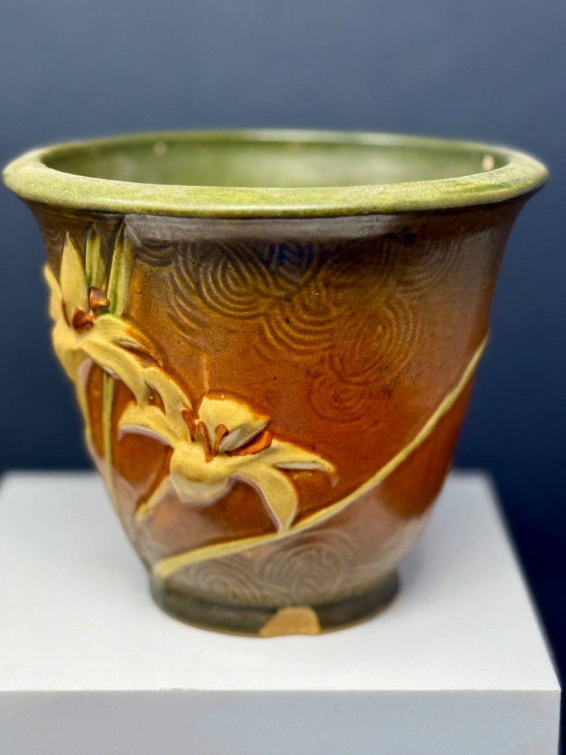 Vintage Roseville Art Pottery Vase – Freesia Pattern – Brown & Green Glaze – c. 1945 This beautiful Roseville Art Pottery vase features the elegant Freesia pattern, introduced in the mid-1940s. The design showcases a sculpted ivory lily in full bloom, set against a rich brown glaze that softly transitions to olive green at the rim. Swirling textures beneath the floral motif add movement and depth to this classic mid-century piece. Brand: Roseville Pottery Pattern: Freesia Produced: Circa 1945, Ohio, USA Color: Brown with olive green interior and sculpted ivory floral design Material: Glazed ceramic Dimensions: Approx. 5.25" tall x 5.5" wide at rim Condition: Has a few small chips, but in great condition for its age. Displays beautifully. About Roseville Pottery: A wonderful example of American pottery history—timeless and beautifully aged.