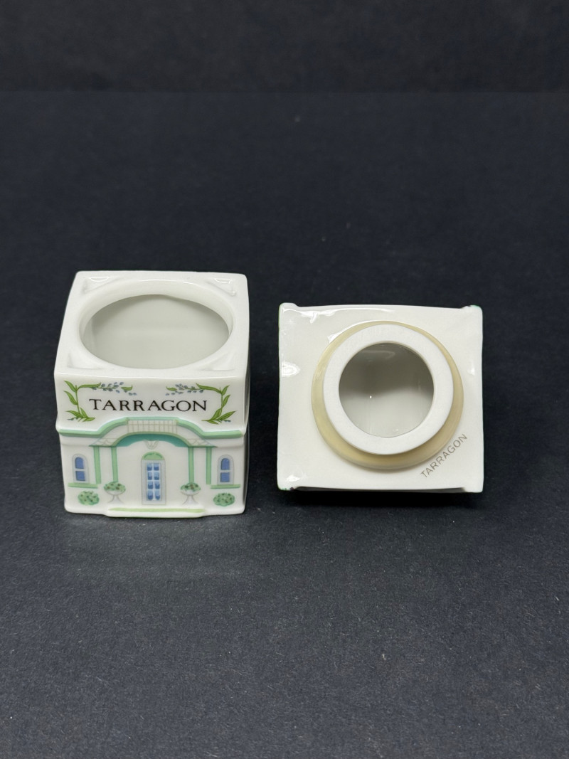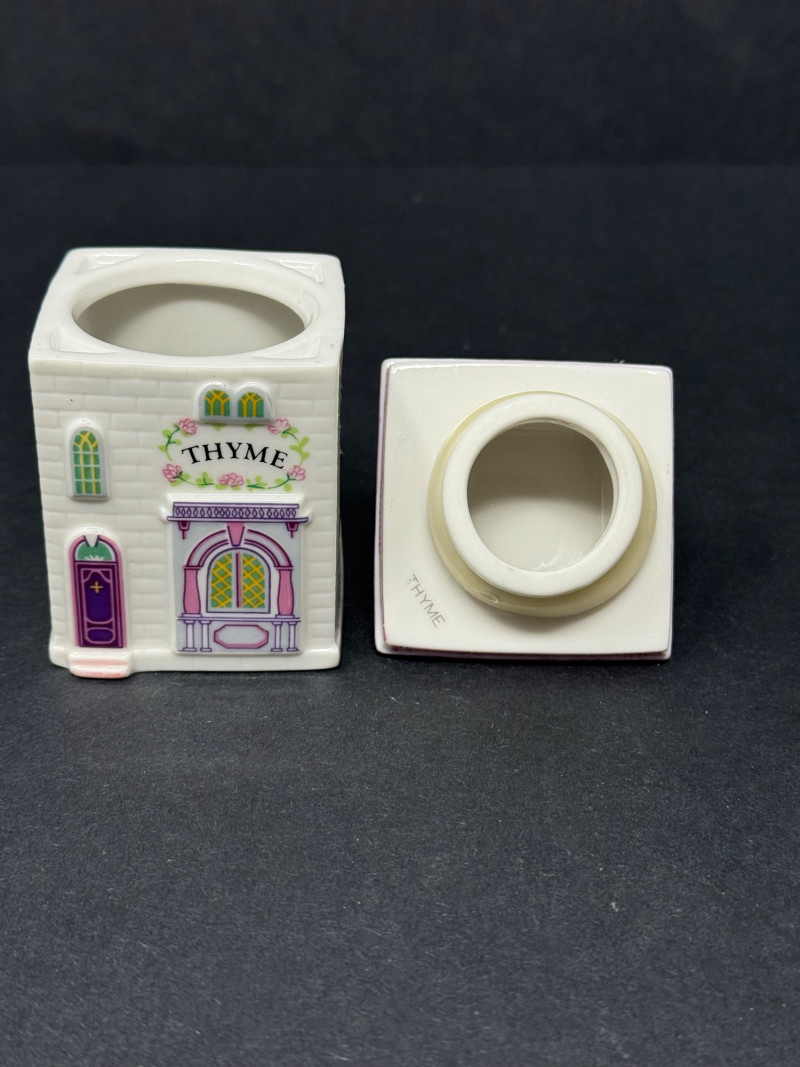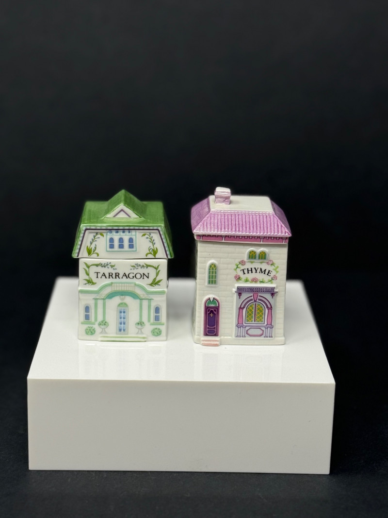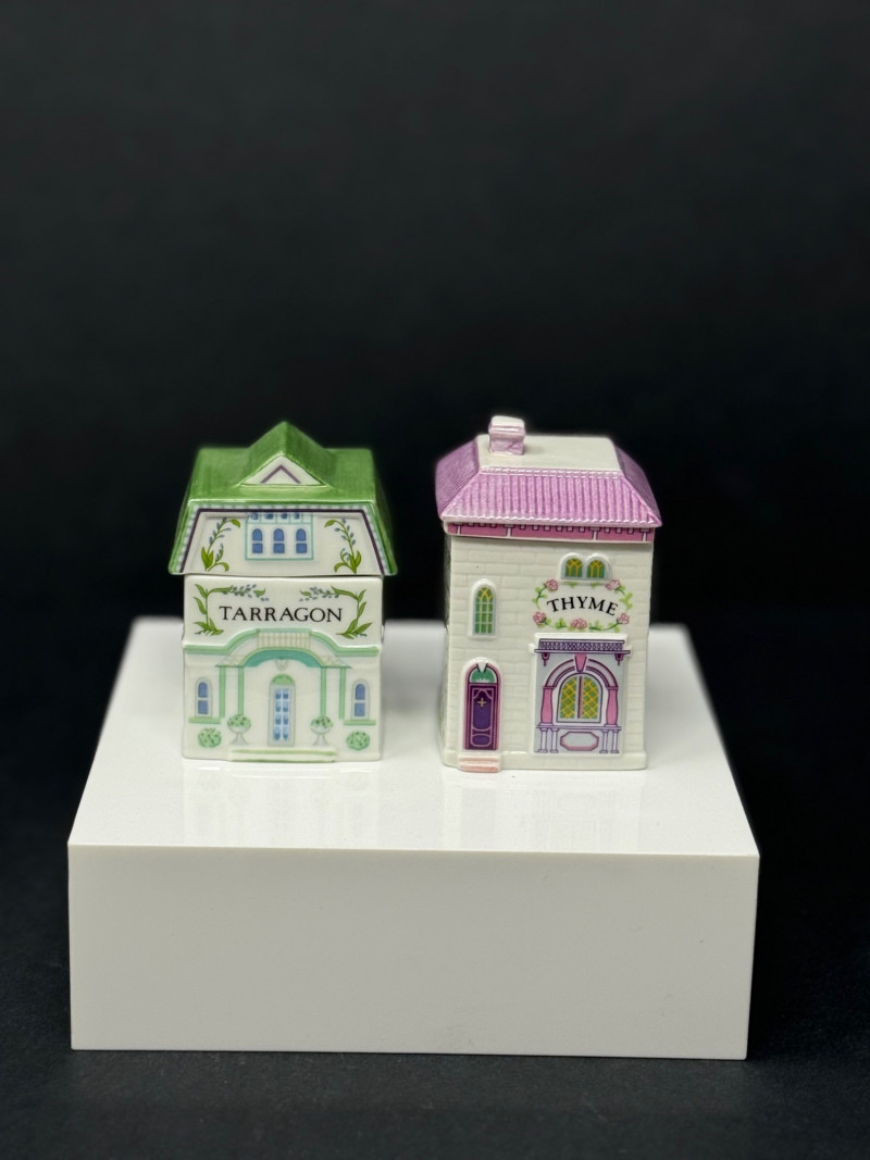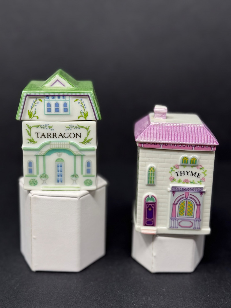Lenox Village Spice Jar Set – Tarragon & Thyme Ceramic Houses – 1990s, Rare & Collectible This adorable pair of Lenox Village spice jars features miniature ceramic buildings labeled "Tarragon" and "Thyme", part of the highly collectible Lenox Village Collection from the 1990s. Designed like charming storefronts with delicate detailing and pastel colors, these jars add both personality and function to any kitchen shelf or spice rack. Brand: Lenox Collection: Lenox Village Year: Circa 1990s Labels: Tarragon & Thyme Material: Glazed ceramic Size: Approx. 3.25"–3.75" tall Condition: Excellent vintage condition with no chips, cracks, or fading These spice jars are increasingly rare and especially desirable among collectors looking to complete their Lenox ceramic village sets. Perfect for a cottagecore kitchen, vintage herb display, or thoughtful gift for a tea or cooking enthusiast.