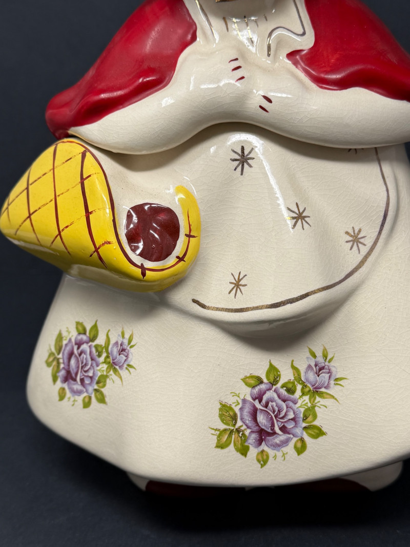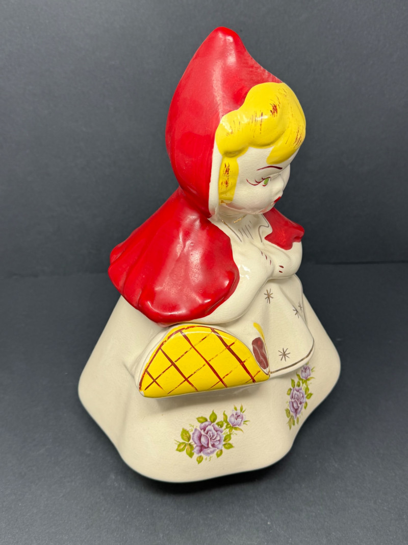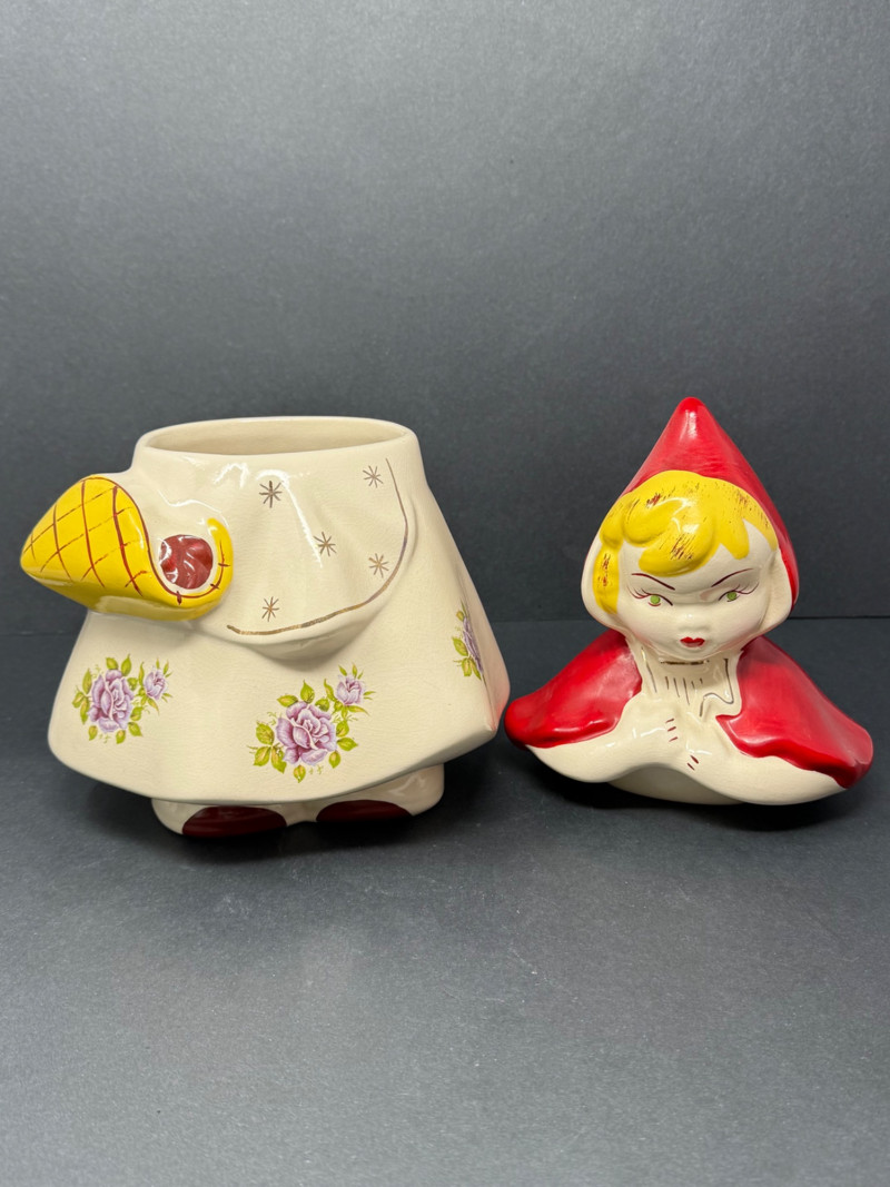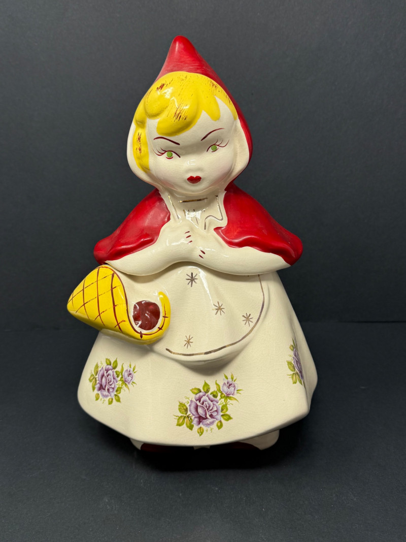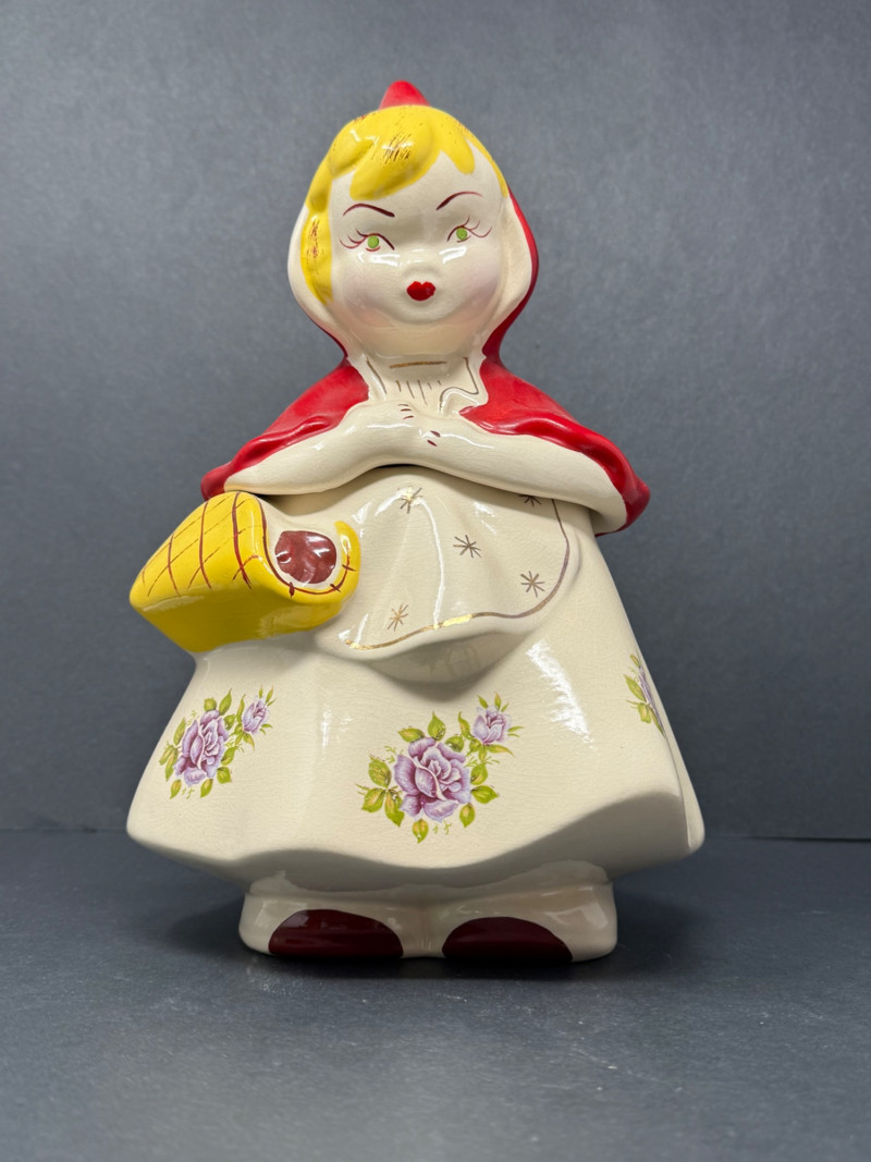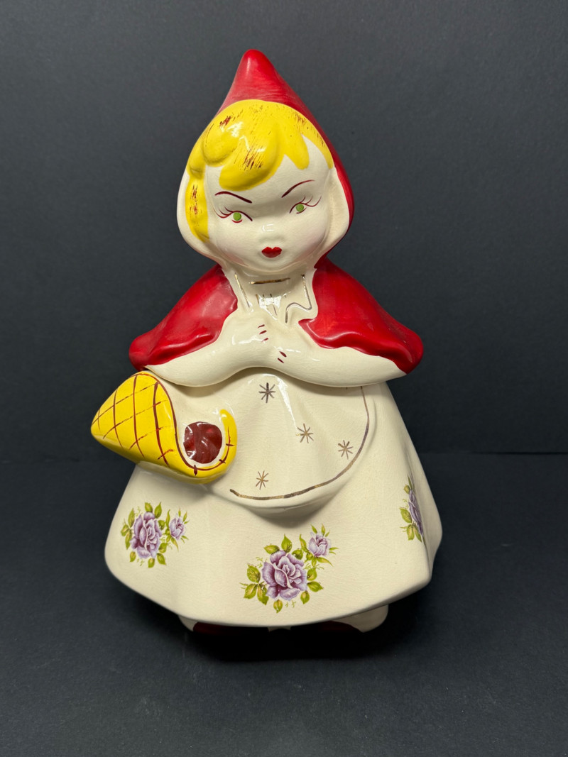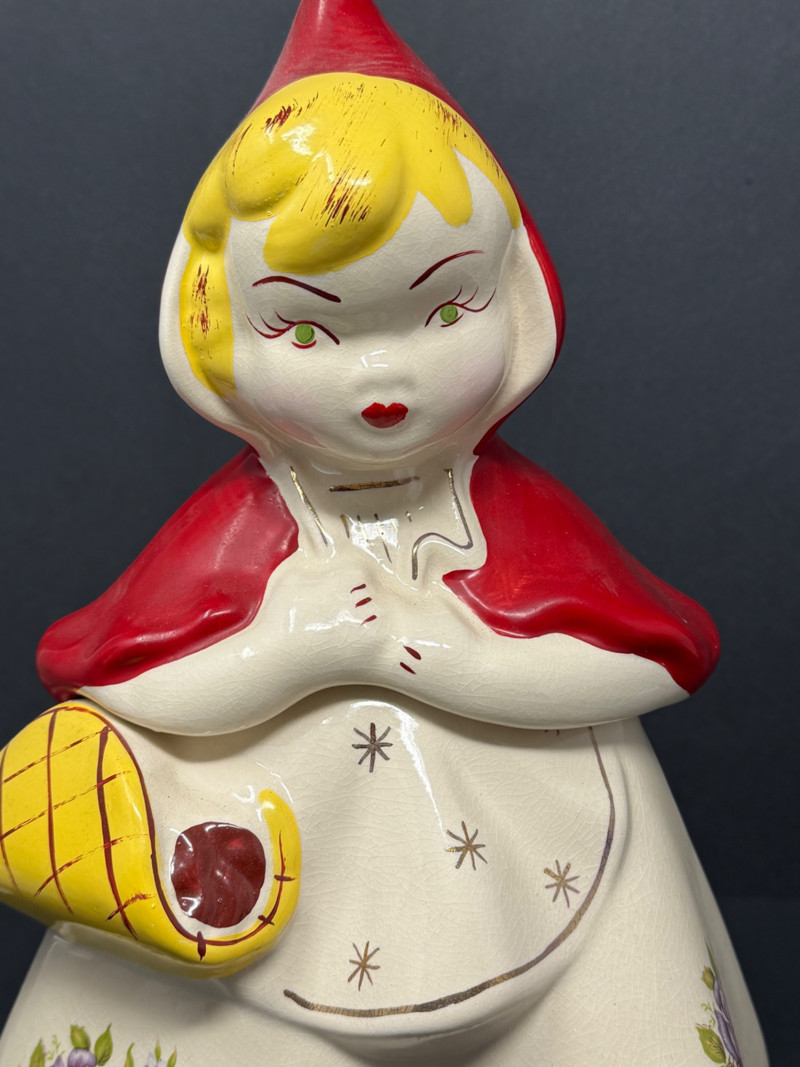 Vintage American Bisque Little Red Riding Hood Cookie Jar – 1940s–50s – Rare Hand-Painted This delightful Little Red Riding Hood cookie jar was made by American Bisque in the 1940s–1950s, a standout example of whimsical mid-century ceramic kitchenware. Featuring vivid hand-painted details—like the red cape, cherry basket, and floral skirt—this jar combines storybook charm with classic retro flair. Maker: American Bisque Era: Circa 1940s–1950s Material: Hand-painted ceramic Design: Little Red Riding Hood with cherries and rose details Height: Approx. 10.5" tall Condition: Great vintage condition with light crazing typical for age. No major chips or cracks noted. Why it’s special: