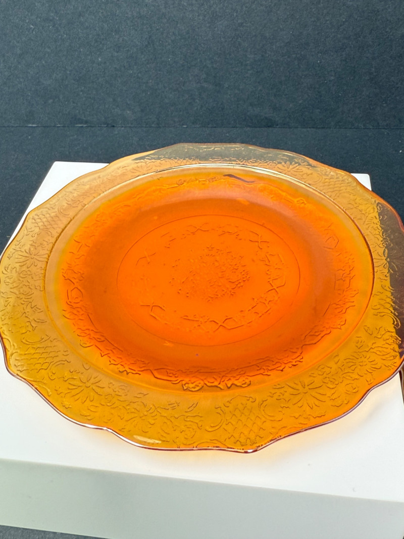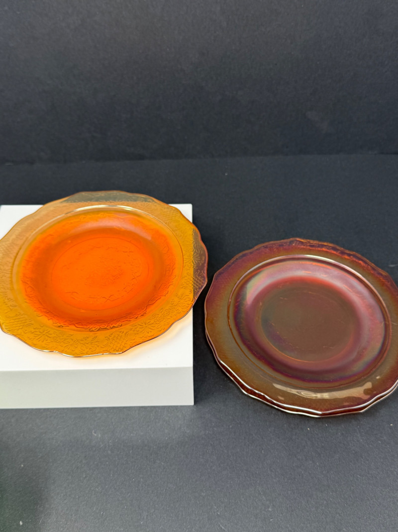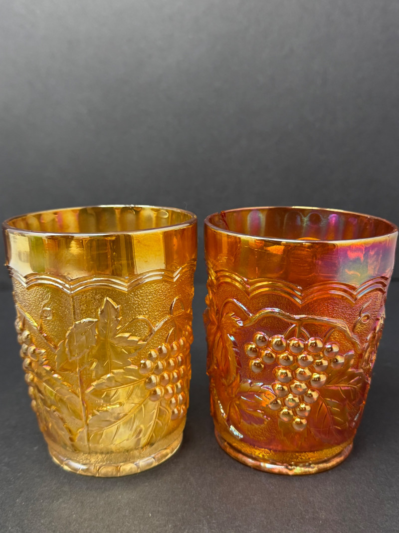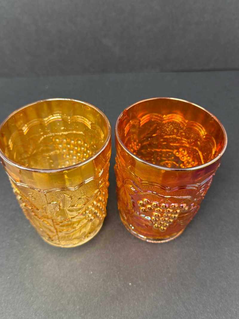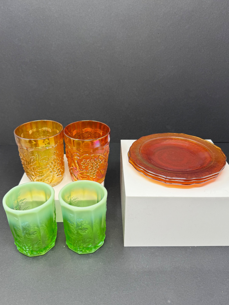 Vintage Carnival & Vaseline Glass Tumblers + Plates – Embossed Grape Motif This vibrant collection of vintage glassware showcases a stunning range of color and texture, perfect for collectors or retro table styling. The set includes two richly iridescent carnival glass tumblers in amber and marigold tones, alongside two glowing vaseline/uranium glass tumblers in a striking green gradient, all embossed with a detailed grapevine motif. Also included are three vintage amber carnival glass plates with scalloped edges and a radiant finish. Glass Type 1: Carnival glass tumblers (2) Color: Amber and marigold Pattern: Grape and cable Dimensions: Approx. 4.25" tall x 3" diameter Era: Likely mid-20th century Glass Type 2: Uranium/Vaseline glass tumblers (2) Color: Green/yellow opalescent glow under UV Pattern: Embossed grapevine motif Dimensions: Approx. 4.25" tall x 3" diameter Condition: Excellent vintage condition Plates: Carnival glass dessert plates (3) Color: Amber-orange with iridescent sheen Diameter: Approx. 6.5" Condition: No cracks or chips This coordinated mix of early-to-mid 20th century glassware glows with vintage charm and visual impact. Whether displayed or used, each piece tells a story of timeless craftsmanship.