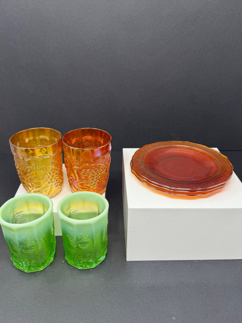 Lot # 51 - Vintage Carnival & Vaseline Glass Tumblers + Plates