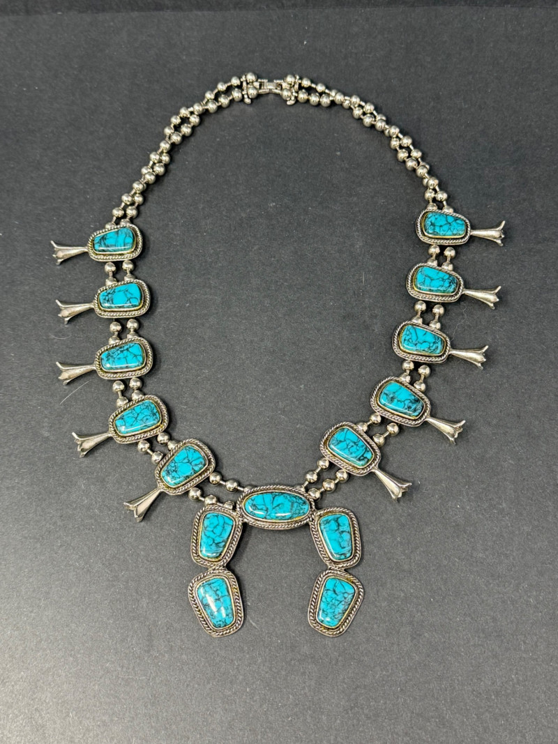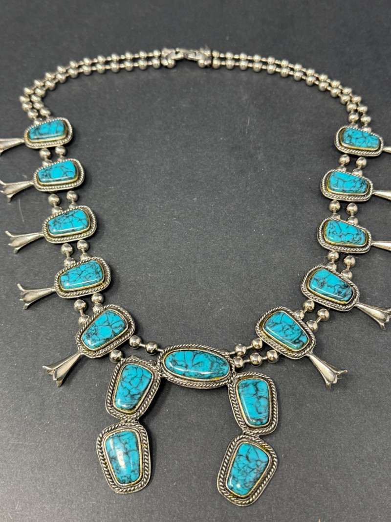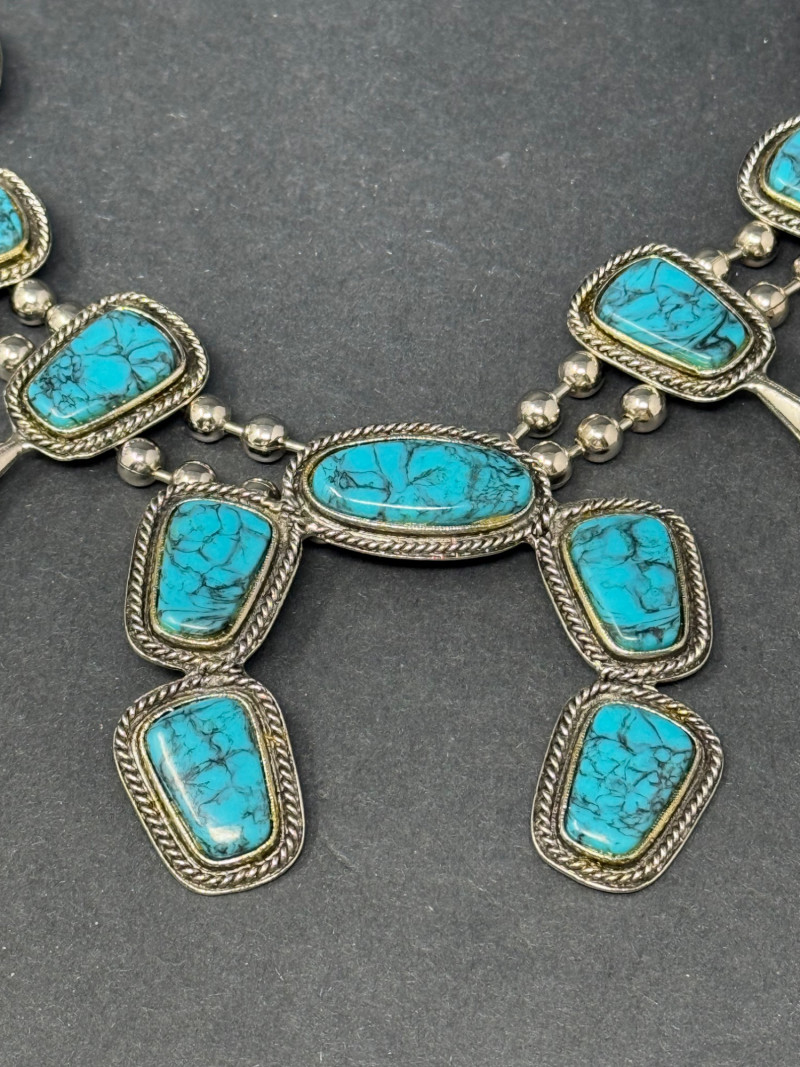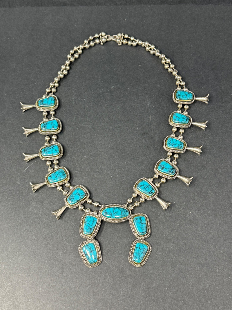Vintage Navajo Sterling Silver & Turquoise Squash Blossom Necklace This striking vintage squash blossom necklace features ten natural turquoise stones with gorgeous matrix patterns, all set in hand-stamped sterling silver. The traditional double-strand silver beadwork leads to a bold three-stone naja pendant that completes the piece with Southwestern charm. Origin: Navajo, Southwest USA Material: Sterling silver (unmarked but tested) Stones: Natural turquoise Length: Approx. 24" Era: Mid-20th century Condition: Excellent vintage condition with minimal signs of wear; stones are secure and vibrant Notes: Unmarked but consistent with Navajo artisan work from the 1950s–1970s Highly collectible and deeply rooted in Native American craftsmanship, this piece makes a powerful statement for both everyday wear and display.