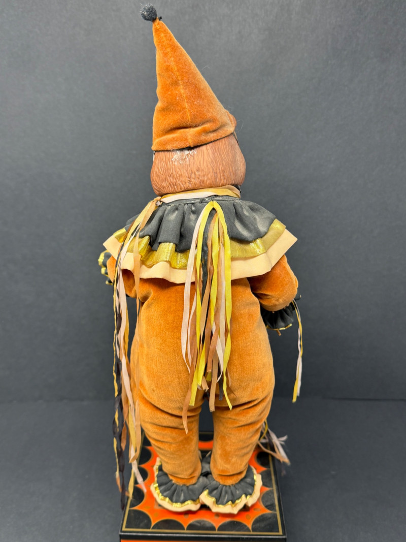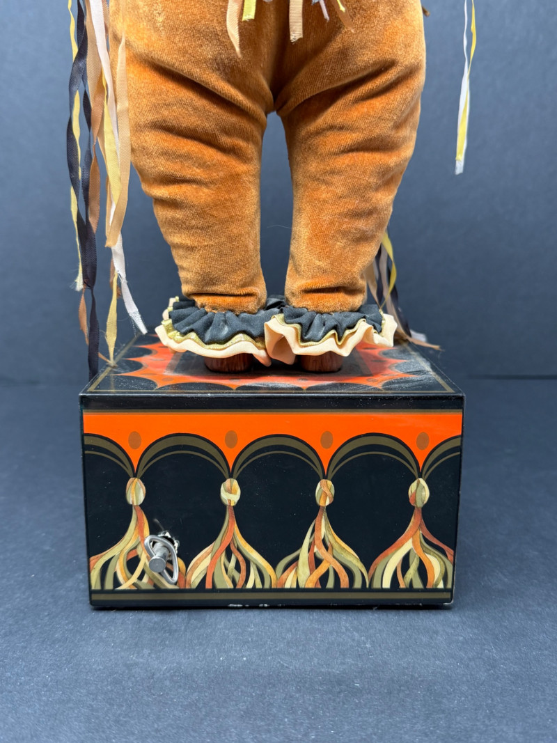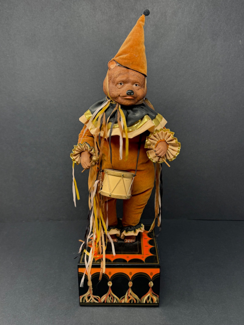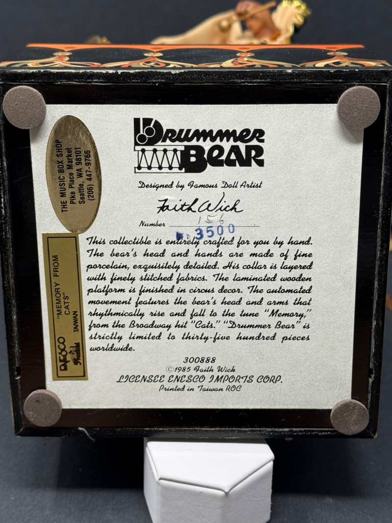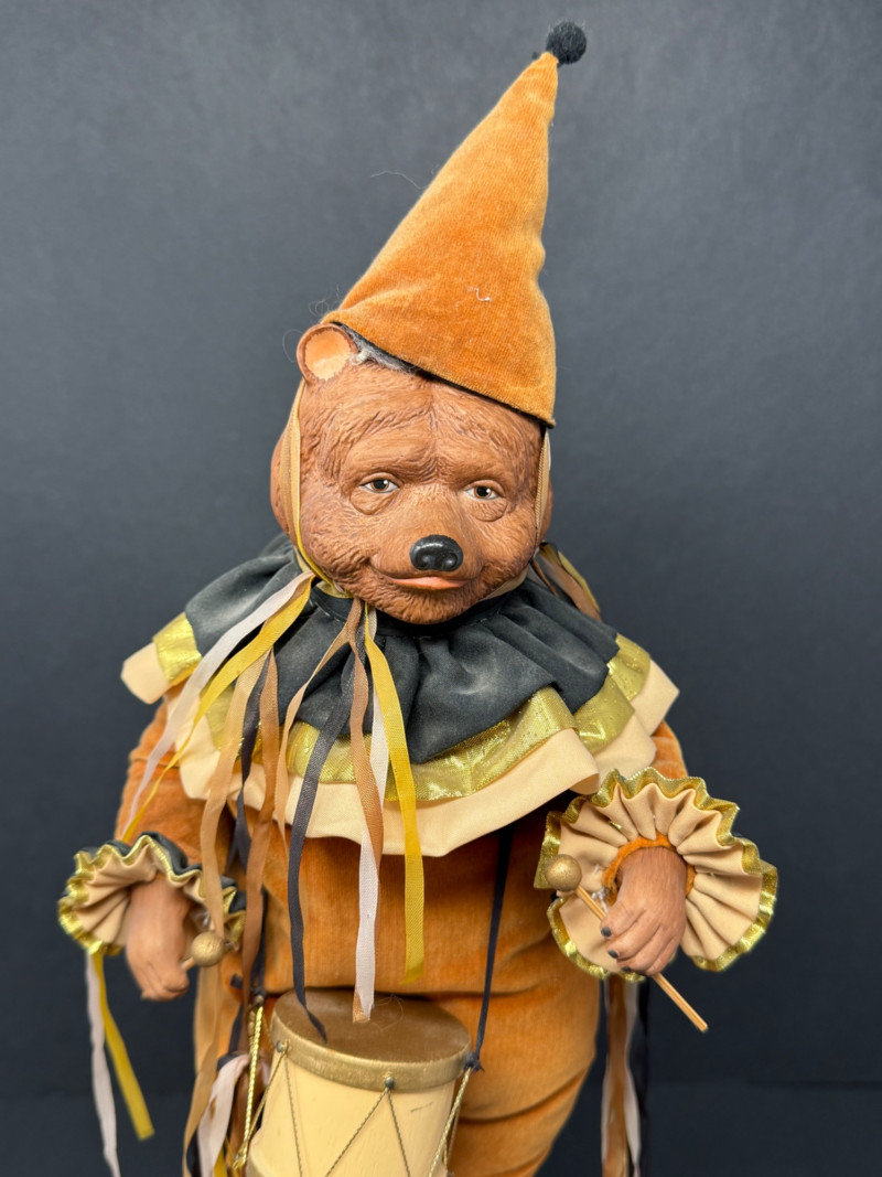 Enesco "Drummer Bear Faith" – Limited Edition Vintage Figurine This rare and highly collectible limited edition figurine from Enesco features the charming "Drummer Bear Faith," dressed in a whimsical velvet clown costume with golden trim and ribbon details. Standing on an ornate hand-painted base in bold orange and black tones, this bear holds a miniature drum, evoking the nostalgic charm of vintage circus and holiday displays. Brand: Enesco Title: Drummer Bear "Faith" Type: Limited Edition Figurine Era: Likely 1980s–1990s Materials: Mixed media – velvet, papier-mâché, wood, ribbon Dimensions: Approx. 16" H x 6.5" W x 6.5" D Condition: Excellent vintage condition This piece is part of a limited Enesco series that captured the spirit of collectible storytelling figures in the late 20th century. Highly sought after by collectors for its detail, quality, and rarity, “Drummer Bear Faith” makes a striking and sentimental addition to any vintage holiday, bear, or folk art collection.