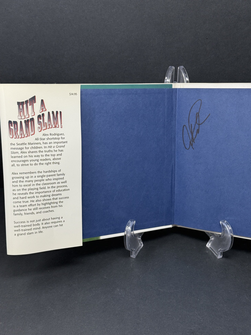 Signed First Edition – Hit a Grand Slam! by Alex Rodriguez (2000) This signed first edition of Hit a Grand Slam! by Alex Rodriguez, legendary All-Star shortstop for the Seattle Mariners and New York Yankees, offers a compelling message for young readers about the values of perseverance, education, and integrity. In this motivational children’s book, Rodriguez shares his personal journey—from growing up in a single-parent household to achieving success in Major League Baseball—highlighting the role of discipline, mentorship, and character. Author: Alex Rodriguez Publisher: HarperEntertainment Publication Year: 2000 Edition: First Edition, Hand-Signed Format: Hardcover Dimensions: Approx. 10.25" H x 8.25" W Signature: Boldly signed in black ink on the front endpaper Condition: Excellent overall; interior pages are clean and crisp, with only minimal shelf wear to the cover Provenance: Signature presumed authentic, acquired from private collection Signed copies of Hit a Grand Slam! are increasingly scarce, making this a valuable addition for collectors of sports memorabilia, signed books, or fans of Rodriguez’s storied career. A distinguished and meaningful collectible with lasting impact.