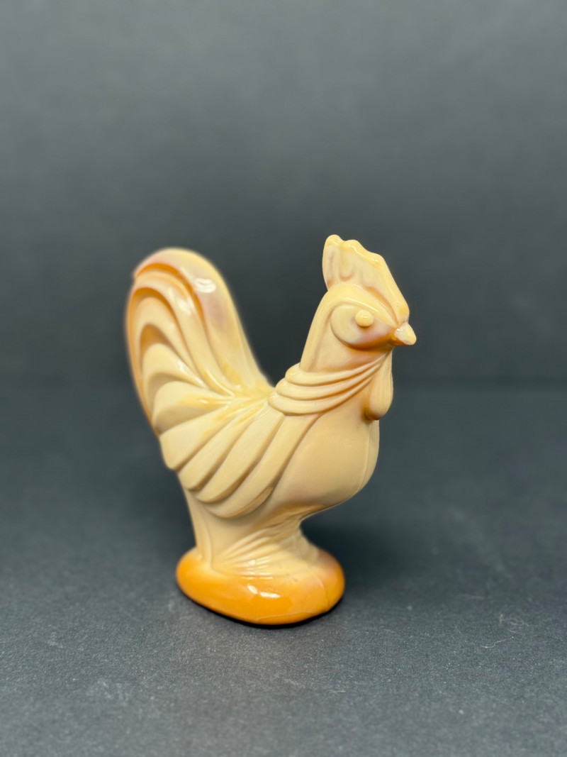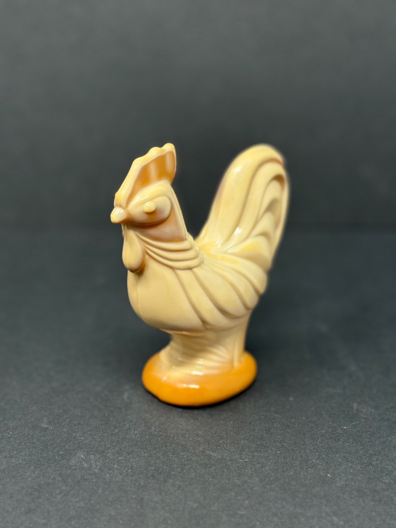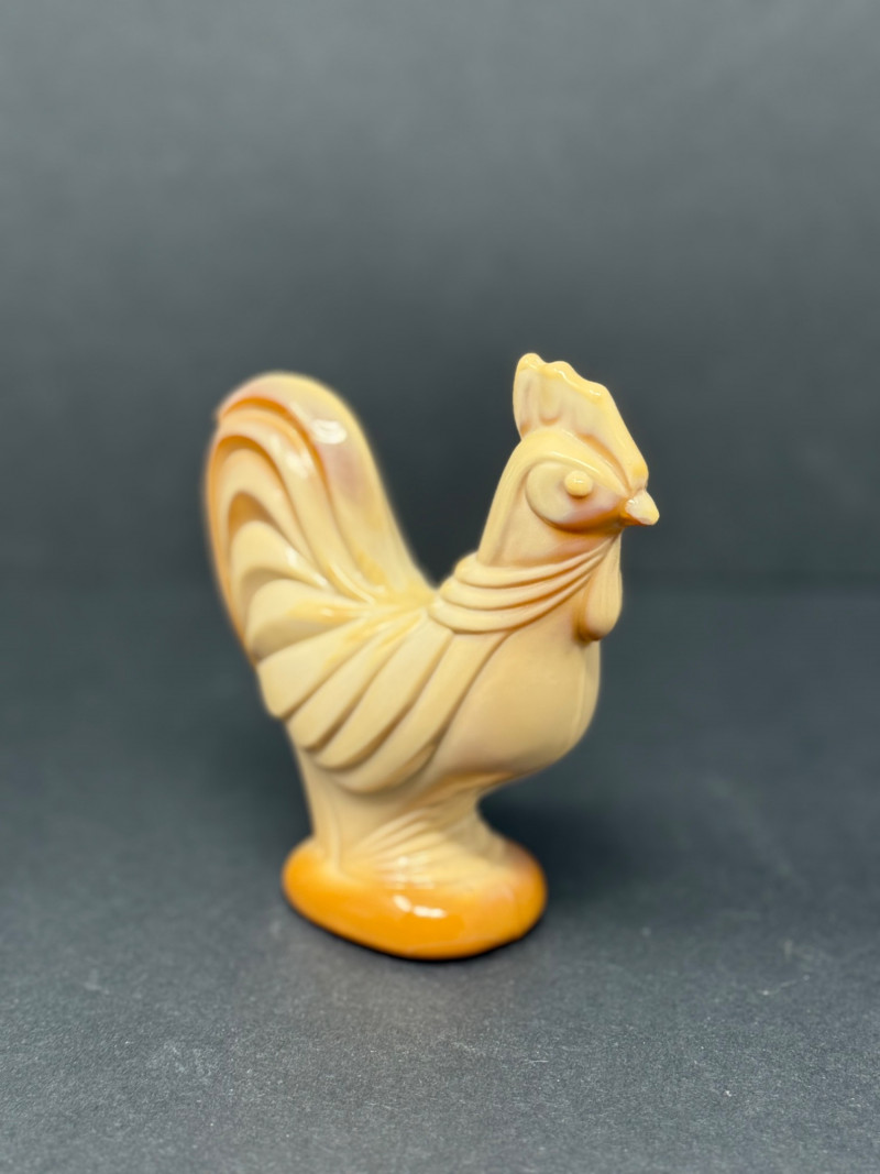 Crafted by Fenton Art Glass Company, this ceramic rooster boasts a warm ivory glaze with subtle golden hues. Its sculptural lines and classic profile reflect Fenton’s attention to form and detail, known primarily for their exquisite glass but occasionally producing ceramic pieces as well.
