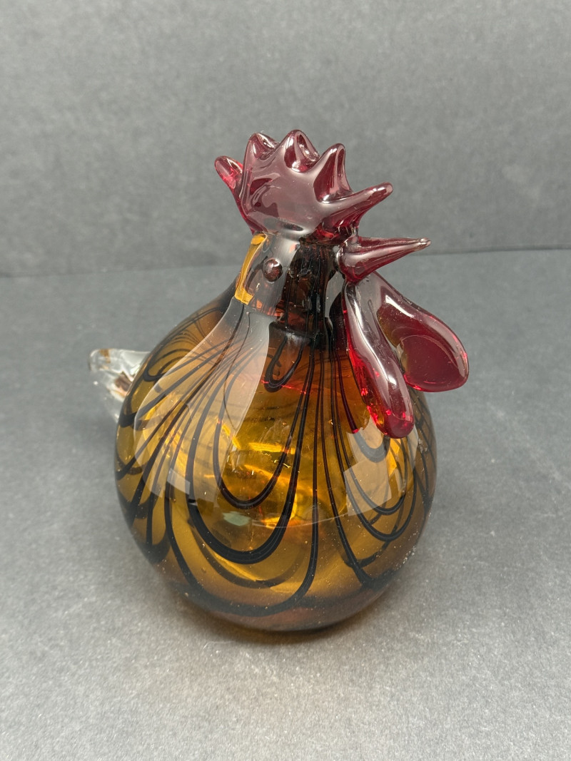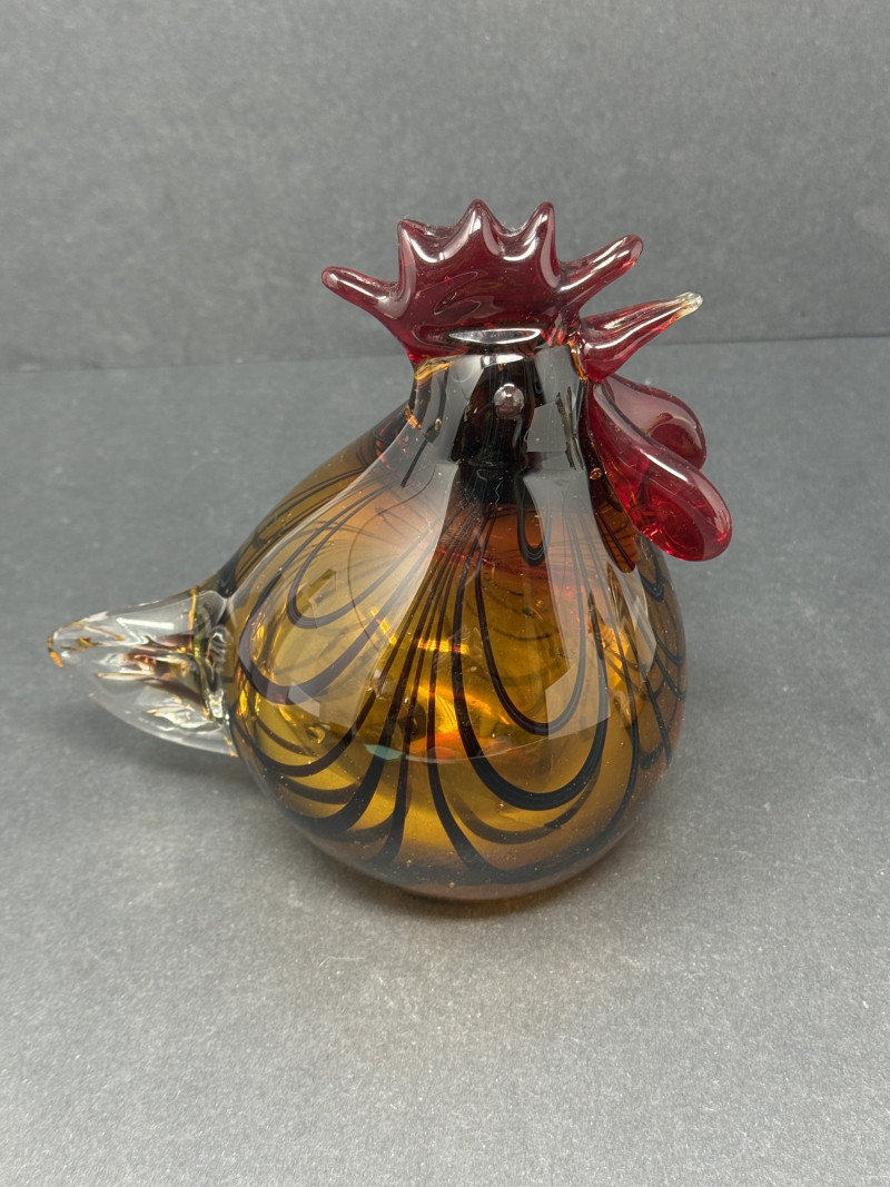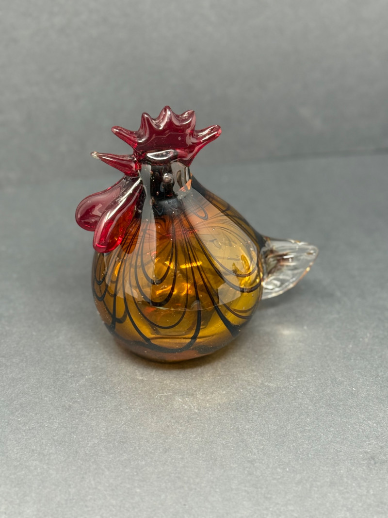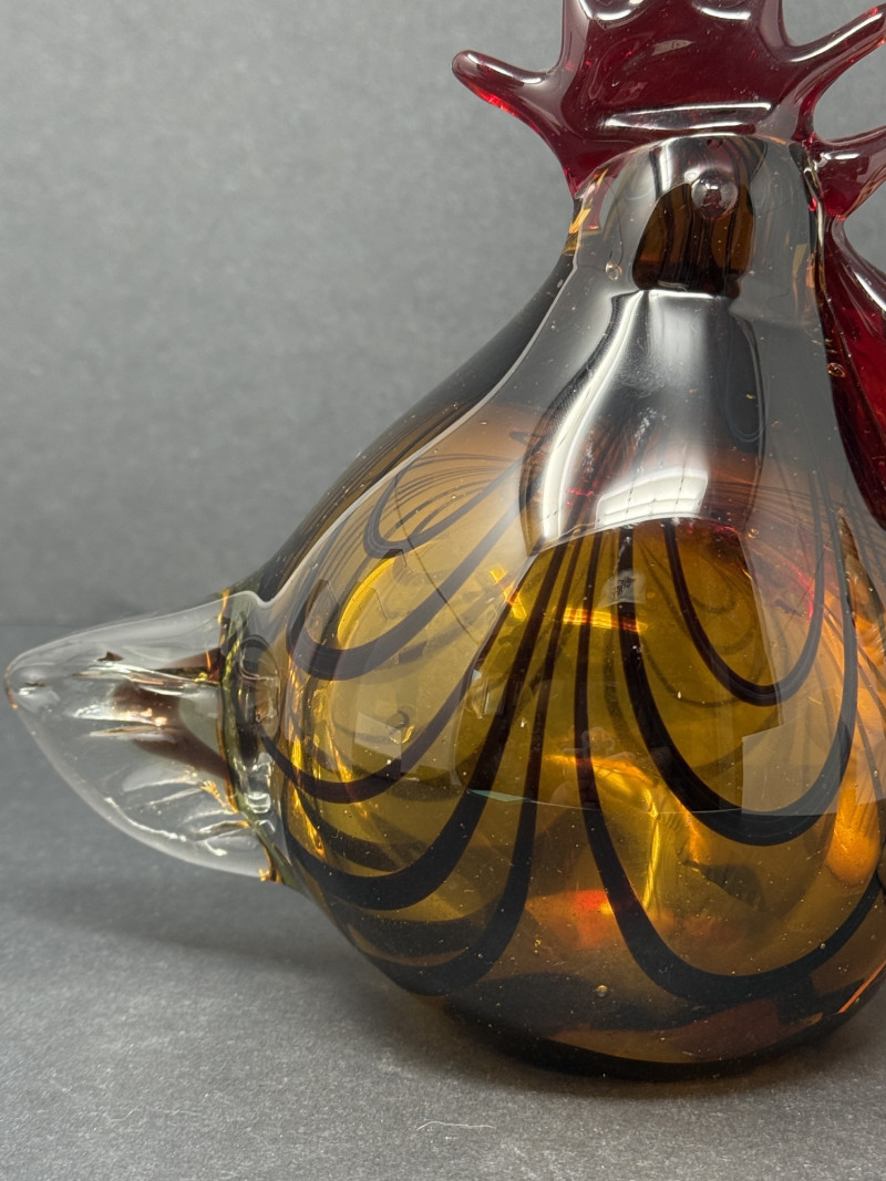 Hand-blown in Italy, this vibrant Murano rooster features a rich amber body with elegant black feather-like swirls and a bold ruby red comb and wattle. The fluid form and brilliant coloration embody the timeless artistry of Venetian glasswork.