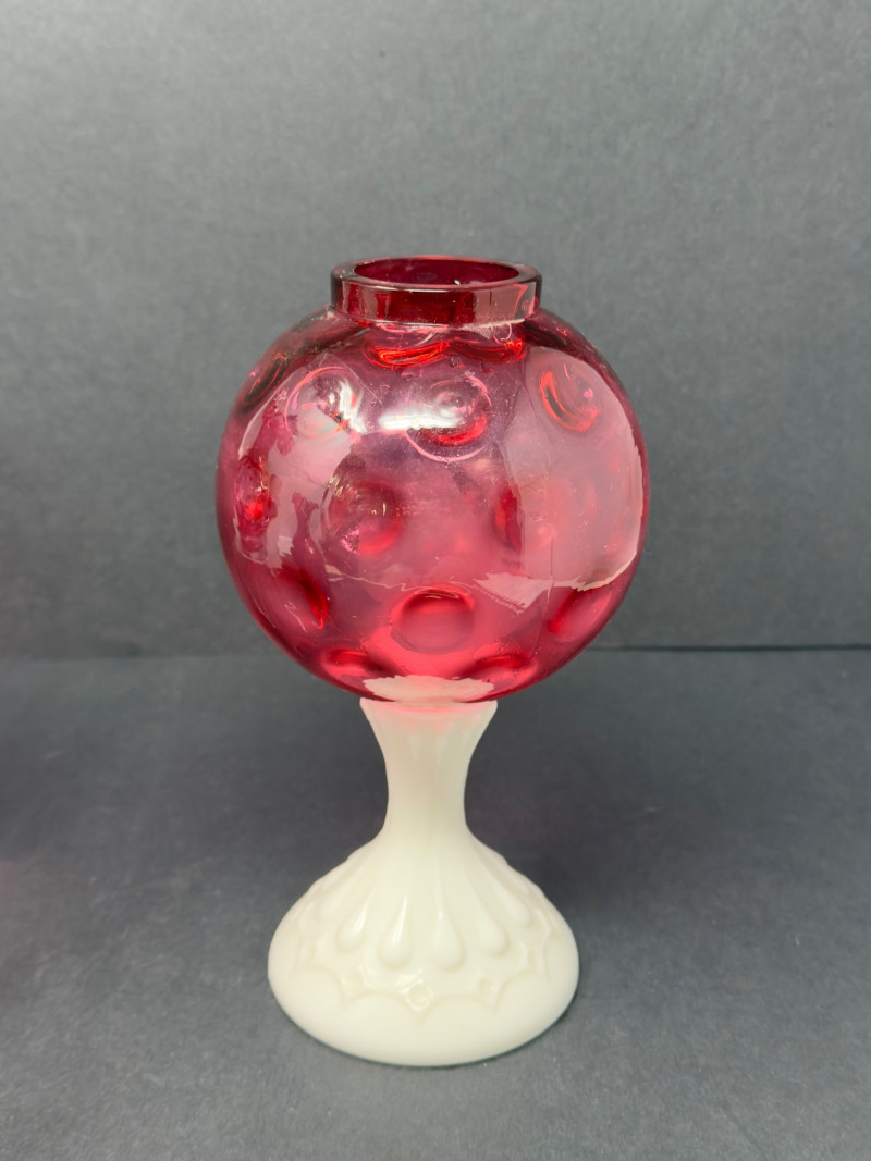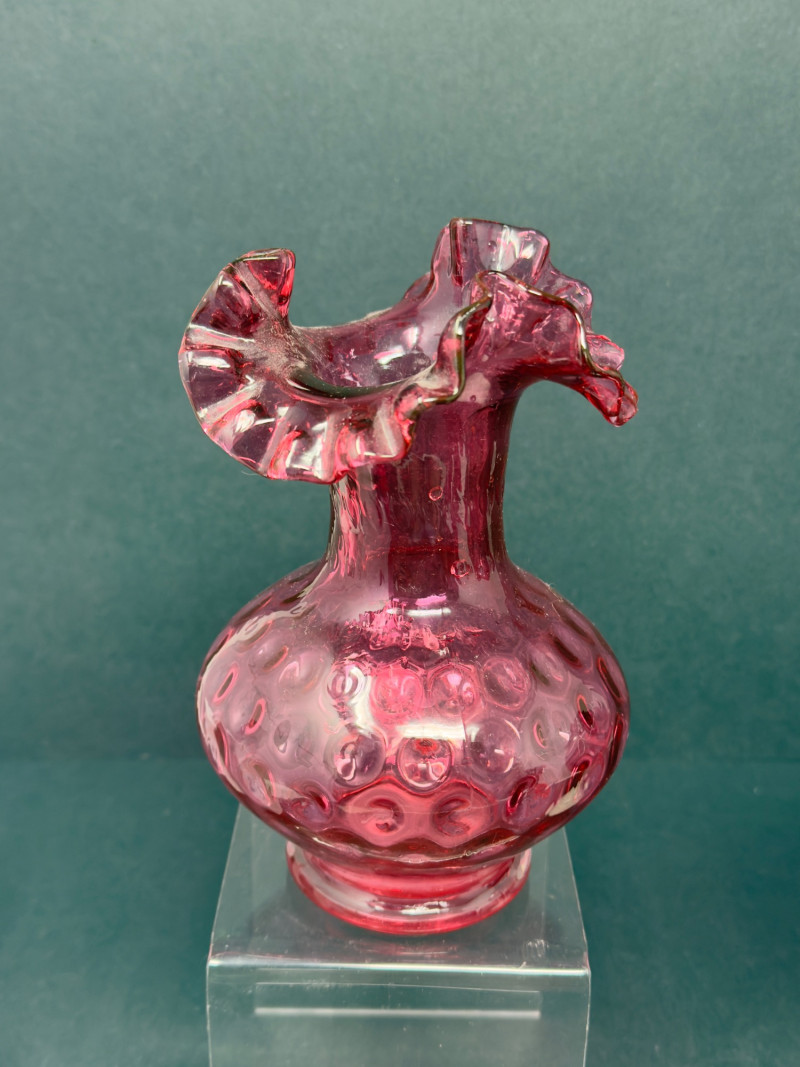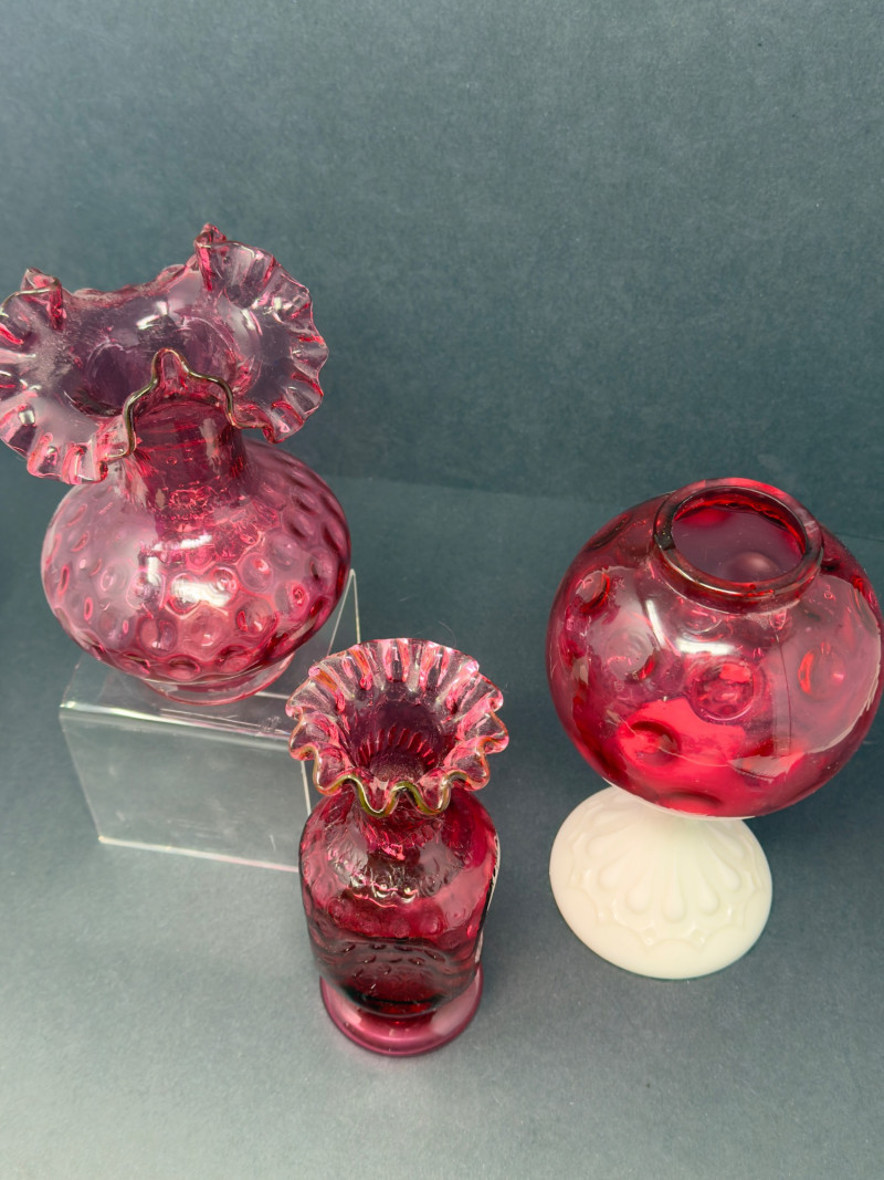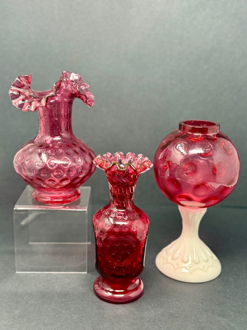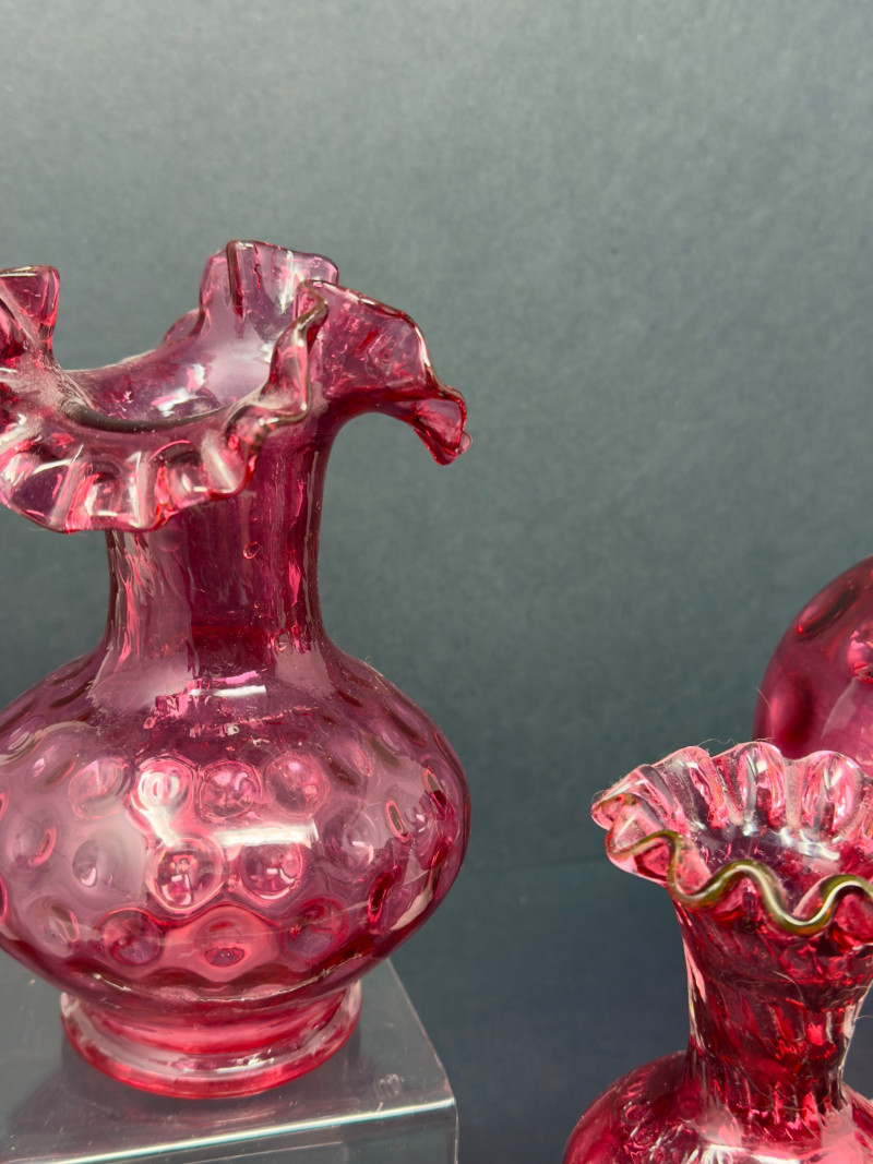 Fenton Cranberry Opalescent Hobnail Glass Collection – Set of 3 This beautiful trio of Fenton cranberry art glass showcases the brand’s iconic craftsmanship in vibrant opalescent hues and hobnail textures. The set includes two ruffled vases and one pedestal rose bowl-style piece. Brand: Fenton Color: Cranberry Red with Opalescent Accents Pattern: Hobnail Quantity: Set of 3 Heights: Approx. 6"–8" each These timeless pieces are perfect for collectors or for adding vintage charm to your home décor.