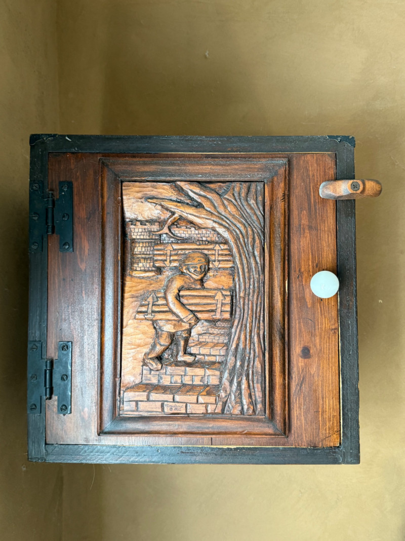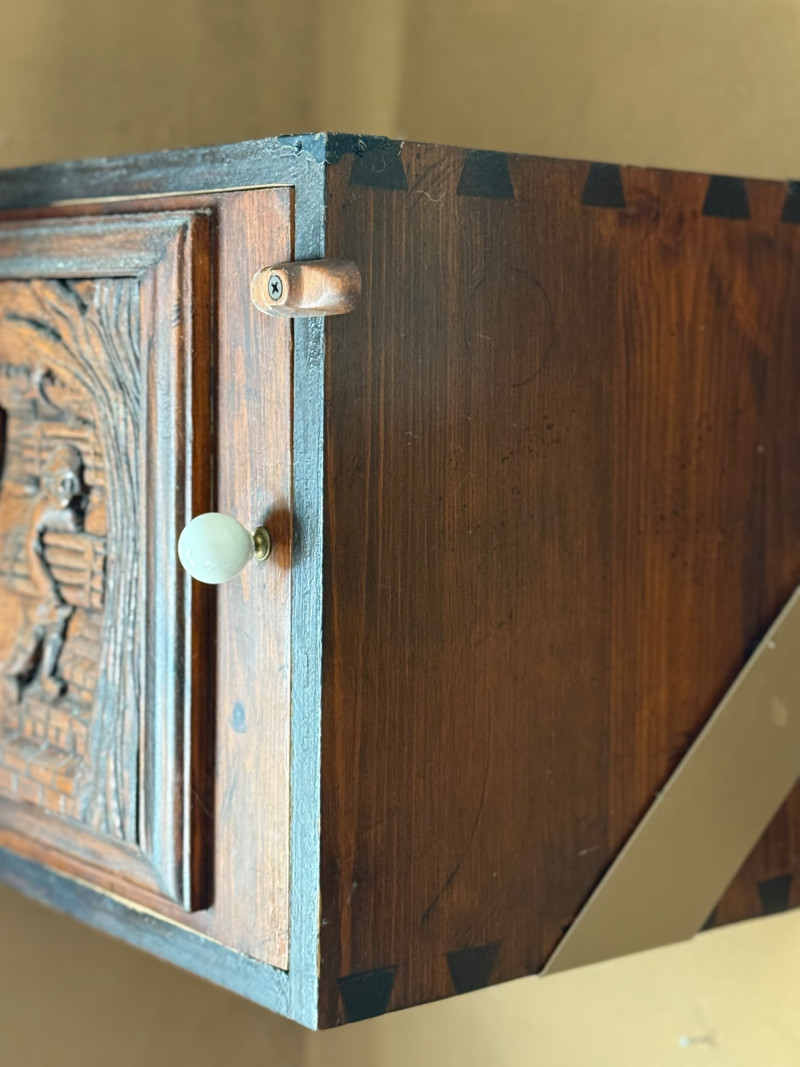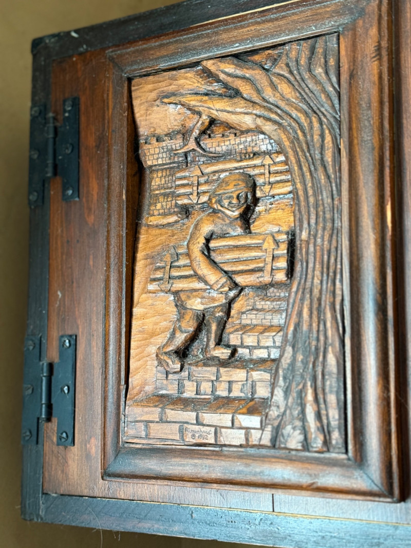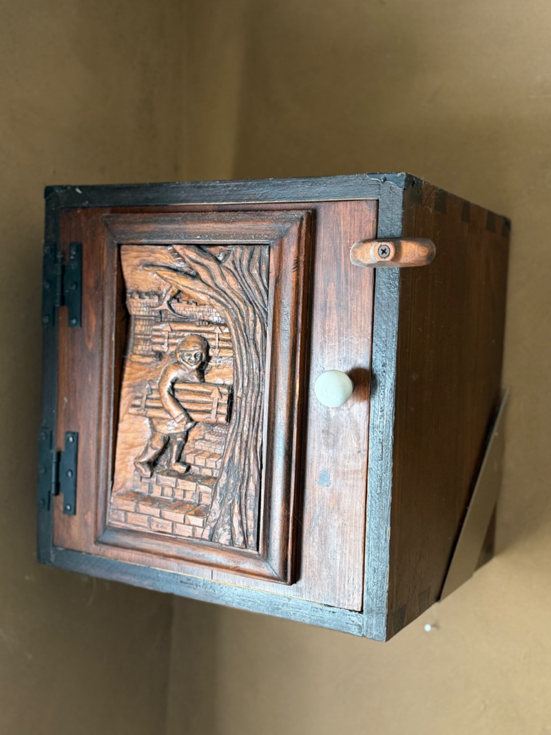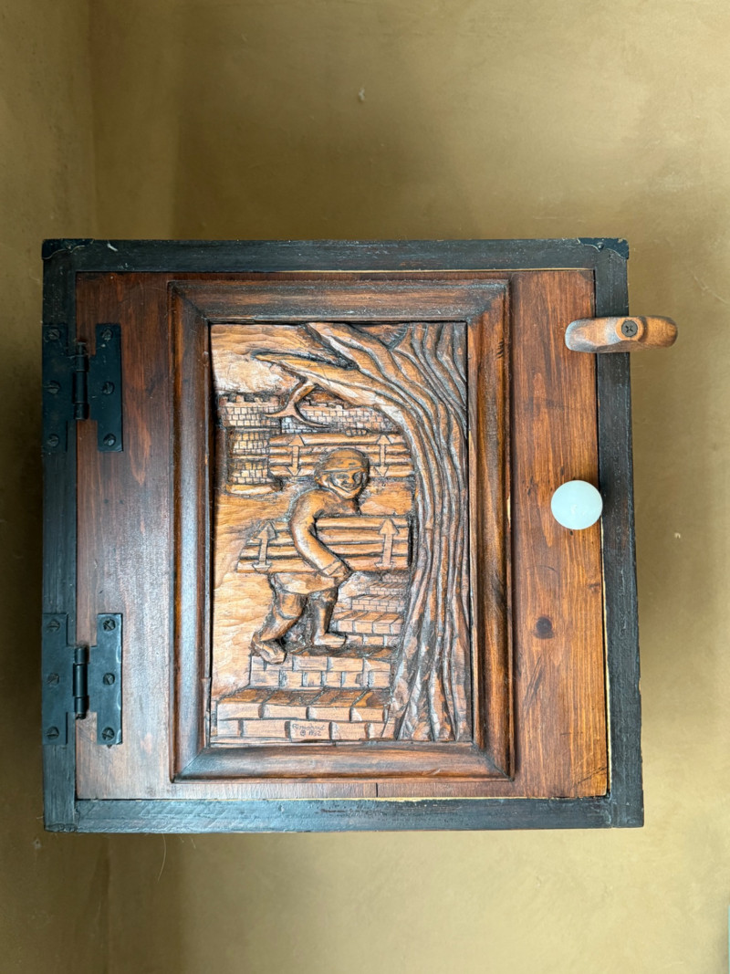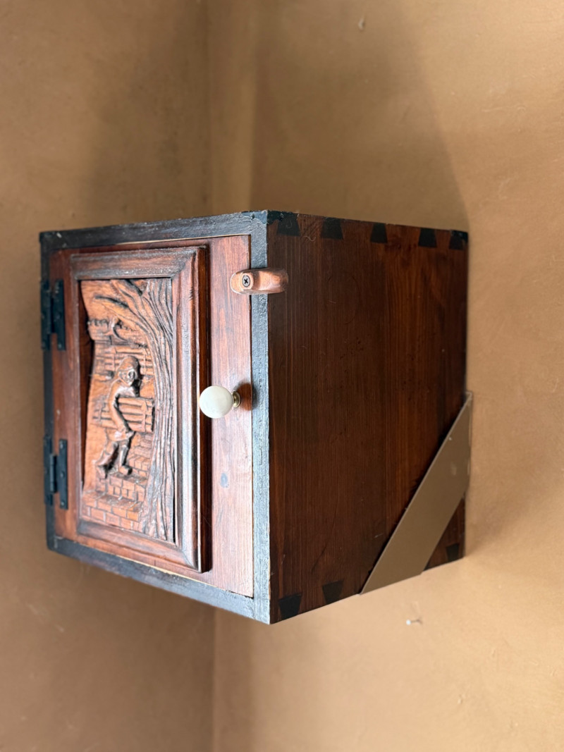 Antique/Vintage Signed Hand-Carved Wall Cabinet This unique vintage wall cabinet features an intricately hand-carved front panel. The carving depicts a cloaked figure beneath a tree in a cobbled landscape, full of rustic charm and depth. Built from solid wood, the cabinet showcases dovetail joints, a natural wood grain finish, and a handmade latch with a porcelain knob. Construction: Solid wood with dovetail joinery Features: Hand-carved front, working door latch, and interior storage Use: Perfect for use as a spice cupboard, key cabinet, or art display Dimensions: Approx. 14" H x 14" W x 12" D A rare folk art piece blending form and function—ideal for collectors of outsider art, rustic decor, or hand-crafted furniture.