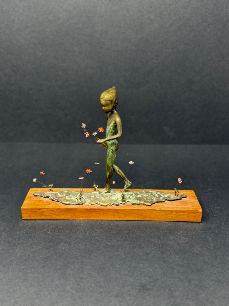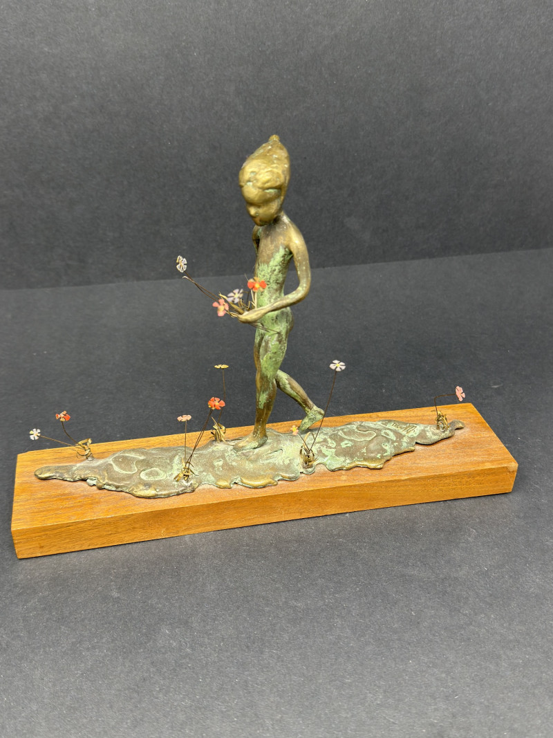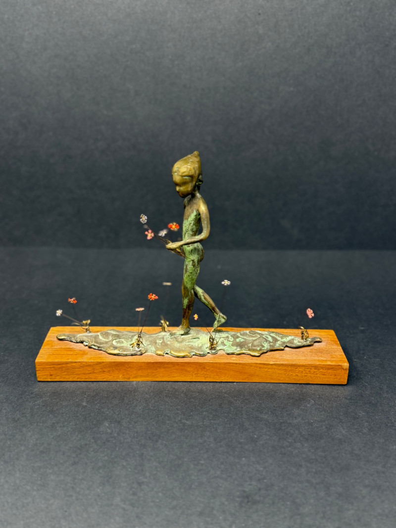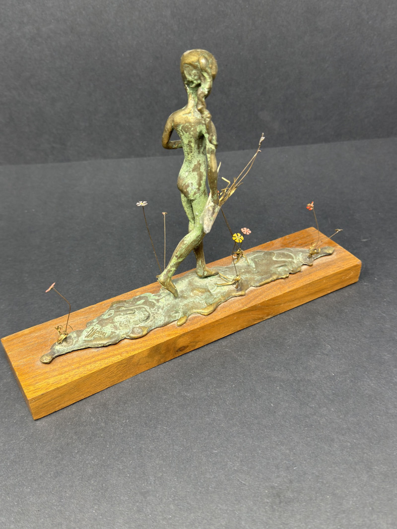 This rare and whimsical bronze sculpture by Malcolm Moran captures the innocence and wonder of youth. A young girl is depicted walking peacefully among delicate, hand-applied flowers, all set atop a sculpted bronze base mounted to a warm, polished wood platform. Artist: Malcolm Moran Medium: Bronze with patina, enameled wire flowers, solid wood base Era: Mid-century, circa 1960s–1970s Dimensions: Approximately 10–12" long x 7–9" tall Signature: Engraved and ink-signed "Malcolm Moran" on base Condition: Excellent vintage condition with minor age-appropriate wear - flowers on one hand need to be re-attached Malcolm Moran is known for his expressive bronze figurines that often feature narrative movement and emotional warmth. This particular piece is increasingly hard to find and prized among collectors of mid-century art. A poetic addition to any vintage, modern, or eclectic collection.Malcolm Moran Bronze Sculpture – “Girl with Flowers” on Wood Base (Mid-Century Modern)