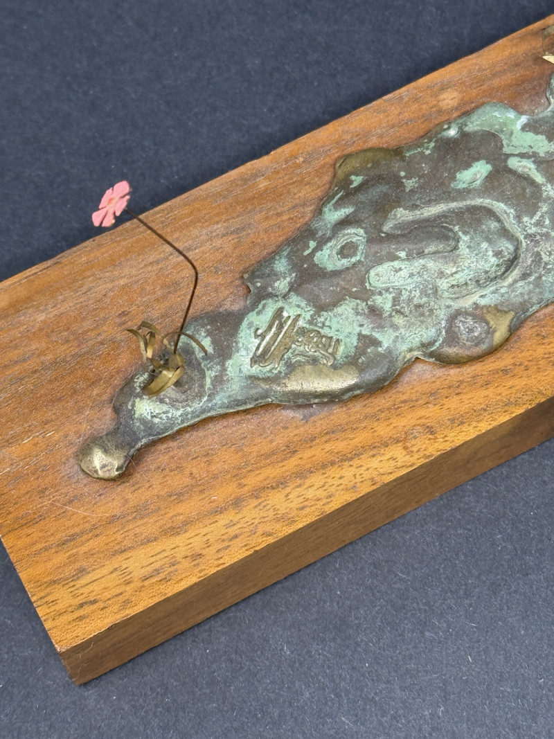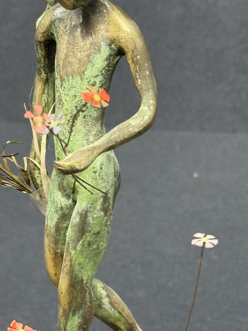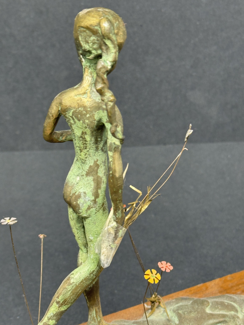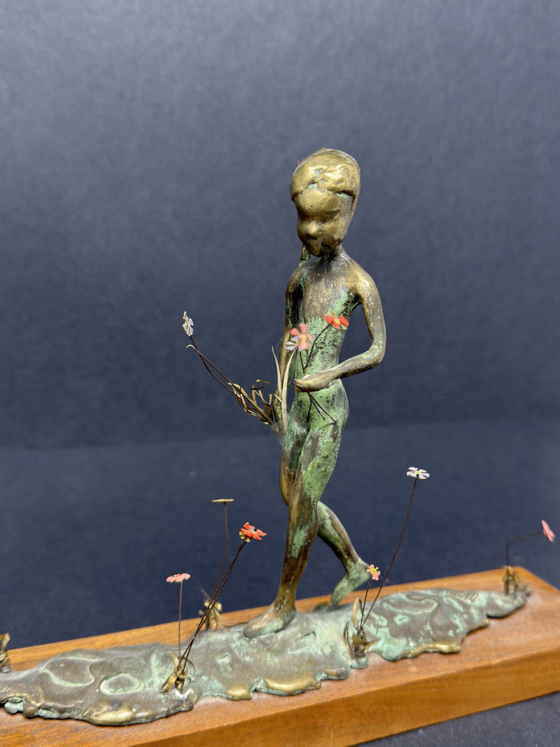 This rare and whimsical bronze sculpture by Malcolm Moran captures the innocence and wonder of youth. A young girl is depicted walking peacefully among delicate, hand-applied flowers, all set atop a sculpted bronze base mounted to a warm, polished wood platform. Artist: Malcolm Moran Medium: Bronze with patina, enameled wire flowers, solid wood base Era: Mid-century, circa 1960s–1970s Dimensions: Approximately 10–12" long x 7–9" tall Signature: Engraved and ink-signed "Malcolm Moran" on base Condition: Excellent vintage condition with minor age-appropriate wear - flowers on one hand need to be re-attached Malcolm Moran is known for his expressive bronze figurines that often feature narrative movement and emotional warmth. This particular piece is increasingly hard to find and prized among collectors of mid-century art. A poetic addition to any vintage, modern, or eclectic collection.Malcolm Moran Bronze Sculpture – “Girl with Flowers” on Wood Base (Mid-Century Modern)