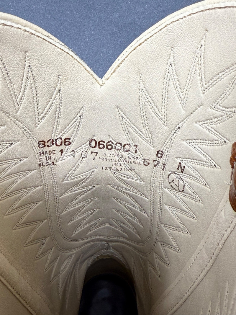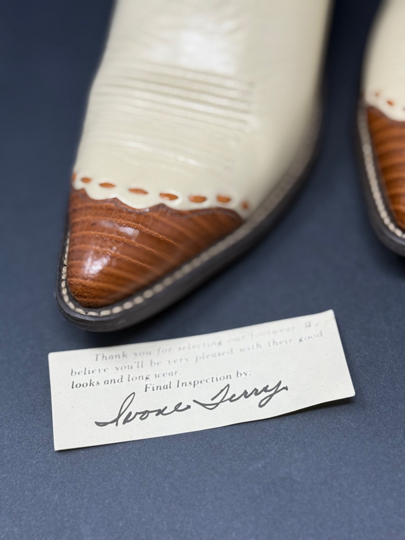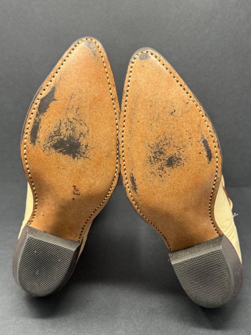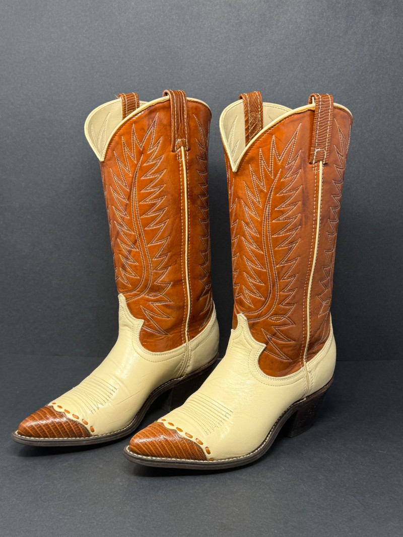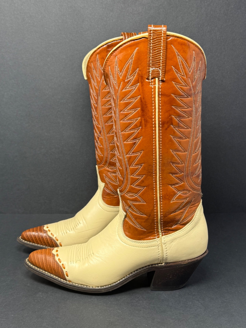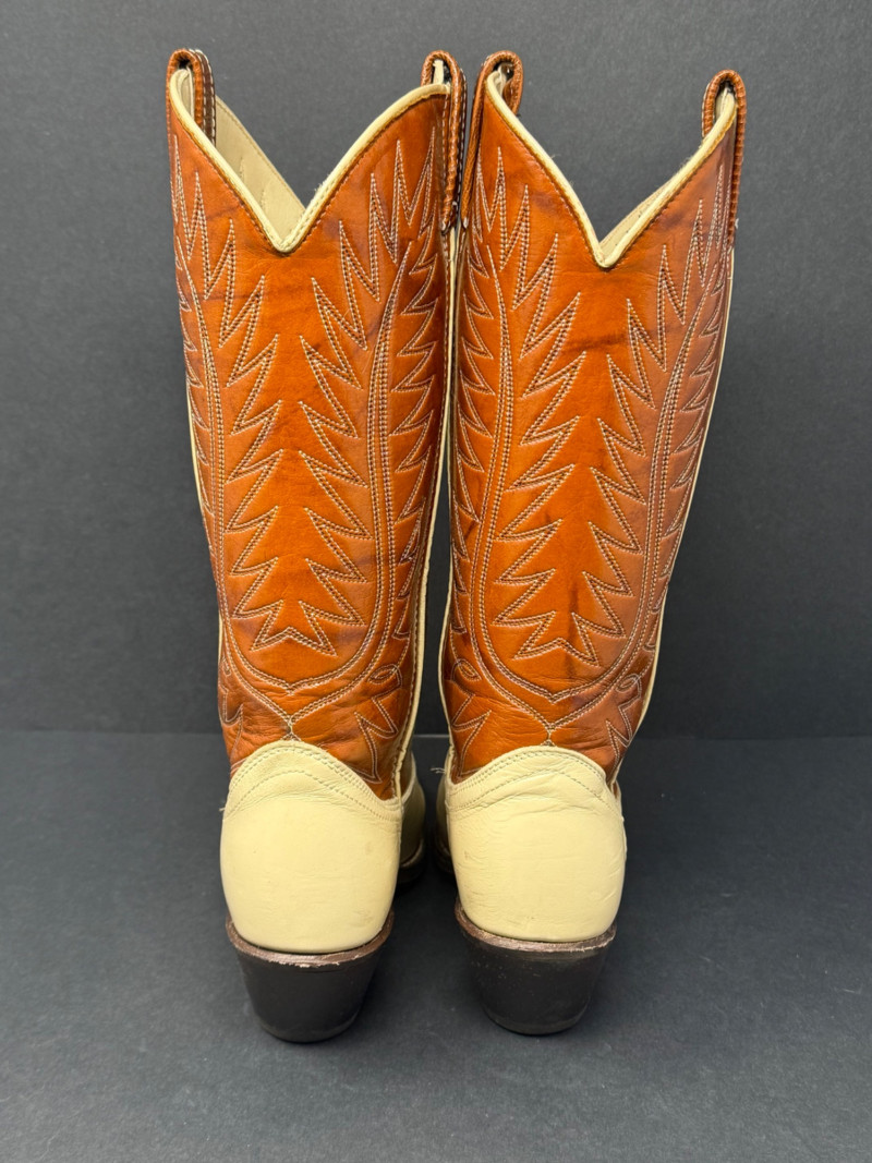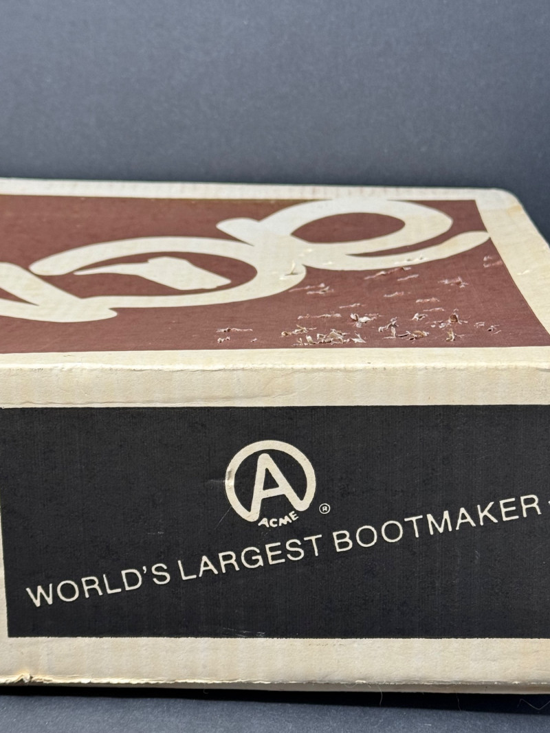 Authentic 1980s Acme cowboy boots in a standout cream and cognac leather combo. The boots feature classic Western stitching, pointed toes, and sturdy heels – perfect for adding vintage flair to your everyday look or collection. Brand: Acme Era: 1980s Material: Genuine leather Color: Cream & cognac Toe: Pointed Heel Height: Approx. 1.75"–2" Shaft Height: Approx. 12" Size: 8W Condition: Excellent vintage condition - original box Whether you're two-stepping or styling a statement outfit, these Acme boots are the real deal.Vintage Acme Two-Tone Western Cowboy Boots – Cream & Cognac Leather (1980s)