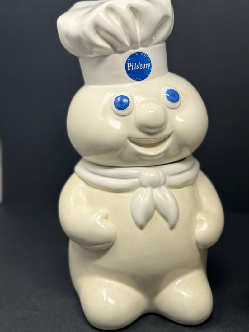 This nostalgic Pillsbury Doughboy collection includes a charming ceramic cookie jar and two classic vinyl squeeze dolls — a perfect trio for lovers of vintage advertising and Americana. Brand: Pillsbury Era: 1970s (dolls) 1988 (Jar) Includes: 1 ceramic cookie jar (approx. 11–12" tall) 2 squeeze dolls (approx. 7" tall each) Material: Ceramic (jar), soft vinyl (dolls) Condition: Good vintage condition with light wear consistent with age A whimsical, collectible piece of baking history — ideal for retro kitchen decor or as a unique gift for fans of the beloved Doughboy!Vintage Pillsbury Doughboy Collectible Set – Cookie Jar & Dolls (1980s)