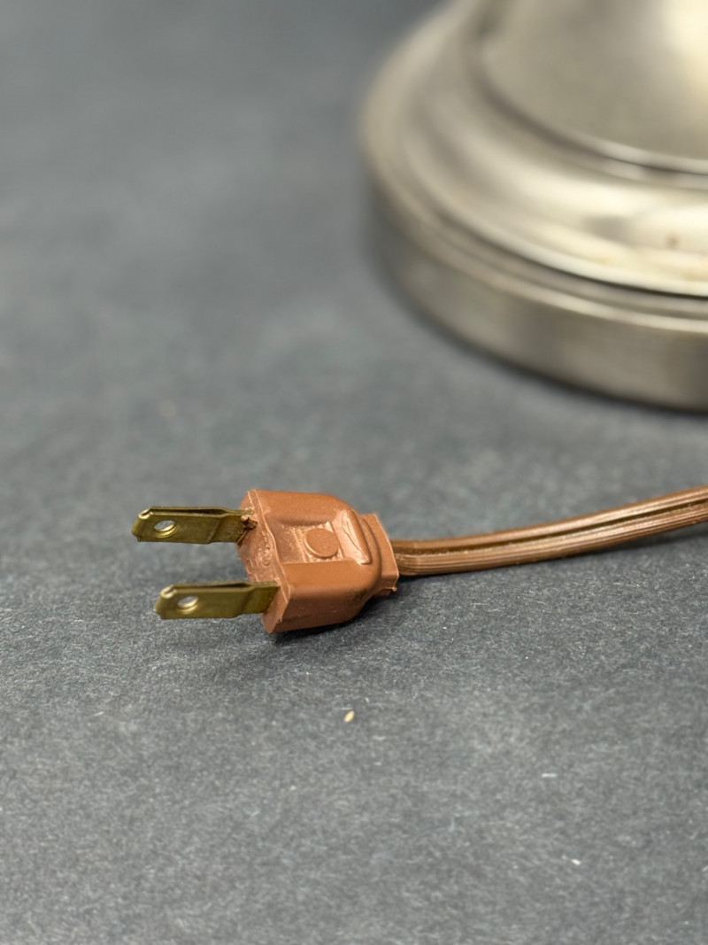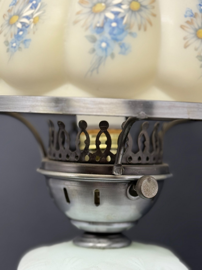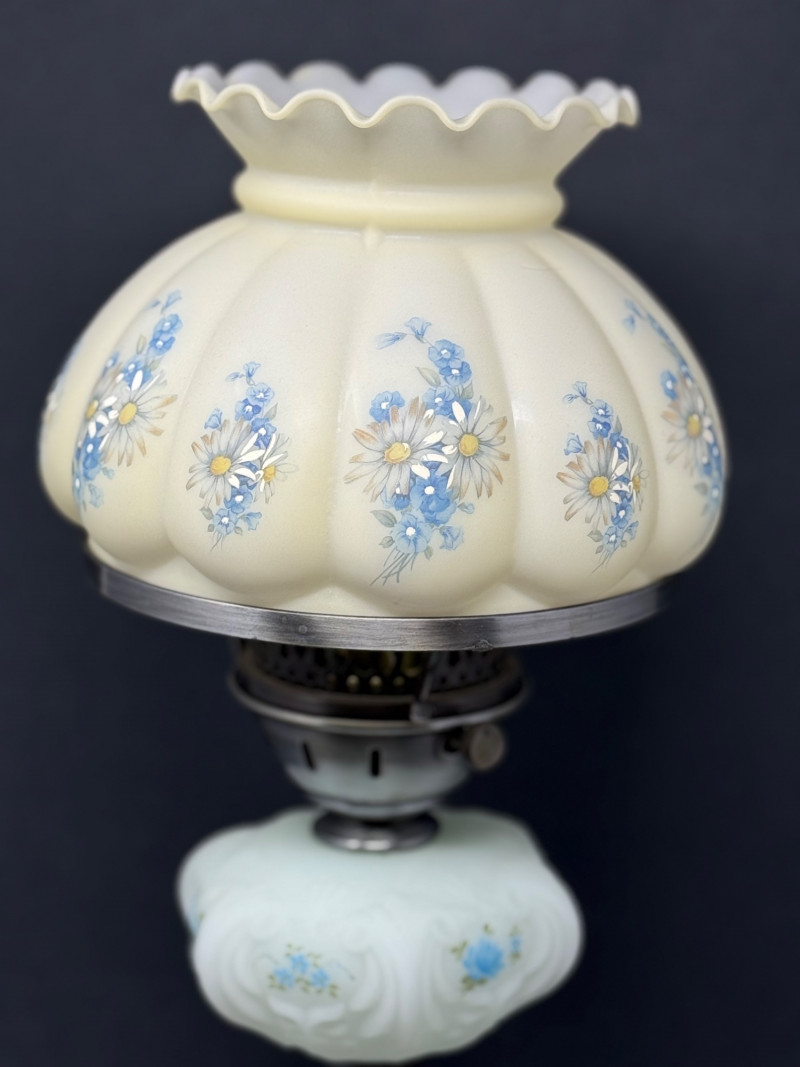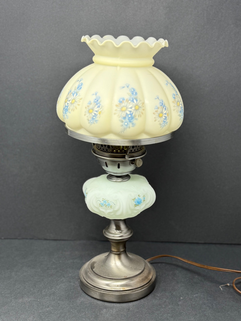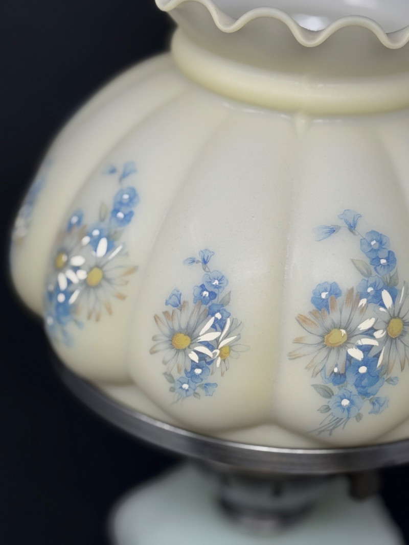 Charming vintage electric hurricane-style table lamp featuring hand-painted blue and yellow floral motifs on frosted glass. The milk glass shade has a scalloped ruffle edge, paired with a brushed metal base. Era: Circa 1960s–1970s Style: Cottagecore / Shabby Chic / Country Vintage Condition: Great working condition with light patina on the metal base. No chips or cracks in the glass. Size: Approx. 17" H x 8"W Perfect for a bedside table, reading nook, or farmhouse-inspired space.Vintage Floral Glass Hurricane Lamp – Electric – 1960s/70s
