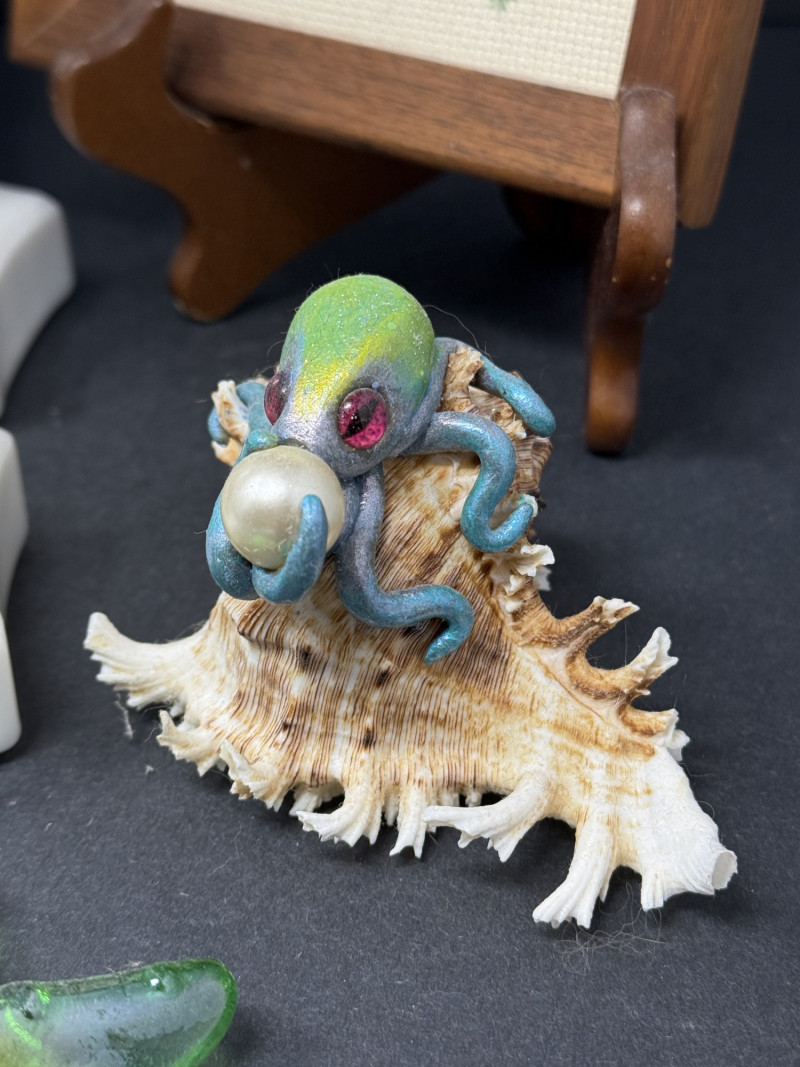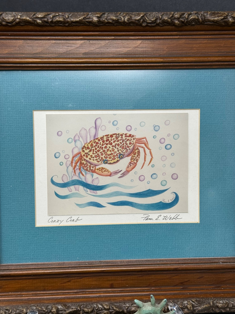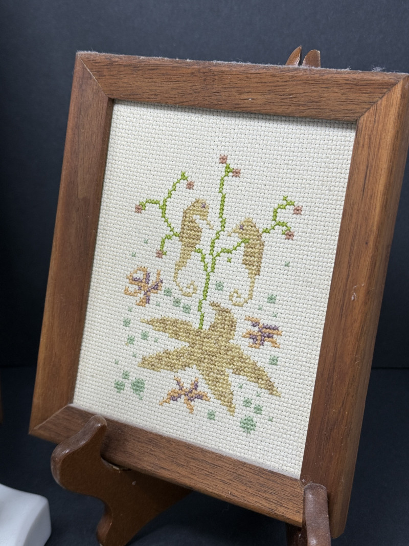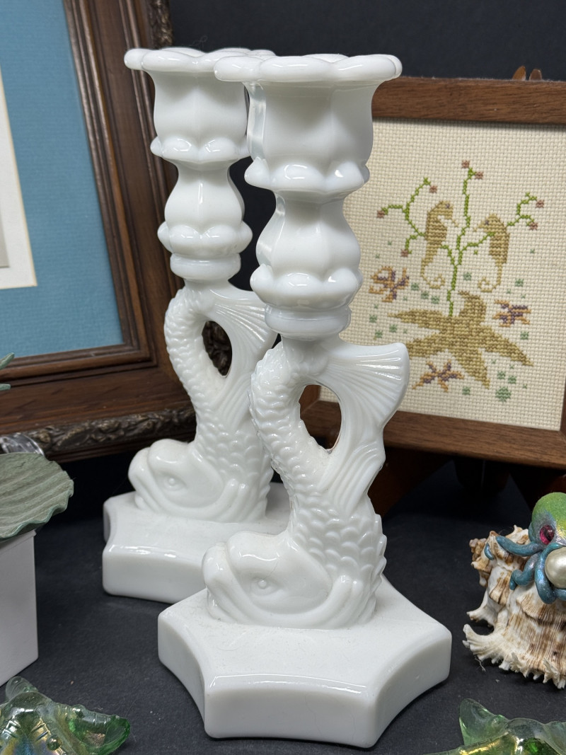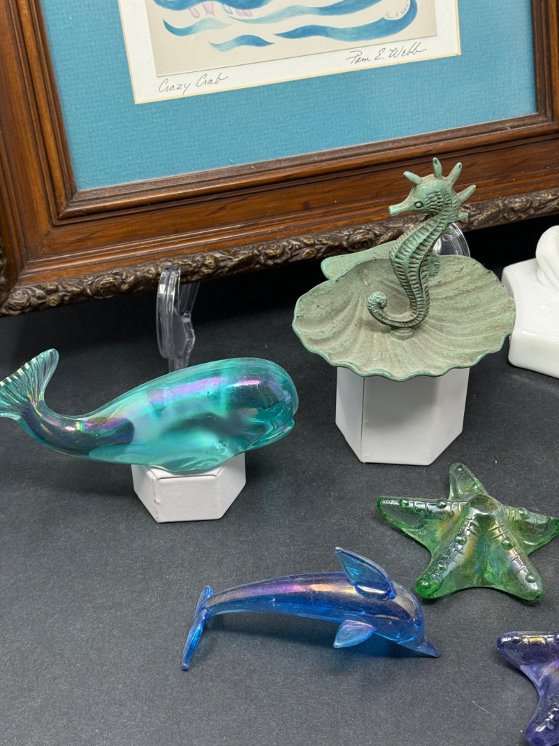 A beautifully curated bundle of seaside charm perfect for a coastal gallery wall, beach cottage, or vintage-inspired shelf styling. Includes: Framed Crab Art Print signed by the artist (Tina B. Wills) – whimsical and colorful Framed Flamingo Cross-Stitch in a wood frame – hand-stitched and sweetly nostalgic Pair of White Milk Glass Dolphin Candle Holders – striking and sculptural Green Sea Shell with Metal Seahorse Figurine Glass Sea Creatures – includes two dolphins, a Fenton whale (rare), and five hand-blown glass starfish in varying hues of green, blue, and purple Whimsical Shell Crab Figurine – playful and detailed with faux gems Era: Mostly vintage, ranging from mid-century to 1990 Condition: All pieces in excellent vintage condition Style: Coastal, nautical, cottagecore, eclectic This set brings a touch of under-the-sea magic and vintage charm to any space. Style together or sprinkle across your home for a cohesive beachy vibe.Coastal Cottagecore Decor Lot – Art, Milk Glass, & Ocean-Inspired Accents