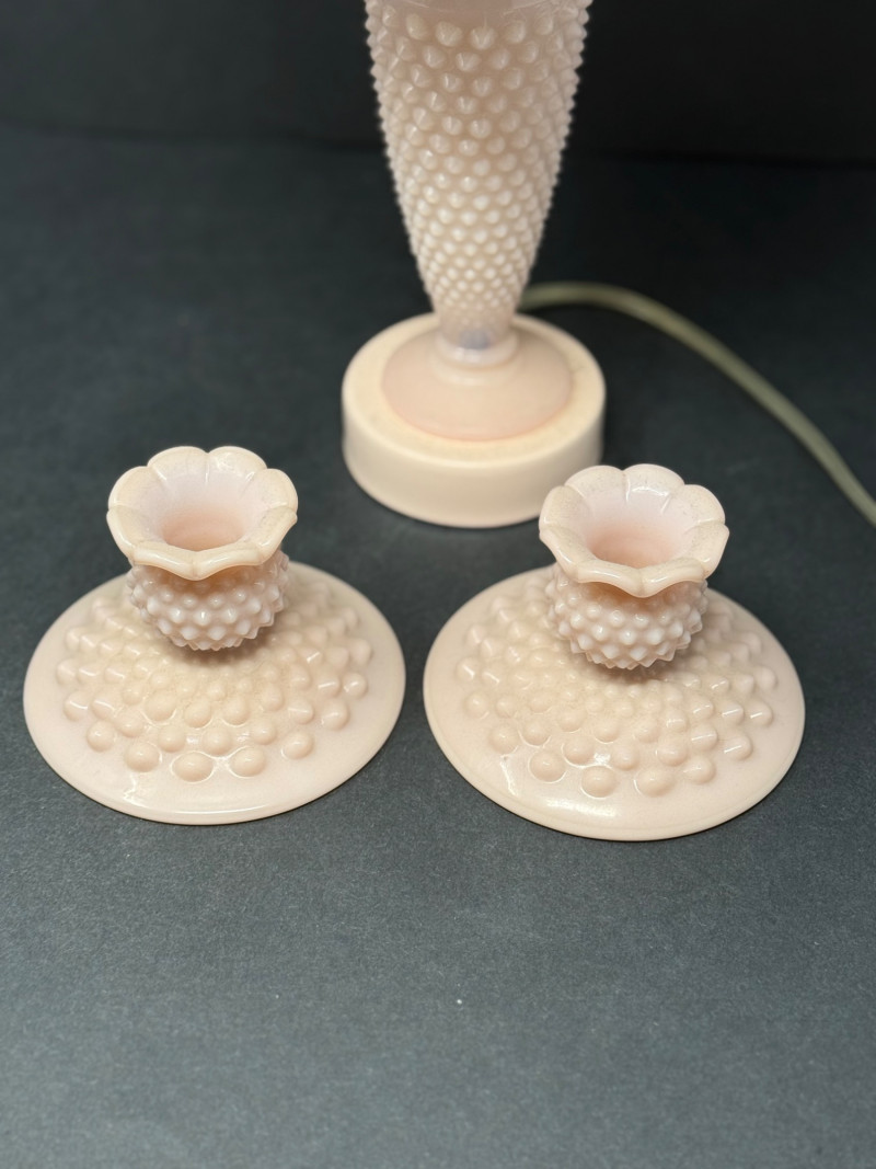 Lot # 85 - Vintage Fenton Hobnail Custard Glass Lamp & Matching Candlestick