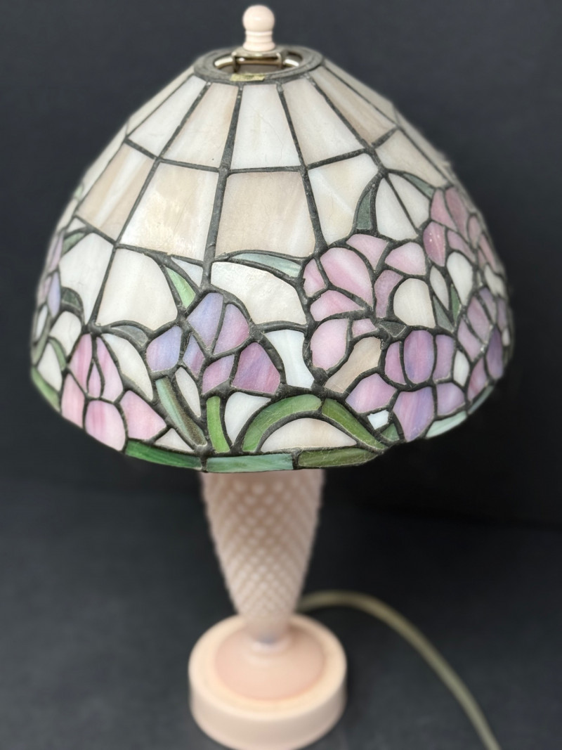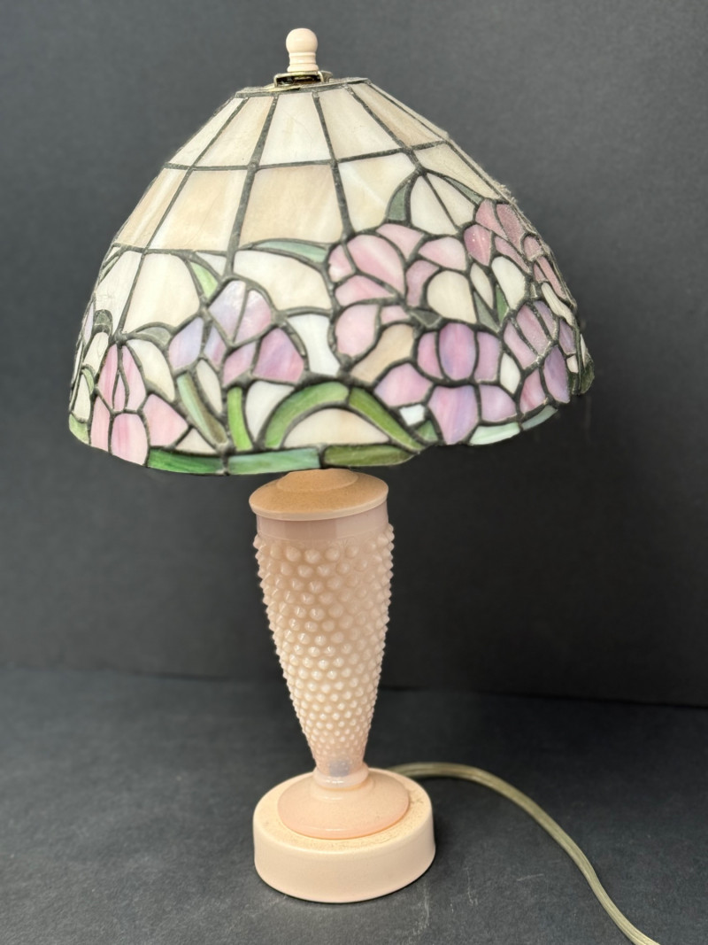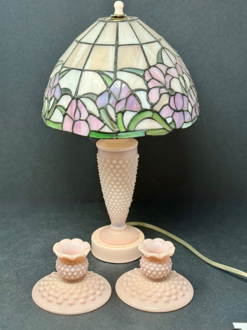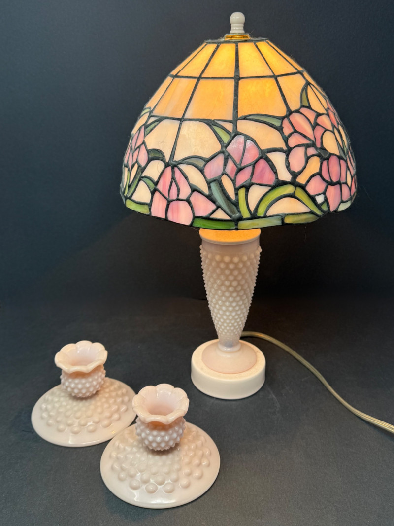 Vintage Fenton Hobnail Custard Glass Lamp & Matching Candlestick Holders – Tiffany-Style Shade This charming set includes a vintage Fenton hobnail custard glass lamp paired with two matching Fenton candlestick holders. The lamp features a delicately textured hobnail base and is crowned with a Tiffany-style stained glass shade in soft pastels of lavender, pink, and green, showcasing a floral motif. The coordinating candle holders mirror the soft creamy tone and hobnail design, offering a cohesive and romantic aesthetic. Brand: Fenton Materials: Custard glass (uranium glow under UV), stained glass shade Era: Mid-20th century Condition: Excellent vintage condition; lamp tested and works properly Lamp Dimensions: Approx. 16” H × 9.5” W Candlestick Holders: Approx. 3.5” H × 4.5” W This set brings together timeless craftsmanship and graceful vintage charm—perfect for cottagecore, shabby chic, or art glass collectors.