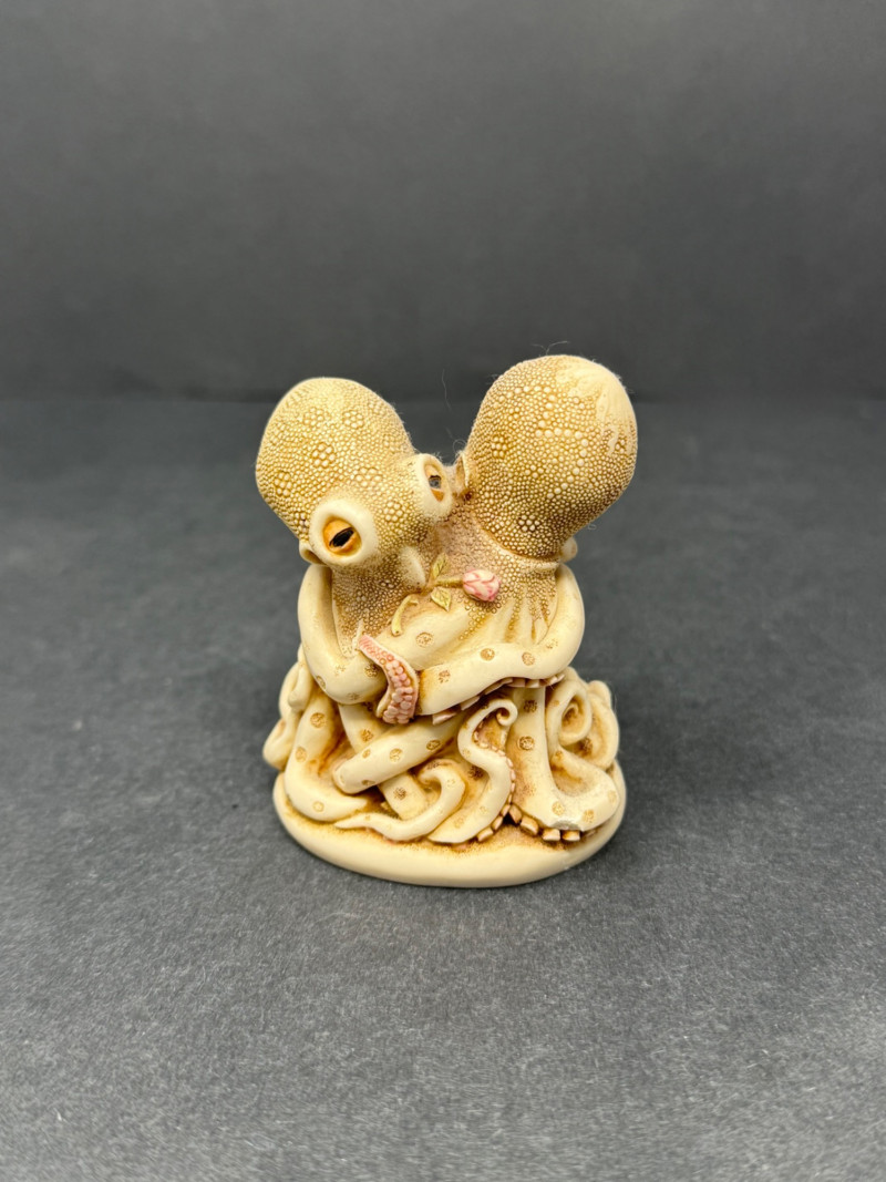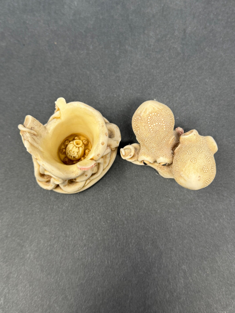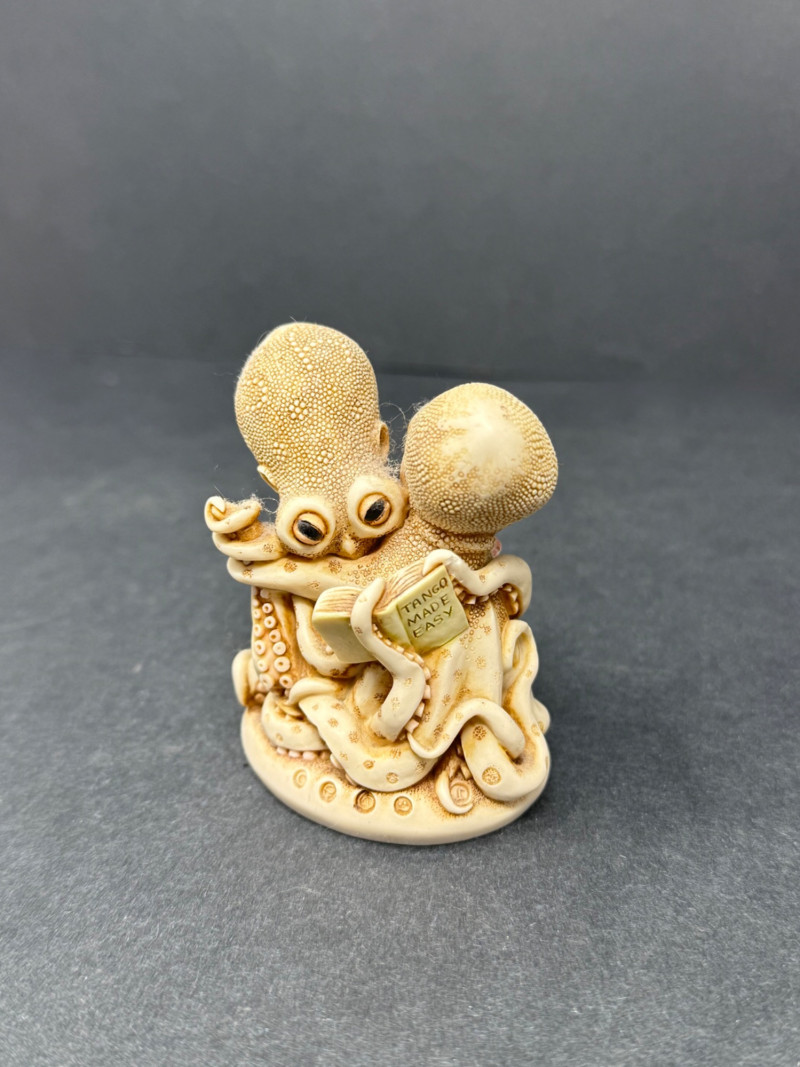 Harmony Kingdom Carved Resin Figurines – "Octopus Couple" & "School of Fish" This charming pair of collectible figurines comes from the acclaimed British brand Harmony Kingdom, known for their intricately detailed, whimsical box figurines crafted in resin with old-world artistry. The Octopus Couple piece features two octopi wrapped affectionately around each other, one holding a book—demonstrating Harmony Kingdom's signature blend of humor, storytelling, and fine craftsmanship. The School of Fish sculpture depicts a lively underwater swirl of golden fish, beautifully layered over coral and stone, showcasing the brand’s skill in textured design and marine life depiction. Product Details: Brand: Harmony Kingdom (marked) Material: Marble resin Finish: Hand-painted ivory-tone with subtle antiquing Dimensions: Condition: Excellent vintage condition; no chips or cracks These are not just figurines—they are miniature sculptures, collectible conversation pieces that reflect Harmony Kingdom’s devotion to quality and character. Ideal for ocean lovers, collectors, or coastal decor accents.