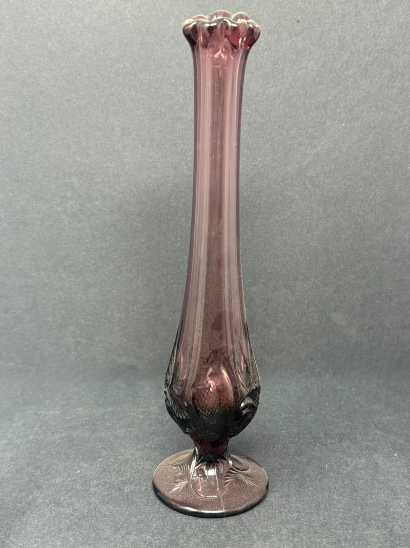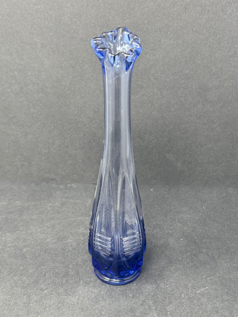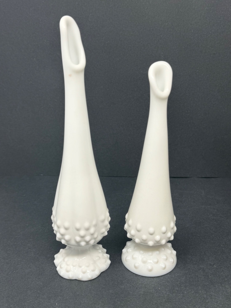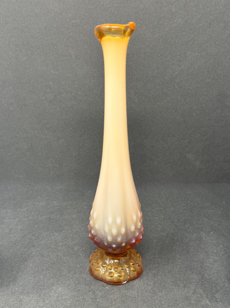 Collection of 5 Vintage Glass Bud Vases – Hobnail & Art Glass Styles Elevate your shelf or tablescape with this curated assortment of five vintage glass bud vases, each with its own unique color and texture. From delicate hobnail milk glass to hand-blown art glass in rich jewel tones, this set offers charming variety and timeless appeal. Set Includes: Two White Milk Glass Hobnail Vases – Likely Fenton or L.E. Smith; classic ruffled tops and textural detailing (approx. 8.5” H) Peach & Amber Ombre Hobnail Vase – Elegant color fade with raised hobnail base (approx. 9” H) Amethyst Swirl Glass Vase – Deep purple tone with ruffled rim and optic swirl body (approx. 9.25” H) Cobalt Blue Ruffle Vase – Clear glass with light ribbing and fluted top; brilliant color pop (approx. 8” H) Details: Era: Mid-20th century to late 20th century Materials: Pressed and hand-blown glass Condition: Excellent vintage condition, no chips or cracks This set is perfect for displaying single stems or styled together for a soft, collected look. Ideal for vintage glass collectors or cottagecore decor lovers.