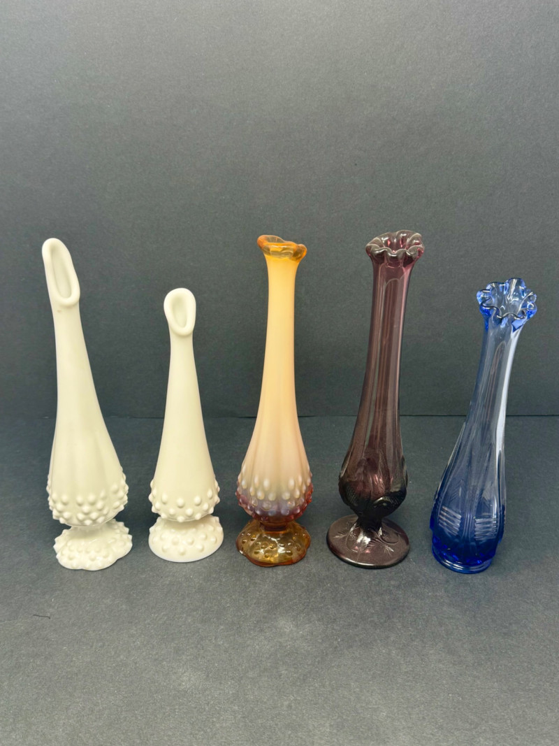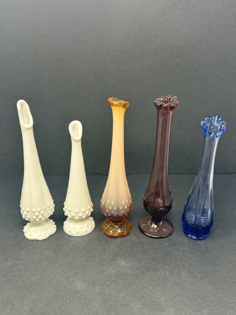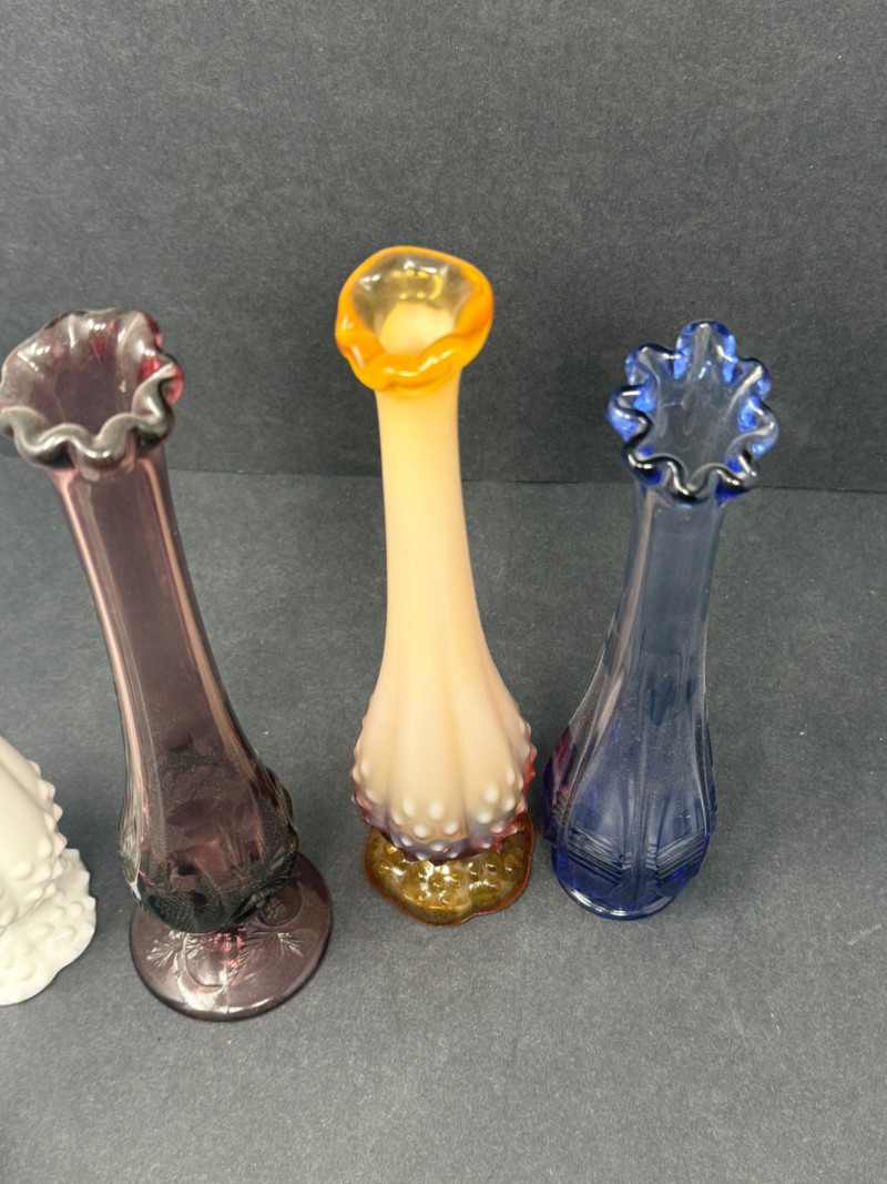 Lot # 87 - Collection of 5 Vintage Glass Bud Vases – Hobnail & Art Glass Styles
