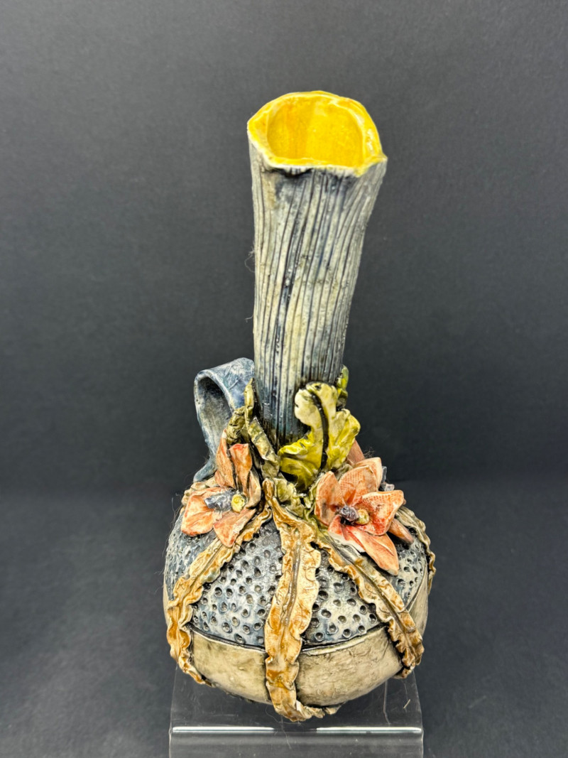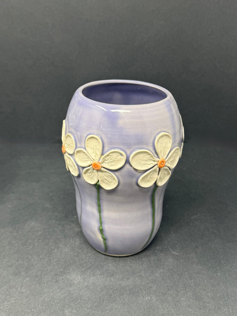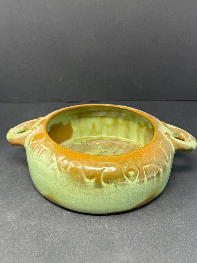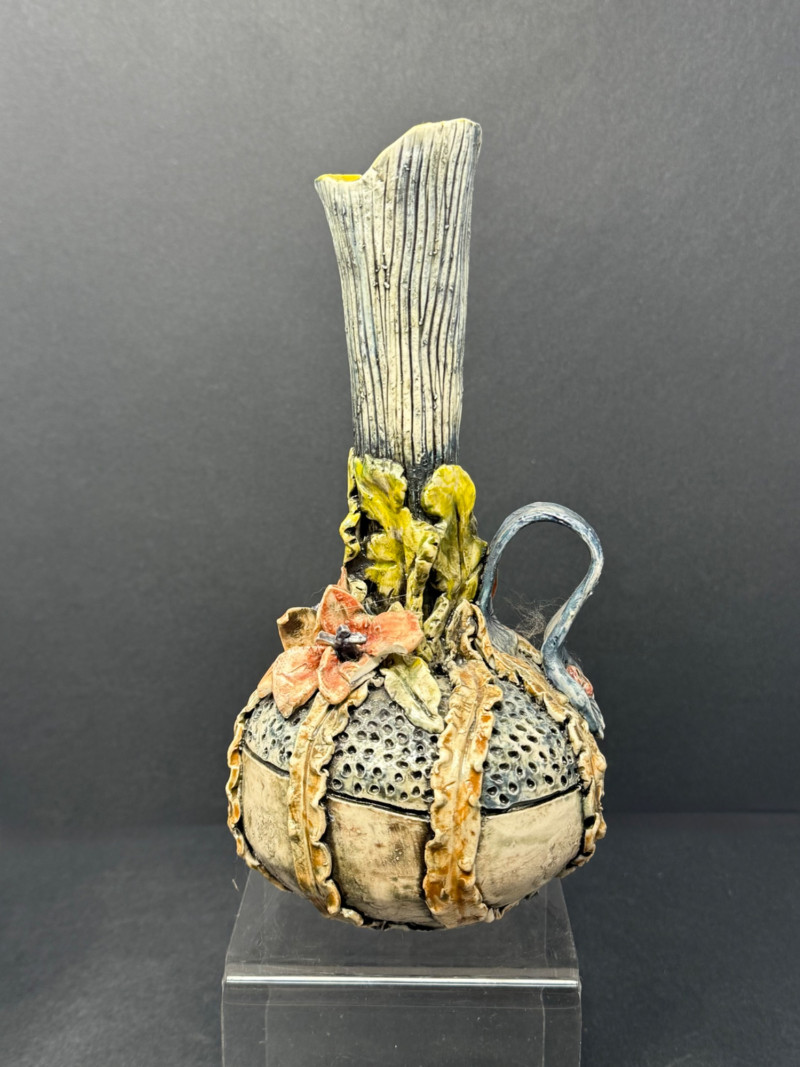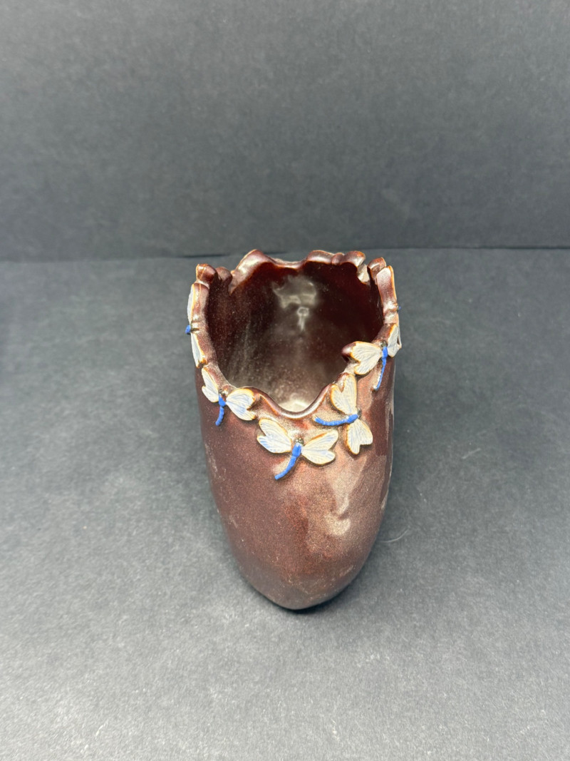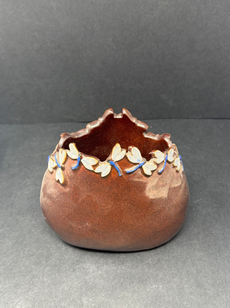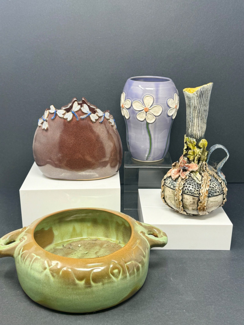 Collection of 4 Studio & Art Pottery Pieces – Sculptural, Whimsical & Handcrafted A one-of-a-kind assortment of hand-thrown and artist-crafted pottery, perfect for collectors, stylists, or those who appreciate tactile design. This set highlights unique forms, glaze techniques, and hand-applied embellishments — from modern whimsical to primitive earthy styles. Set Includes: Handcrafted Dragonfly Motif Vessel (Top Left) – Glossy aubergine glaze with delicate raised dragonflies circling the rim; contemporary artisan design (approx. 5.5” H x 6.5” W) Lavender Vase with White Flowers (Top Center) – Smooth satin glaze and dimensional floral appliqué; signed studio pottery (approx. 6.25” H) Sculptural Mixed Media Pitcher (Top Right) – Textural bark-like spout and ornate body featuring florals and ribbons in earth tones; striking and sculptural (approx. 7.25” H) Green & Ochre Studio Bowl with Incised Text (Front) – Rustic matte glaze with carved lettering around rim; wide and shallow with double handles, excellent centerpiece or planter (approx. 3” H x 8” W) Details: Mediums: Ceramic, hand-thrown and sculpted Condition: All pieces in excellent vintage or studio condition with intentional glaze and surface variations Dimensions: Range from 3” to 7.25” high and up to 8” wide
