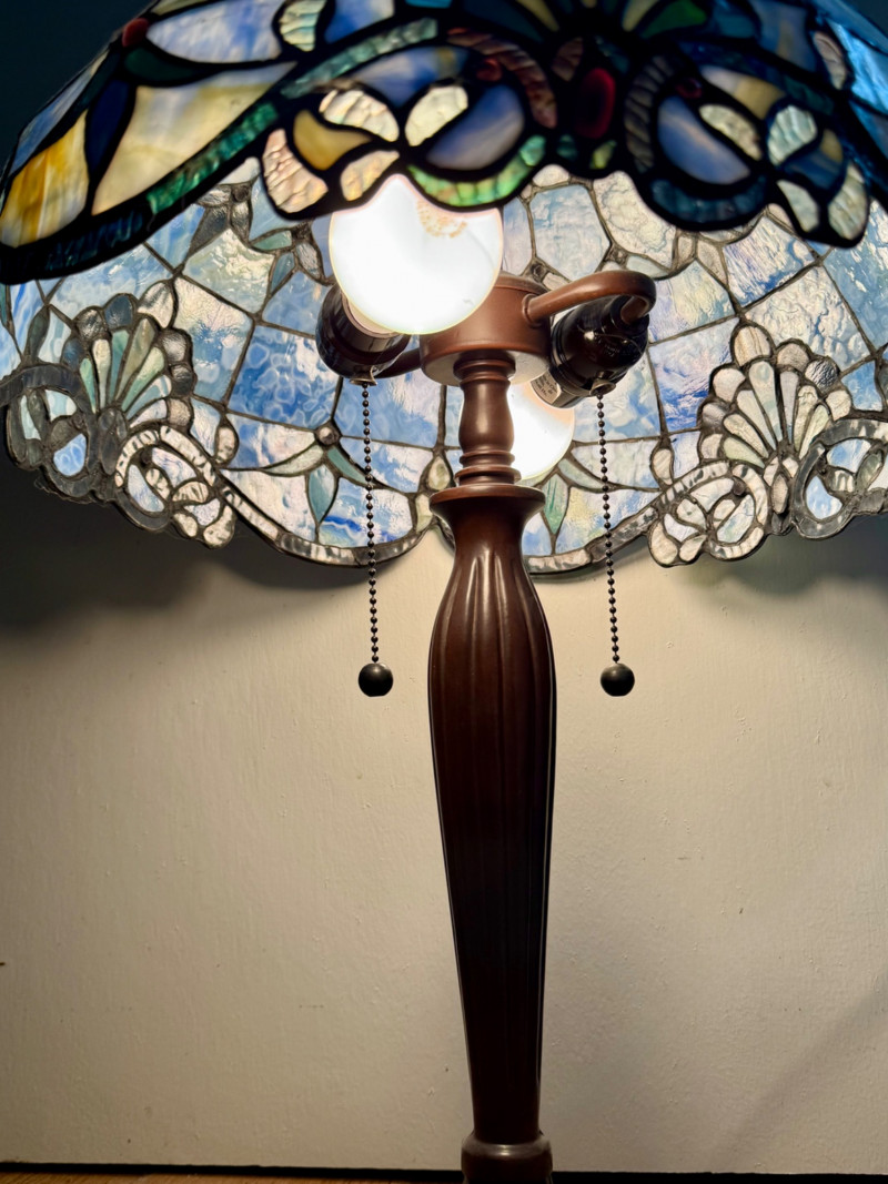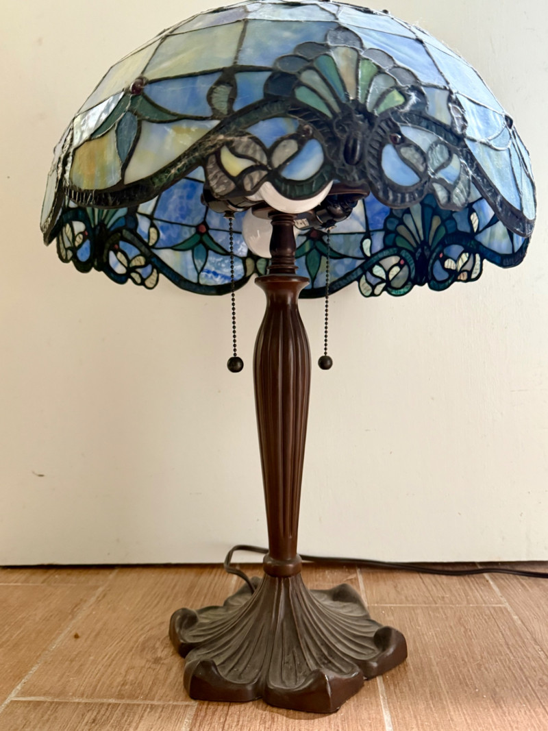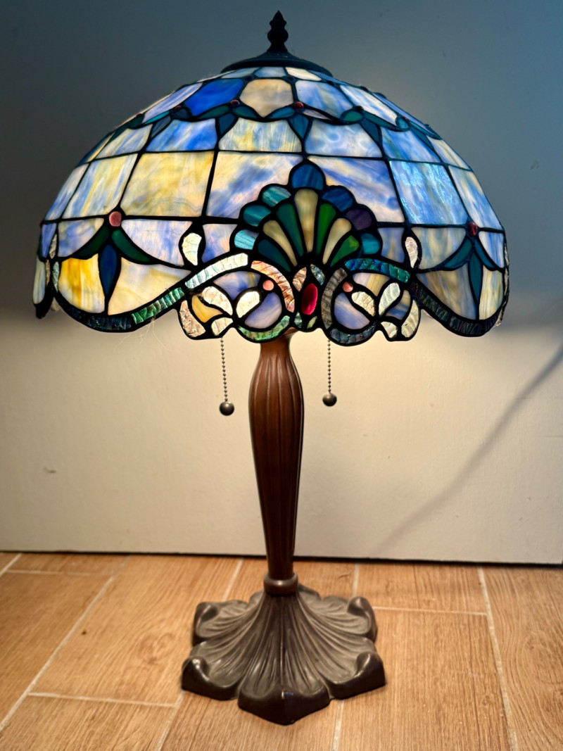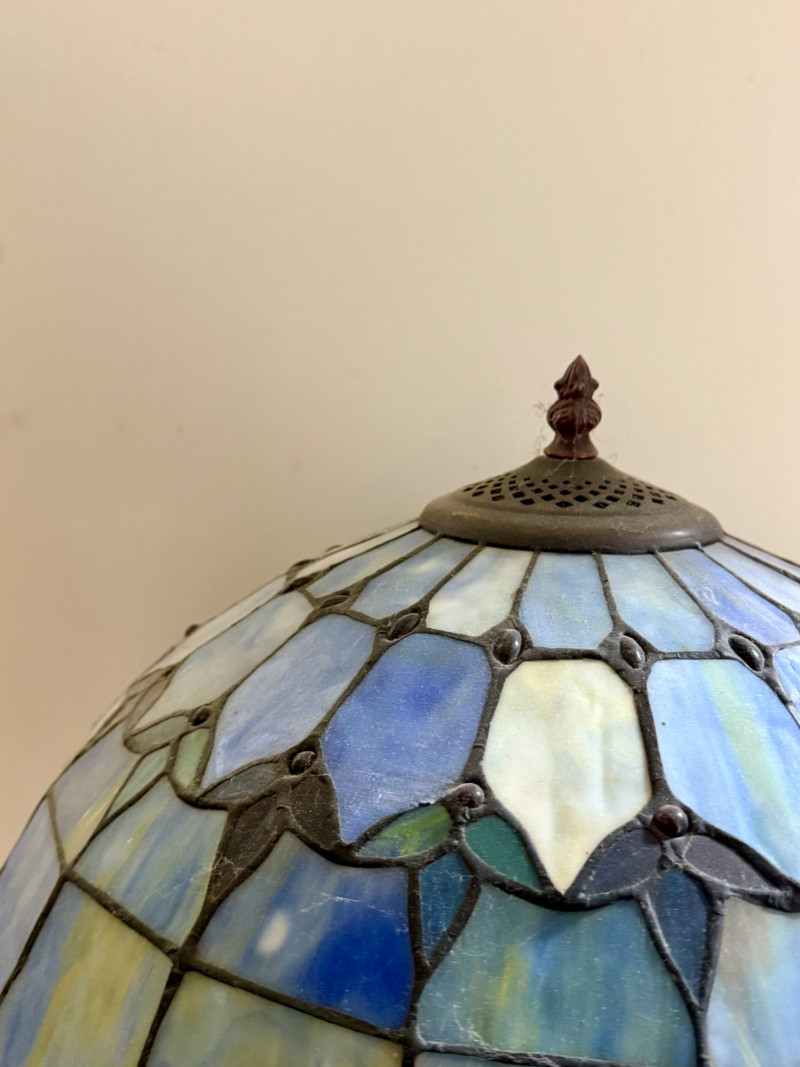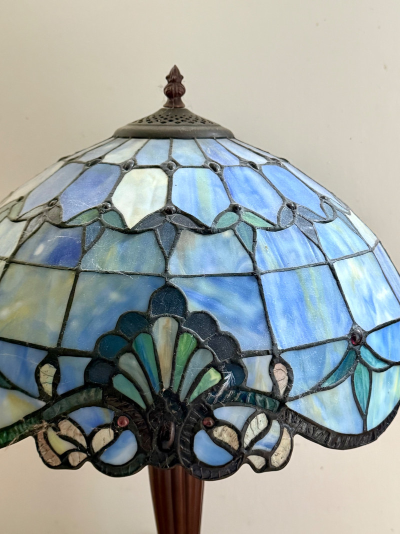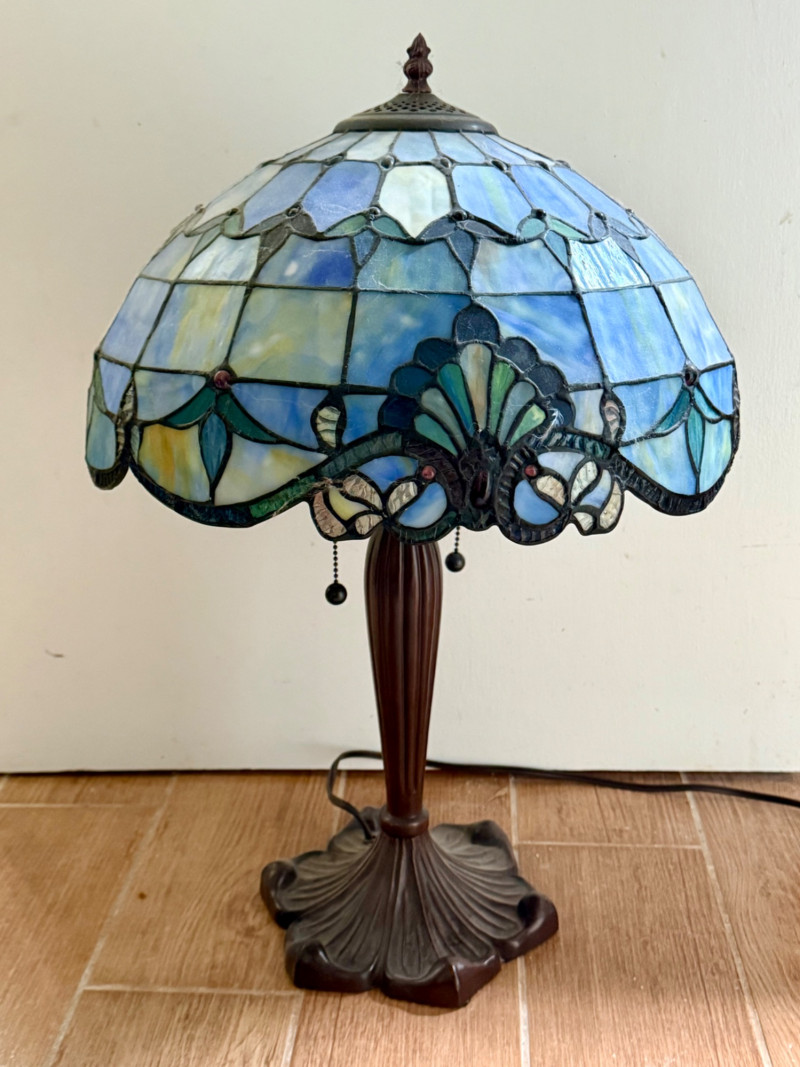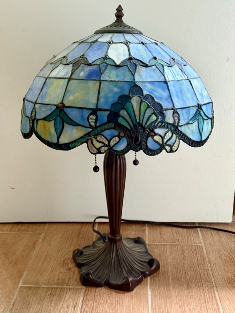 Blue Stained Glass Tiffany-Style Table Lamp – Art Nouveau Floral Base A stunning Tiffany-style stained glass table lamp featuring an elegant array of cool blue, seafoam, and ivory glass panes arranged in a scalloped Art Nouveau pattern. The dome-shaped shade is adorned with intricate leaded detailing and a shell-like motif that evokes classic early 20th-century design. The ornate base is cast in a deep bronze-tone metal with a petal-style platform and vertical ribbed column, perfectly complementing the stained glass artistry above. Dual pull chains offer convenient function with traditional charm. Details: Style: Tiffany-style, Art Nouveau Materials: Stained glass, metal Function: Dual bulb sockets with pull chains Dimensions: Approx. 22” H x 16” W (shade diameter) Condition: Excellent working vintage condition with minor surface wear consistent with age This lamp is a statement piece for any traditional, eclectic, or vintage-inspired interior—ideal for bedside, study, or living room ambiance.