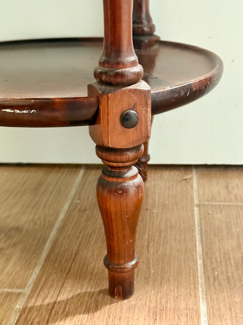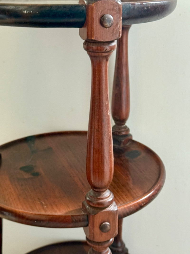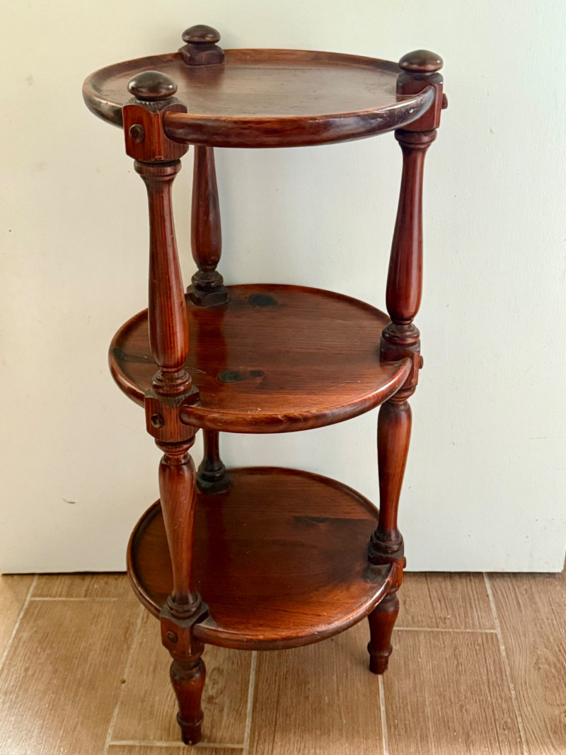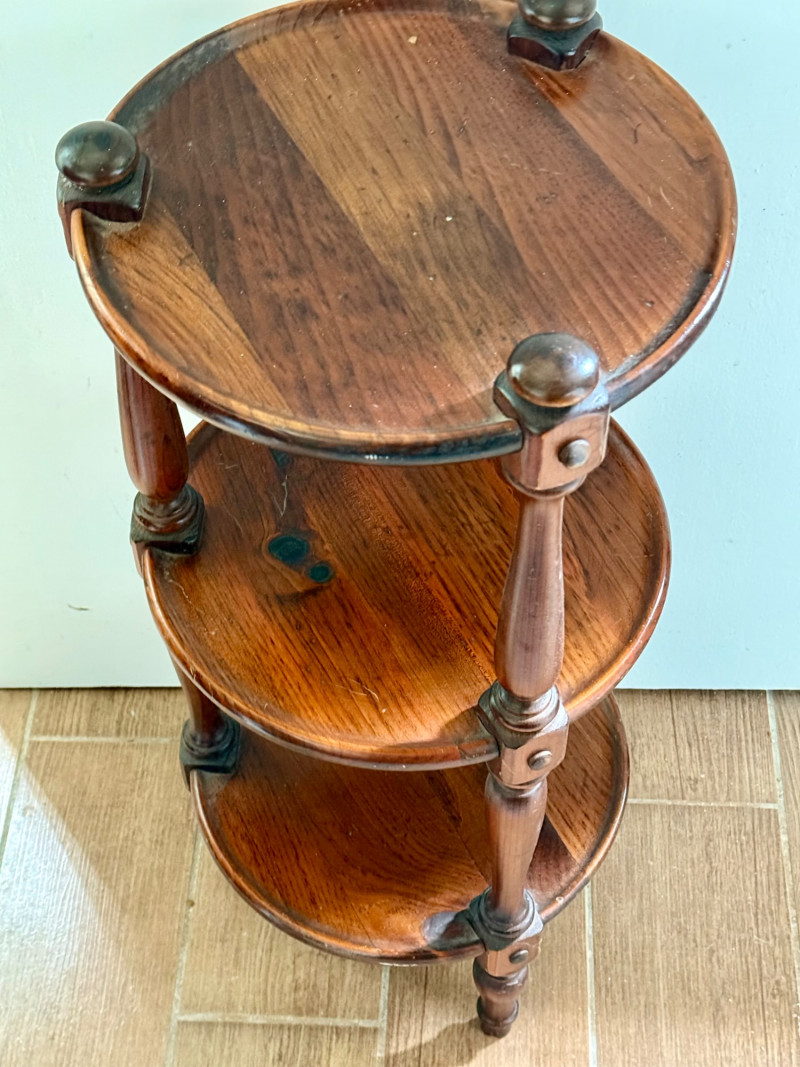 Ethan Allen Old Tavern Collection Pine 3-Tier Etagere Table – Circa 1970s A classic piece from the Ethan Allen Old Tavern Collection, this three-tier stand exemplifies early American craftsmanship with timeless elegance. Crafted from solid pine, it features beautifully turned legs and rounded shelves, ideal for displaying books, plants, or curios. Era: 1970s Material: Solid pine Dimensions: Approx. 27.5” H x 14” W (each shelf 11.5” diameter) Condition: Excellent vintage condition with minimal surface wear consistent with age. Structurally sound and rich in patina. A rare and desirable accent table that brings warmth and heritage to any space.