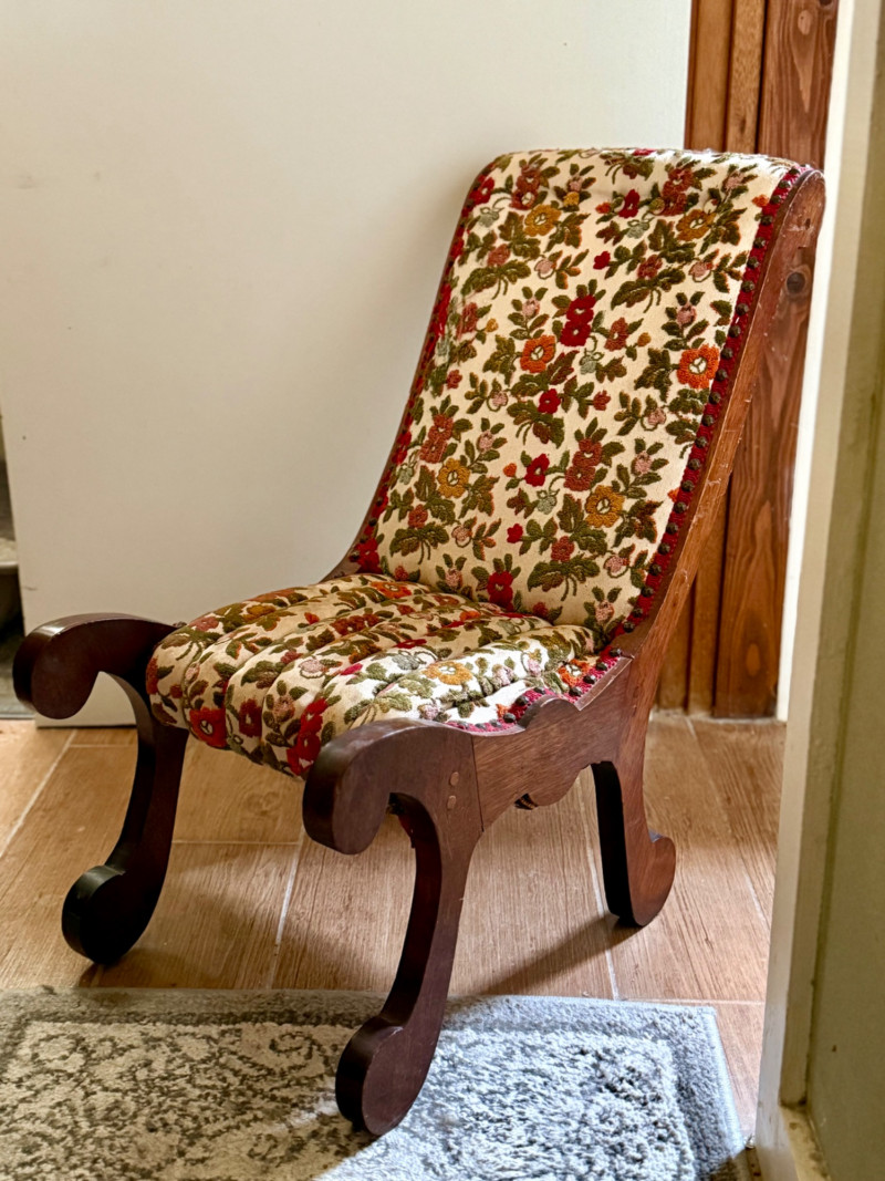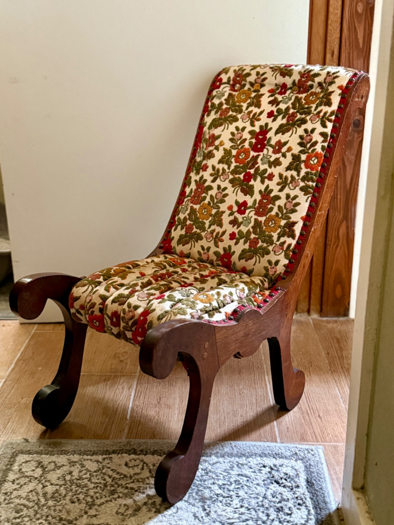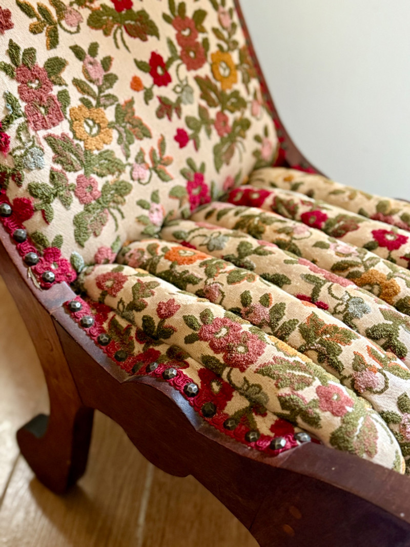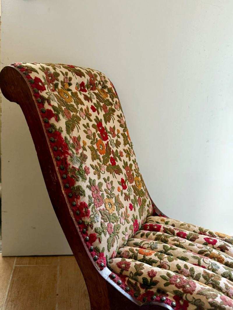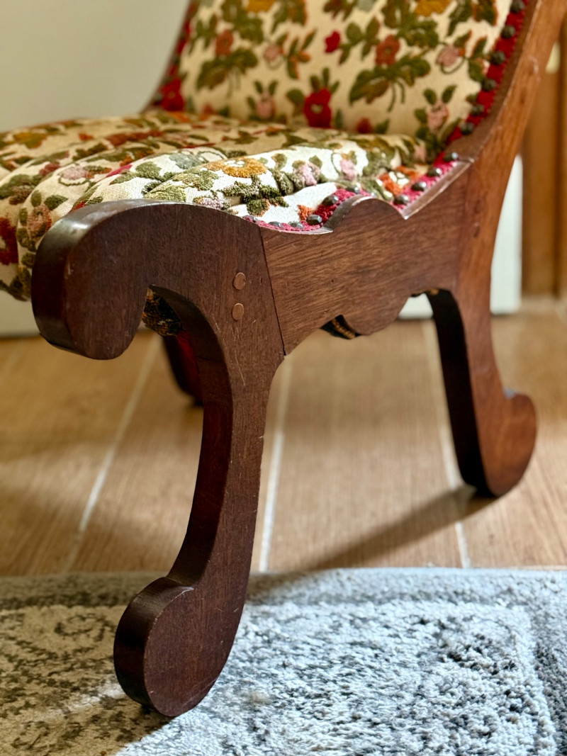 Victorian-Style Slipper Chair – Floral Tapestry & Carved Wood Frame An elegant vintage slipper chair in the style of Victorian parlor seating, featuring a richly carved hardwood frame and plush floral tapestry upholstery. This piece exudes old-world charm, ideal as an accent chair in a curated space. Details: Inspired by classic Victorian slipper chairs Vibrant floral needlepoint-style upholstery with red trim Gracefully curved silhouette with scrolled legs and sturdy hardwood construction Comparable models have sold at auction as authentic Victorian slipper chairs Approximate Dimensions: Condition: Good vintage condition. Upholstery and frame show gentle wear consistent with age. Structurally solid and visually striking. Style Notes: Adds instant vintage warmth to bedrooms, dressing rooms, reading nooks, or eclectic living spaces.