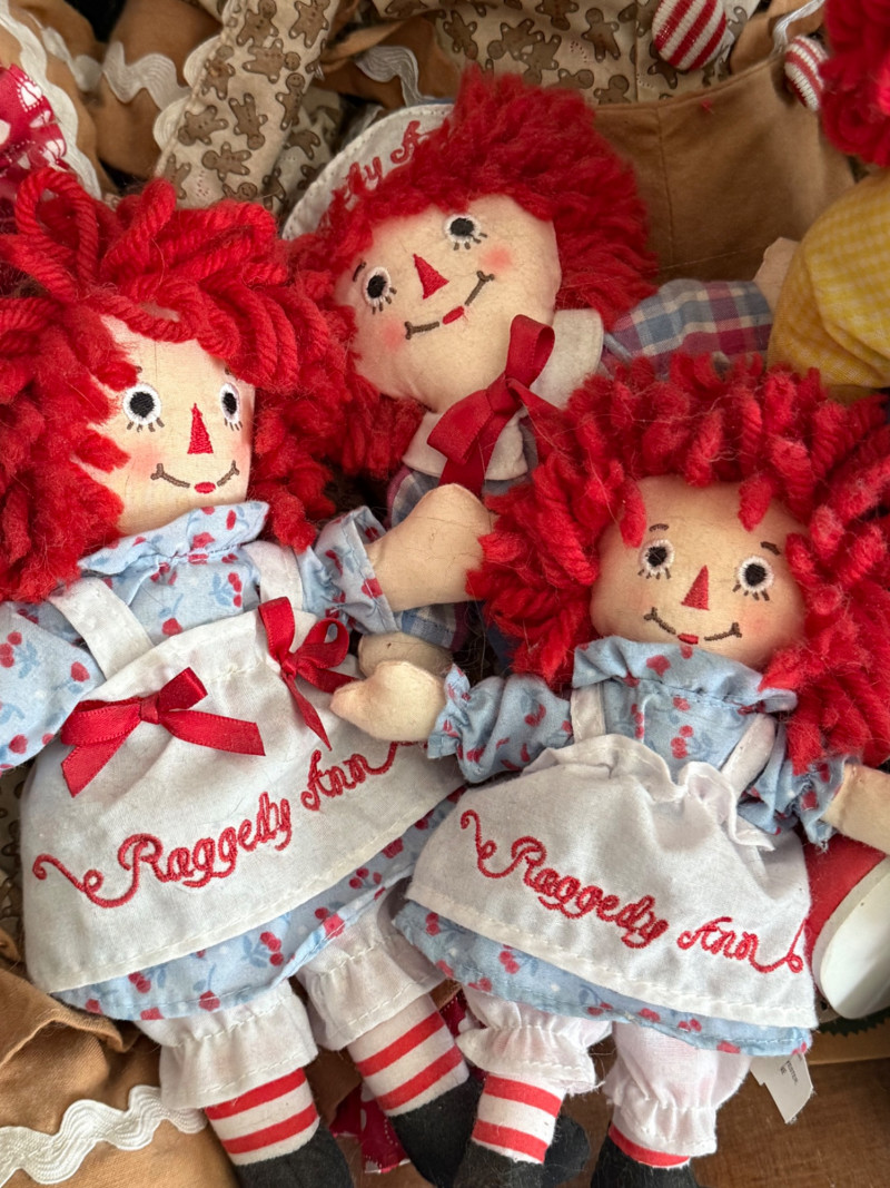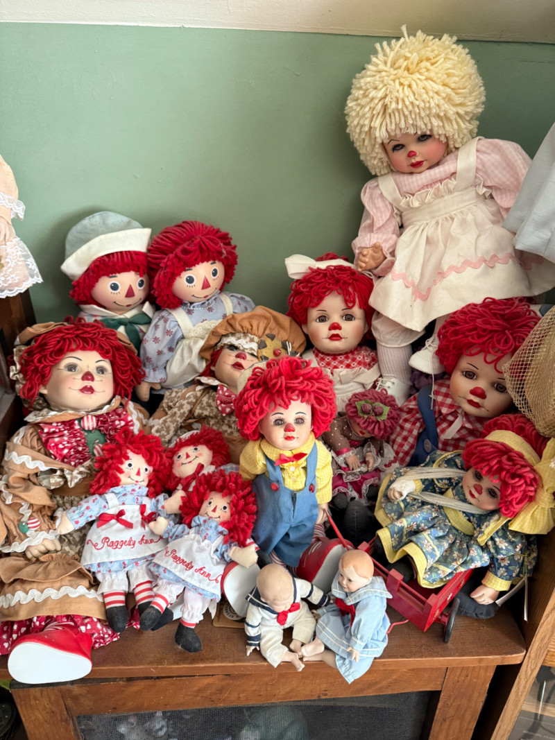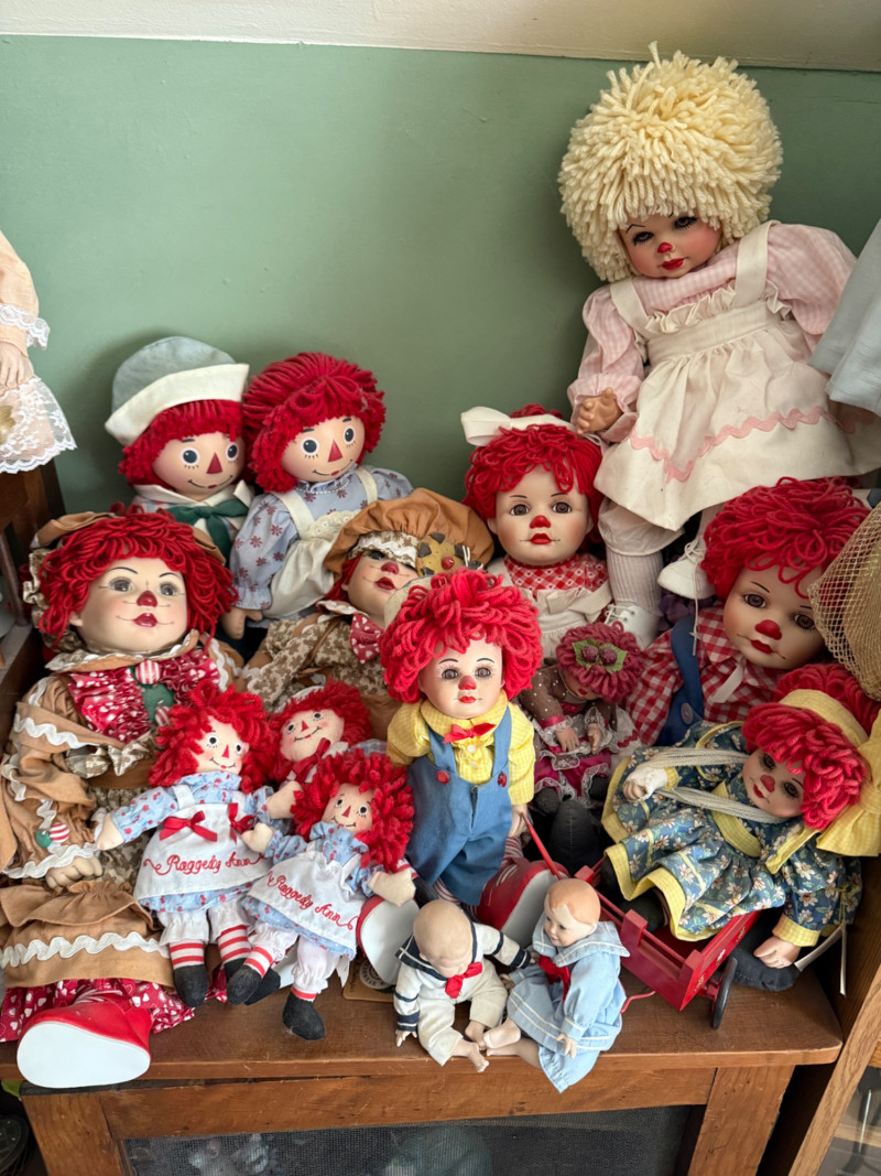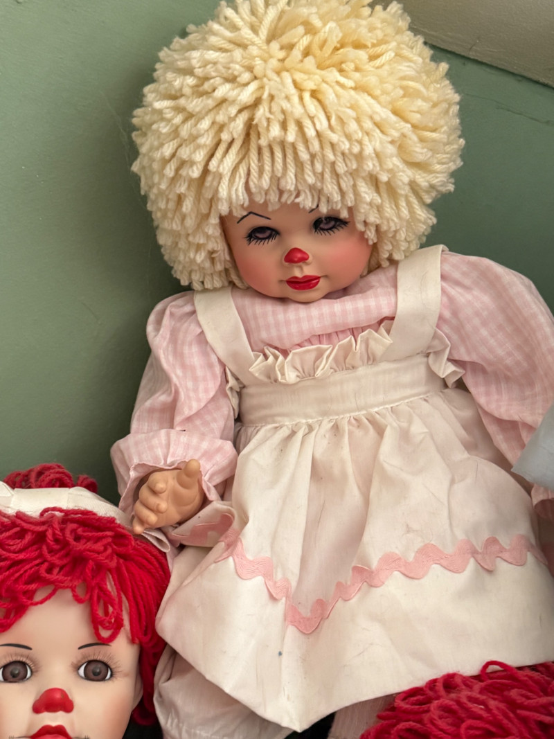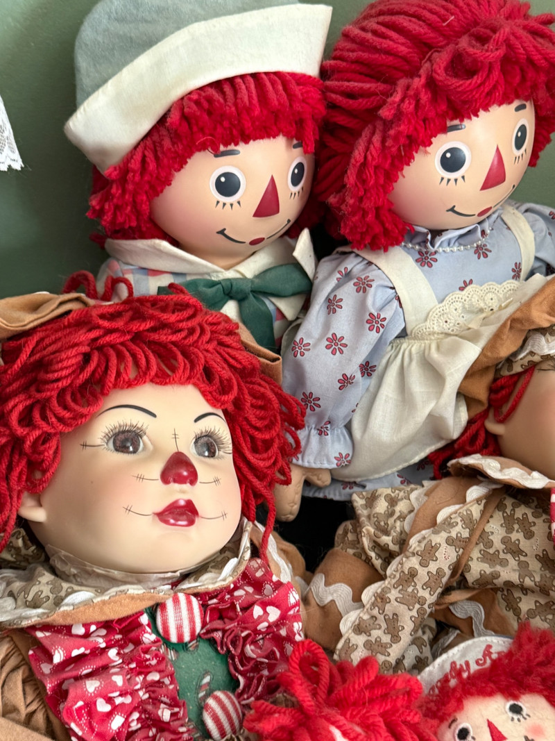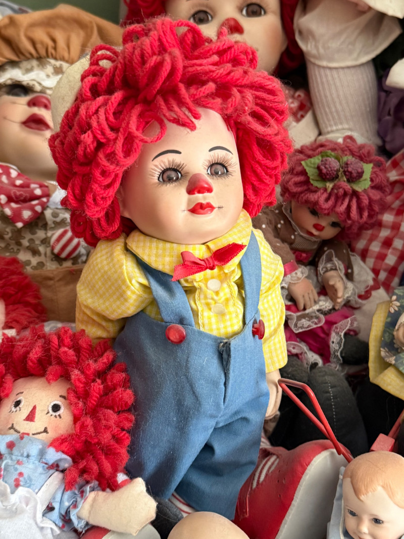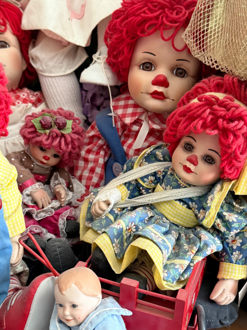Vintage Raggedy Ann & Clown Doll Collection A charming and nostalgic collection of 16 vintage dolls inspired by Raggedy Ann and classic clown motifs. This eclectic group includes soft-bodied rag dolls, porcelain dolls, and composite figures, all featuring the signature red yarn hair and painted faces that make these timeless. Details: Includes Raggedy Ann and Andy-style dolls, clown dolls, and sailor-themed babies Materials: Cloth, porcelain, composite, yarn, and plastic Era: Primarily mid to late 20th century Variety of outfits: overalls, sailor suits, calico dresses, bonnets, and more Approximate size range: 6" to 18" tall Highlights: (2) Classic "Raggedy Ann" soft dolls with embroidered branding (1) Large yarn-headed clown in pink pinafore (2) Porcelain-faced sailor twins (1) Doll in a red wagon (1) Porcelain doll with yellow bonnet and floral dress Several detailed hand-painted faces and vintage-style clothing Condition: Good vintage condition overall with minor wear consistent with age and handling. Perfect for collectors, whimsical decor, or nursery displays.