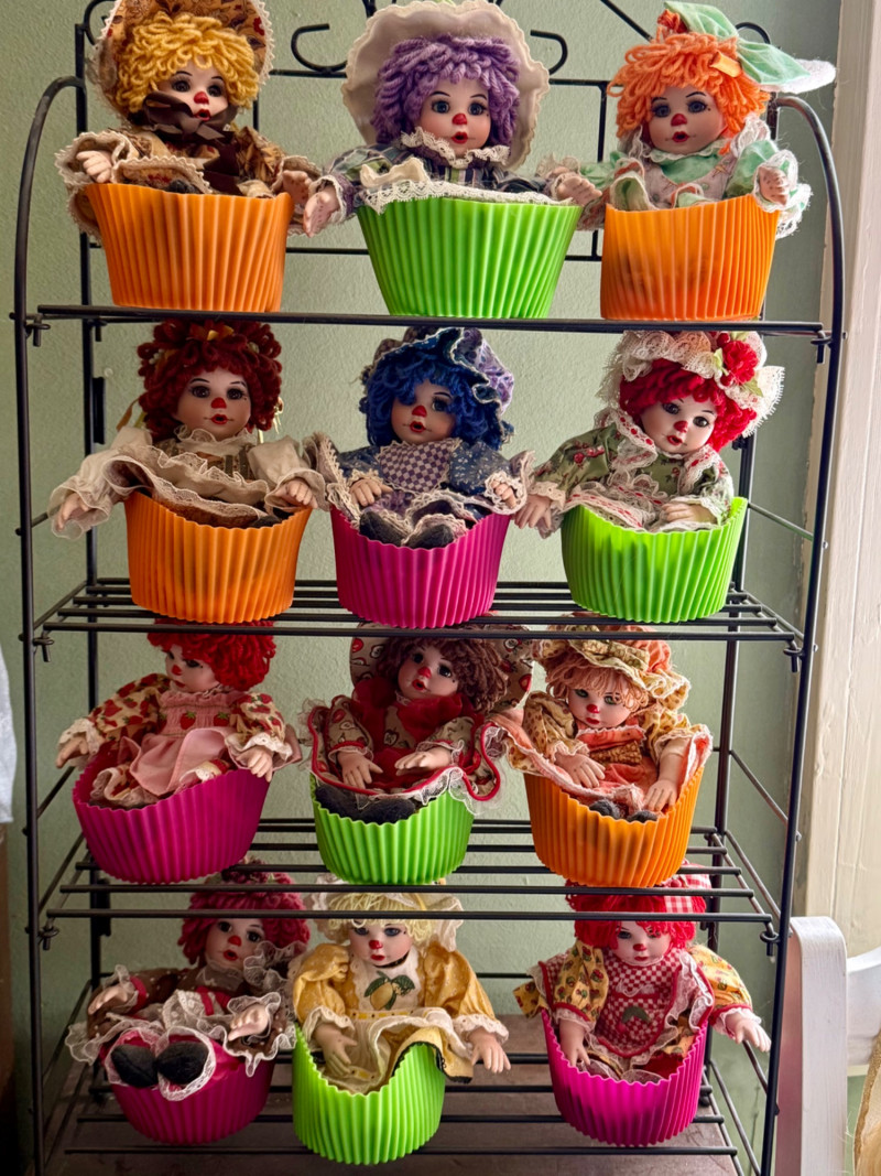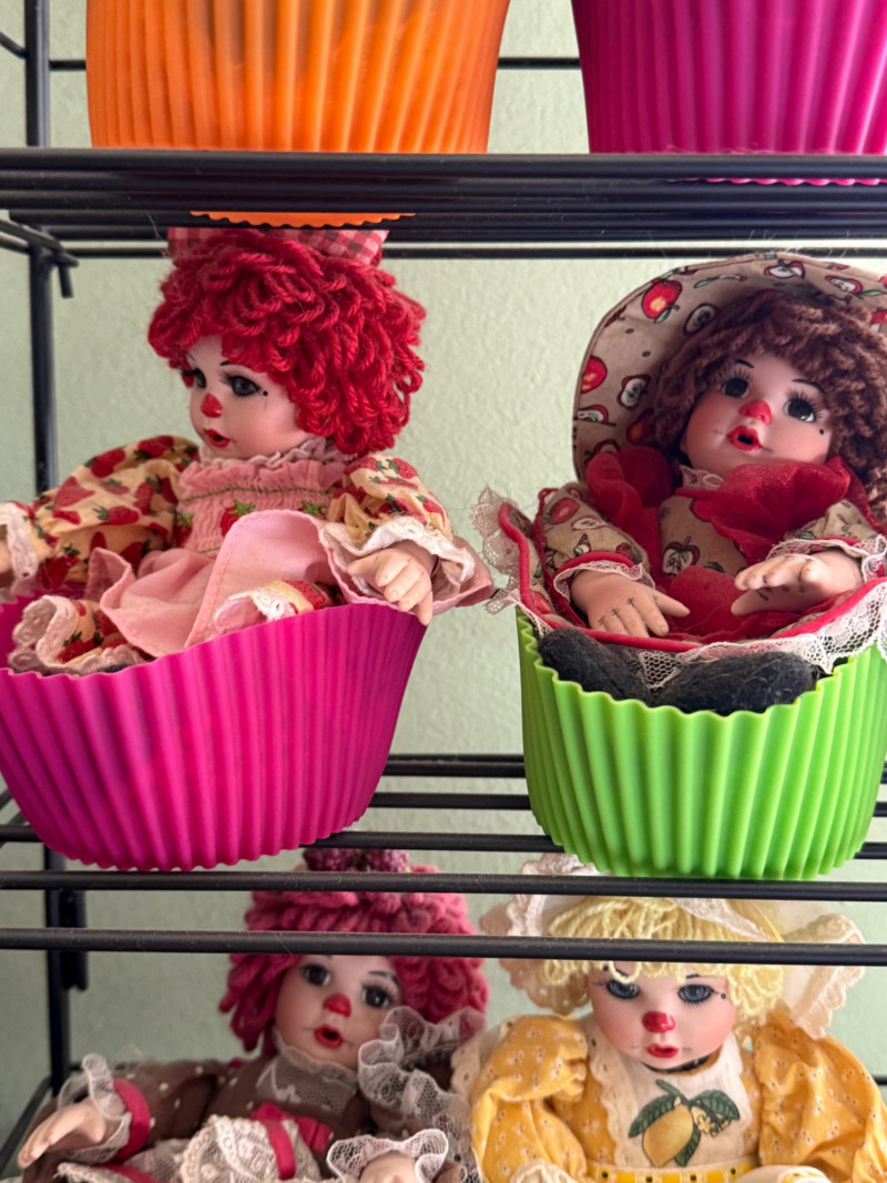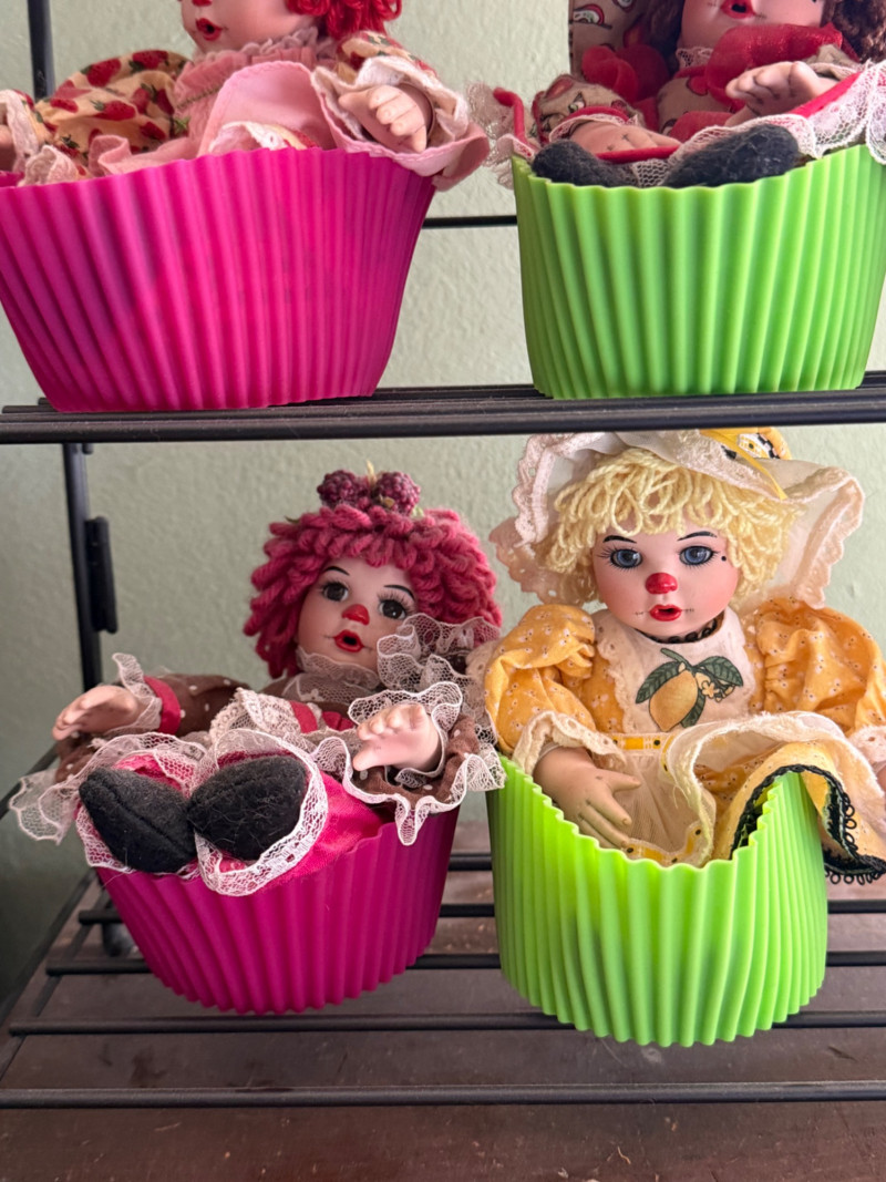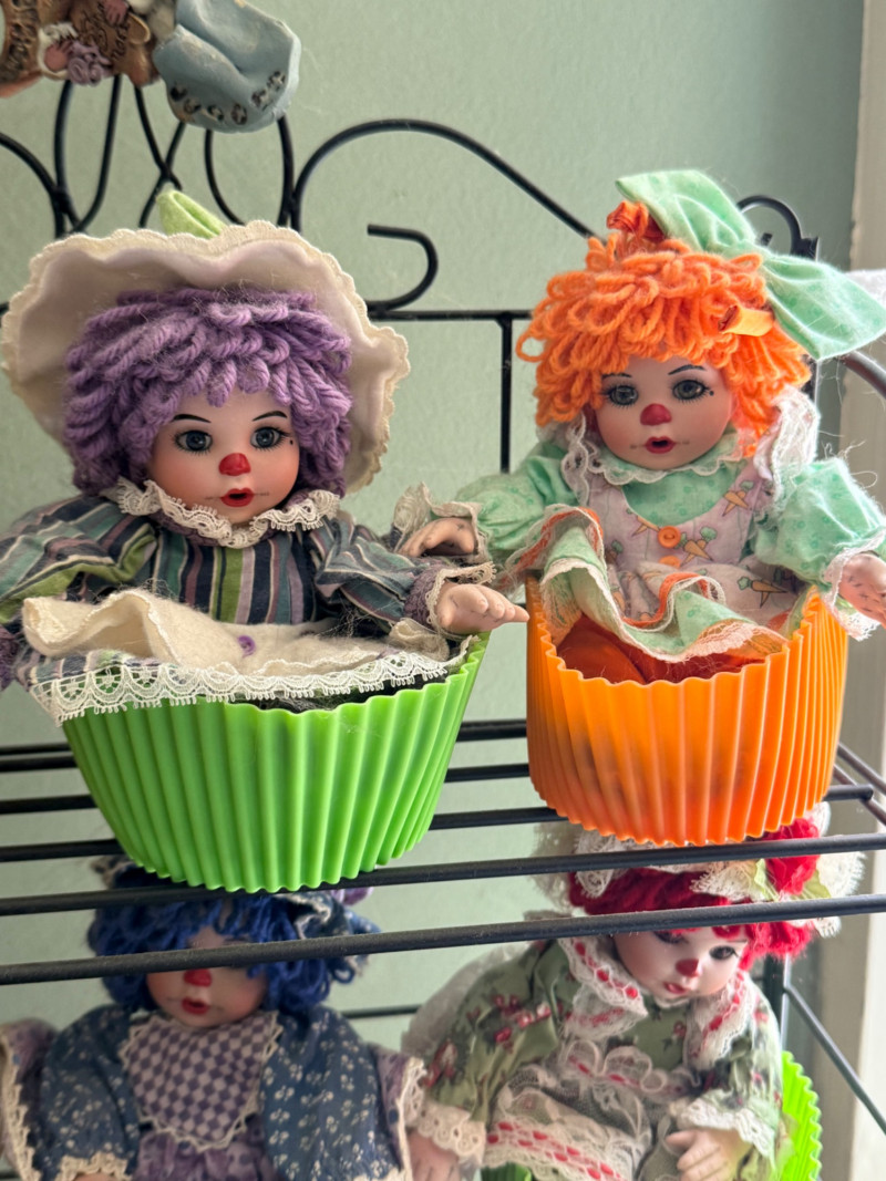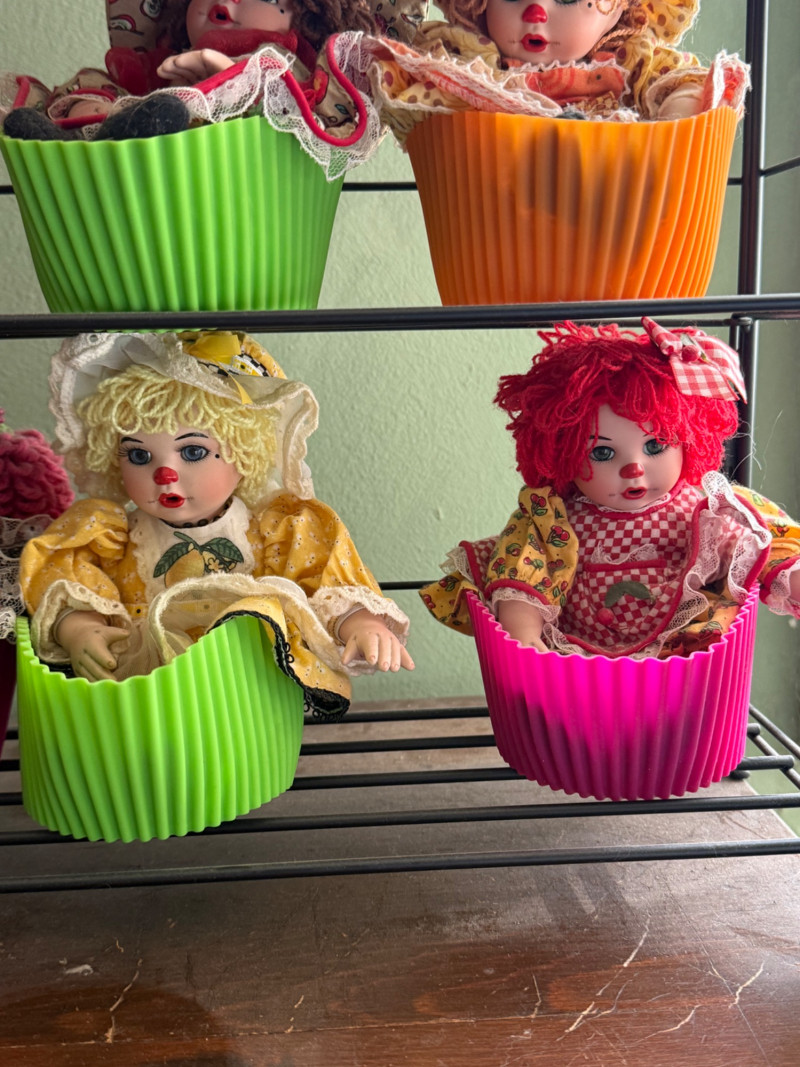 Vintage Clown Cupcake Dolls – Set of 12 in Colorful Silicone Cups An adorable collection of 12 vintage clown dolls cozily seated in oversized silicone “cupcake” holders. Each doll features hand-painted porcelain faces, yarn hair in a rainbow of colors, and charming vintage-style clothing. A fun mix of whimsy and kitsch—perfect for collectors, shelf displays, or playful decor. Details: Quantity: 12 dolls Material: Porcelain heads/hands, cloth bodies, yarn hair Each seated in a flexible silicone cupcake liner (included) Estimated doll height (out of cup): approx. 6–8" Hair colors include: yellow, lavender, orange, red, brown, blue, and more Each outfit features lace, ribbon, florals, gingham, or velveteen Condition: Excellent vintage condition with no cracks or breaks. Minimal wear on fabric from age and display.