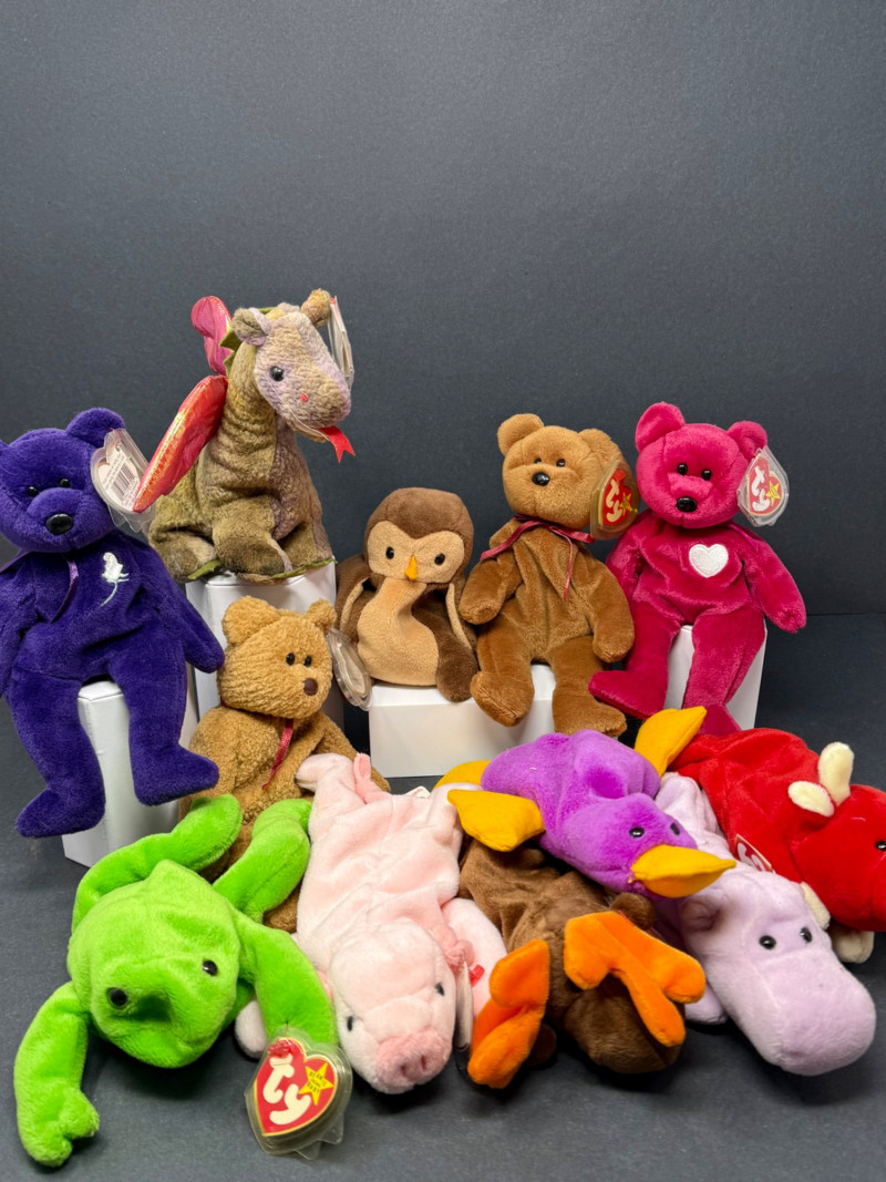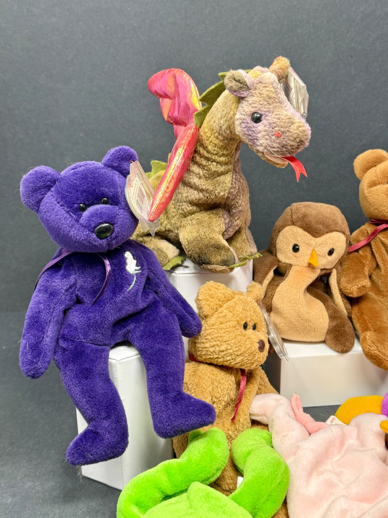 Rare Vintage TY Beanie Babies Lot – 12 Plush Toys with Tags (1990s–2000s) An exciting collector's bundle of 15 original TY Beanie Babies, featuring rare and retired characters from the 1990s and early 2000s. These Beanies include sought-after bears and animals—many with original hang and tush tags intact. Why they’re rare: Includes Princess the Bear, the iconic 1997 memorial edition made in honor of Princess Diana Valentina Bear with heart chest detail – a collectible Valentine’s release Scorch the Dragon – now hard to find with wings intact and tag preserved Early generation animals like Patti, Twigs, and Chocolate with flat, classic body style Many are retired, no longer in production, and increasingly rare to find in good condition with tags What’s included: 12 original TY Beanie Babies Includes bears, mythical creatures, and classic animals With original hang tags, some with tag protectors Condition: Excellent vintage condition No odors or major damage Minor wear consistent with age Dimensions: Perfect for serious collectors, nostalgic 90s kids, or anyone looking to start a rare TY collection.