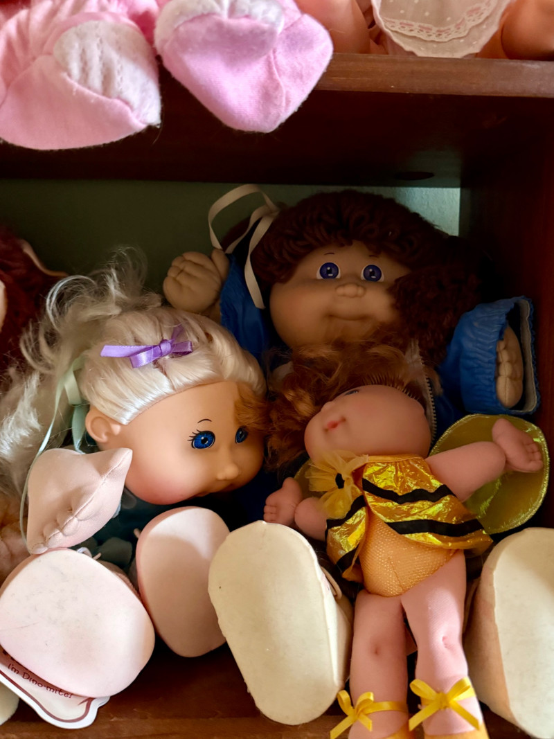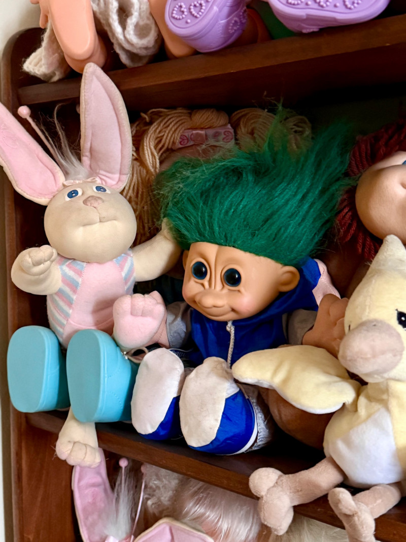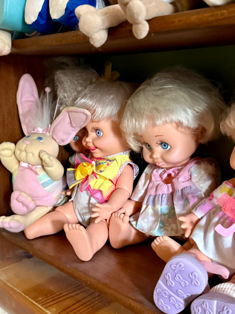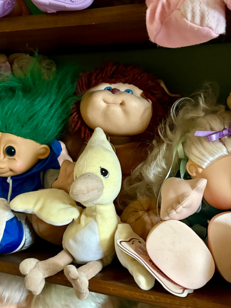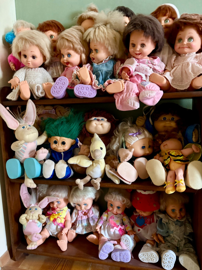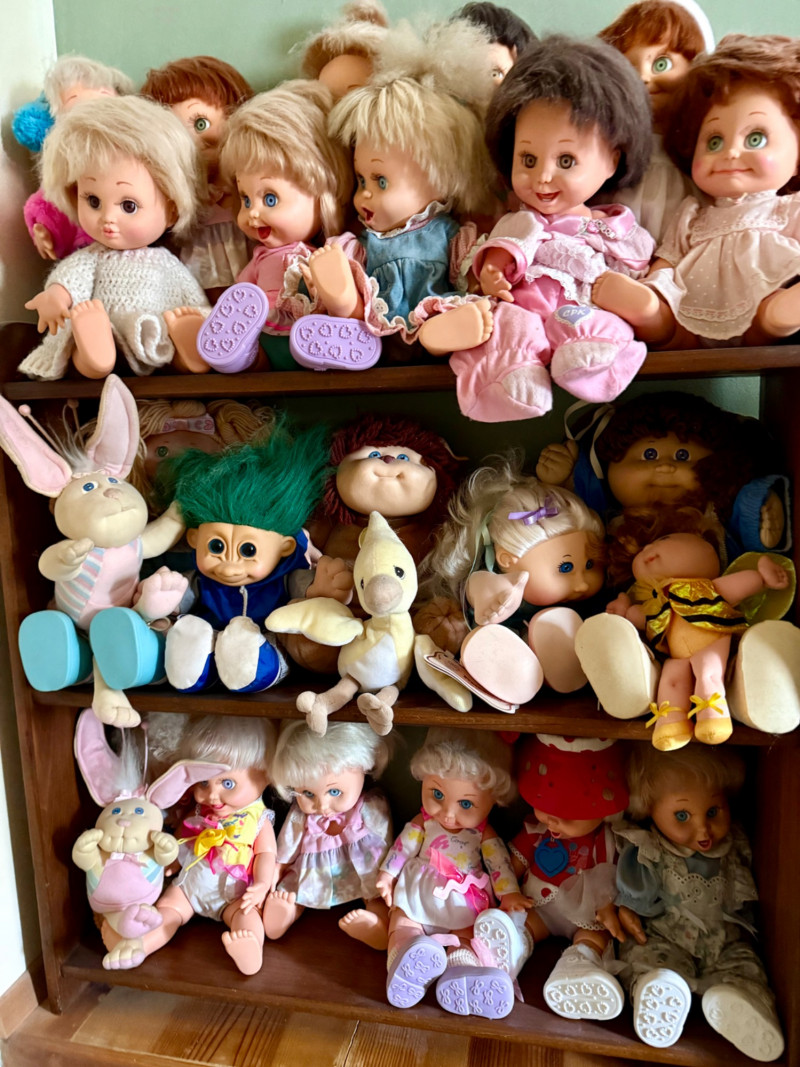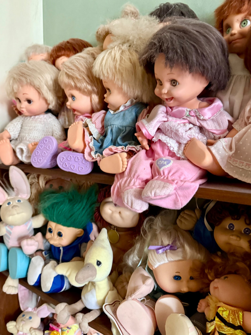Vintage Doll Collection – Mixed 1980s & 1990s Plush and Vinyl Dolls Charming assortment of vintage dolls, primarily from the 1980s and 1990s, featuring soft-bodied plush and vinyl figures with classic painted or rooted hair and expressive faces. This nostalgic grouping includes iconic styles and recognizable characters from the golden age of toy design. Details: A mix of plush and hard vinyl dolls in vintage outfits, many with original features and accessories Includes baby dolls with sculpted shoes, popular molded face styles, and yarn or synthetic hair Some characters may be recognizable from brands like Mattel, Playmates, or CPK-style dolls Includes plush animals, trolls, and fantasy-themed companions perfect for play or display Condition: Good vintage condition with some wear appropriate for age No major staining or damage Ideal for collectors, decorators, or nostalgic gifting Dimensions: This curated collection captures the sweetness of 80s/90s childhood and makes a whimsical addition to any vintage toy shelf or nursery décor.