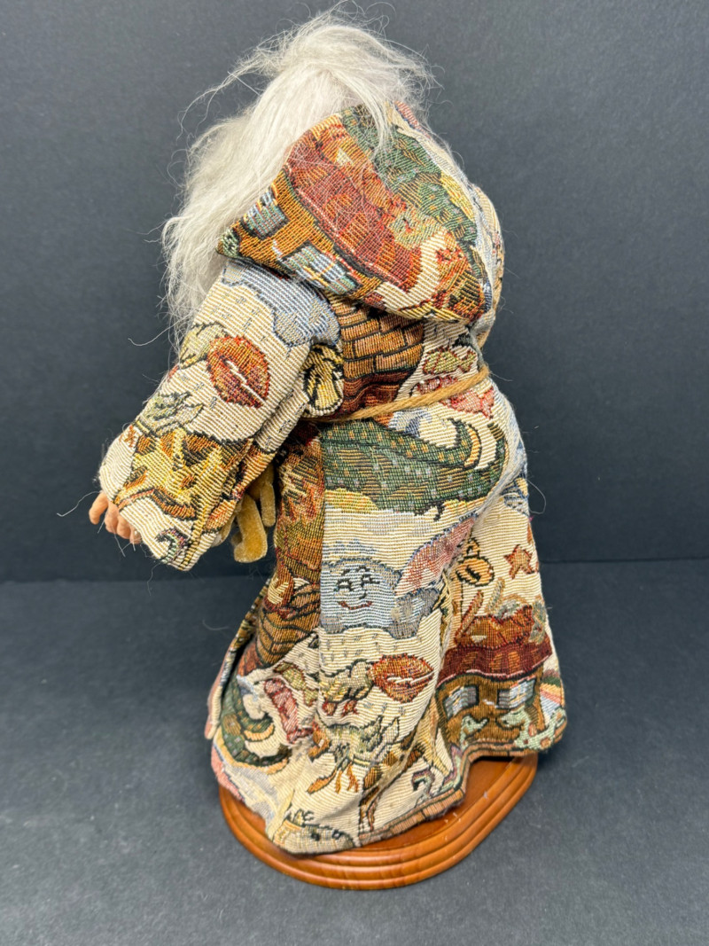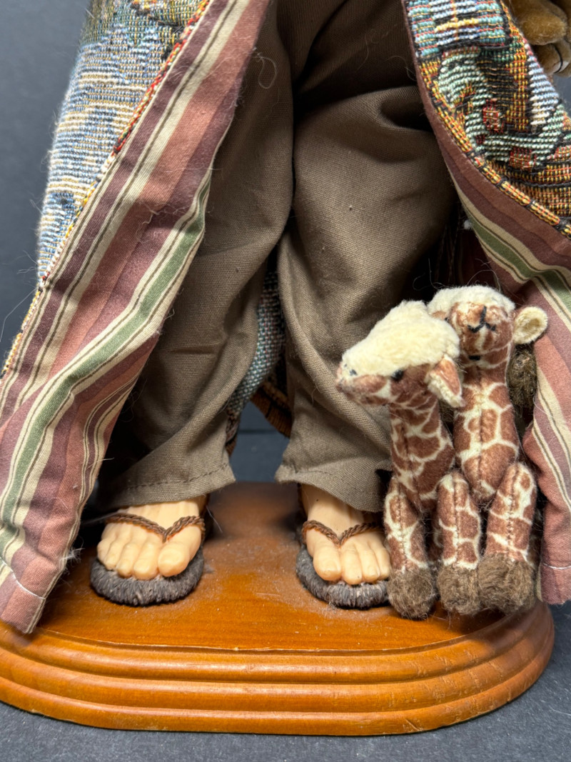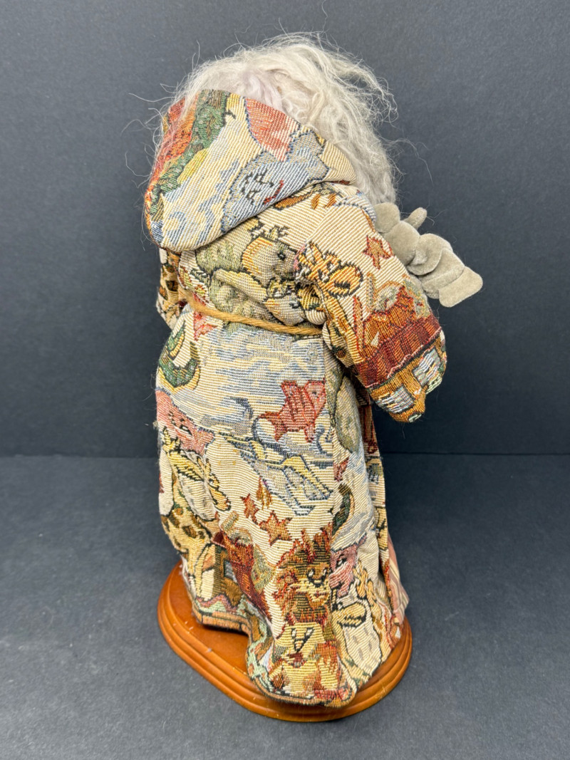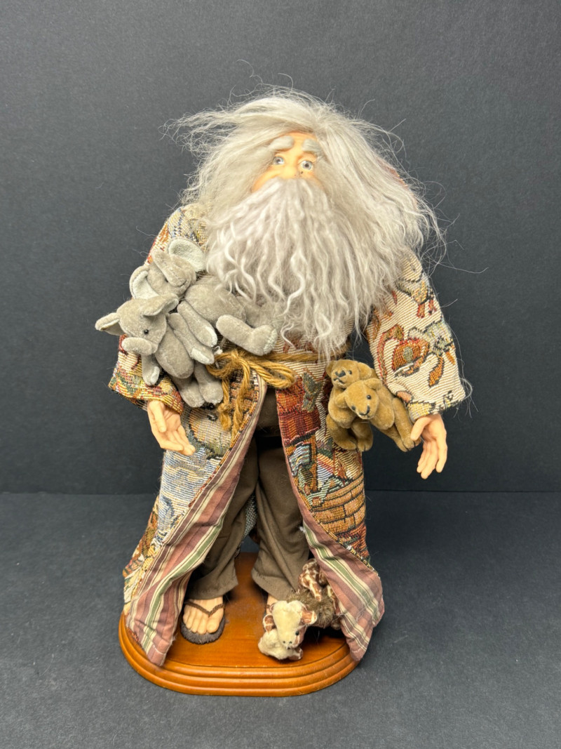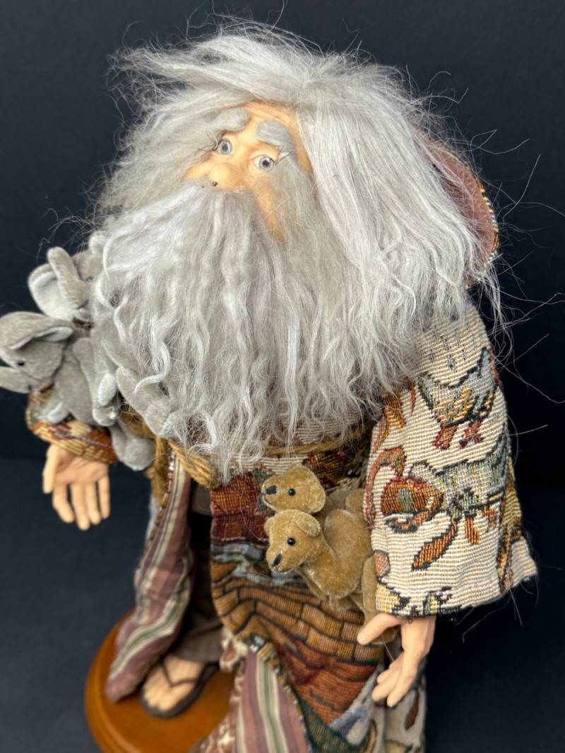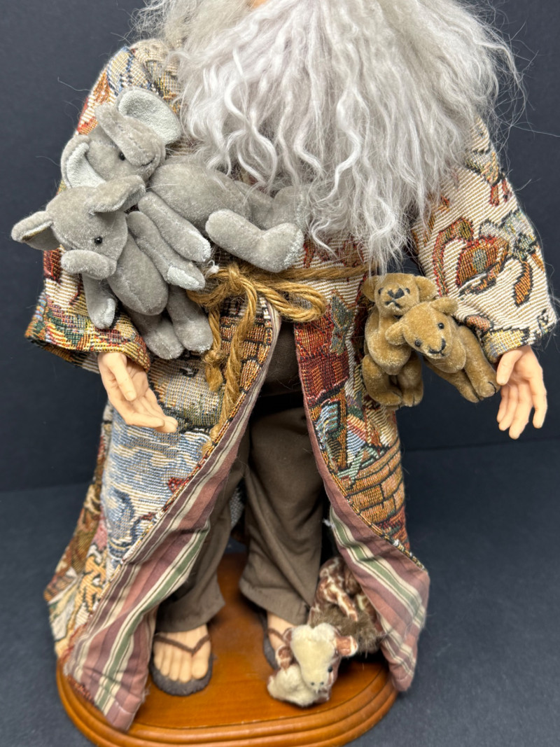 Vintage 1980s Boyds “Noah” Figurine – Two by Two Collection (#582) This whimsical and rare Boyds Bears “Noah” Figurine from the beloved Two by Two collection is a standout collectible from the 1980s. Handcrafted with meticulous detail, Noah wears a richly woven tapestry robe and carries an armful of plush animal pairs, symbolizing the biblical tale. This is a low-numbered edition (#582) from the original numbered handmade series. Details: Brand: Boyds Bears Series: Two by Two – Noah Figurine Handmade, numbered collectible (#582) Features plush animals: elephants, camels, mice, and giraffes Mounted on solid wood base Estimated size: approx. 15” H x 8” W x 6” D This piece is a beautiful example of Boyds' early craftsmanship and storytelling charm. A rare find for collectors of vintage Boyds Bears, art dolls, or biblical-inspired folk art.