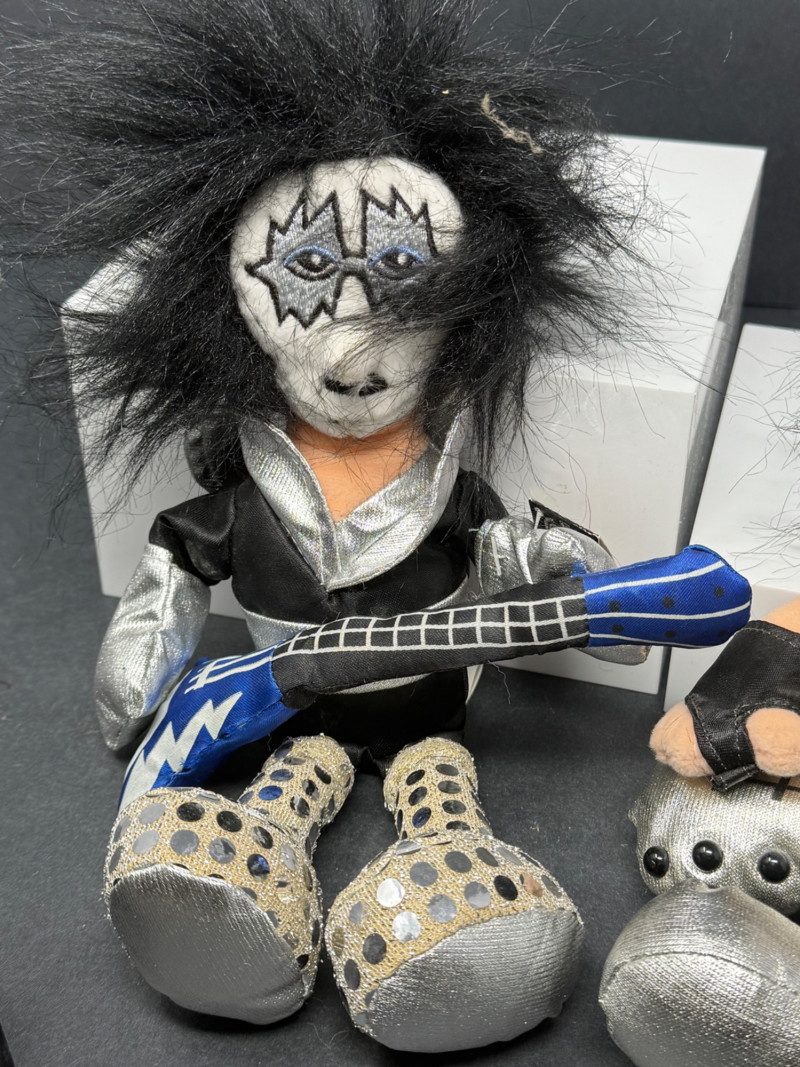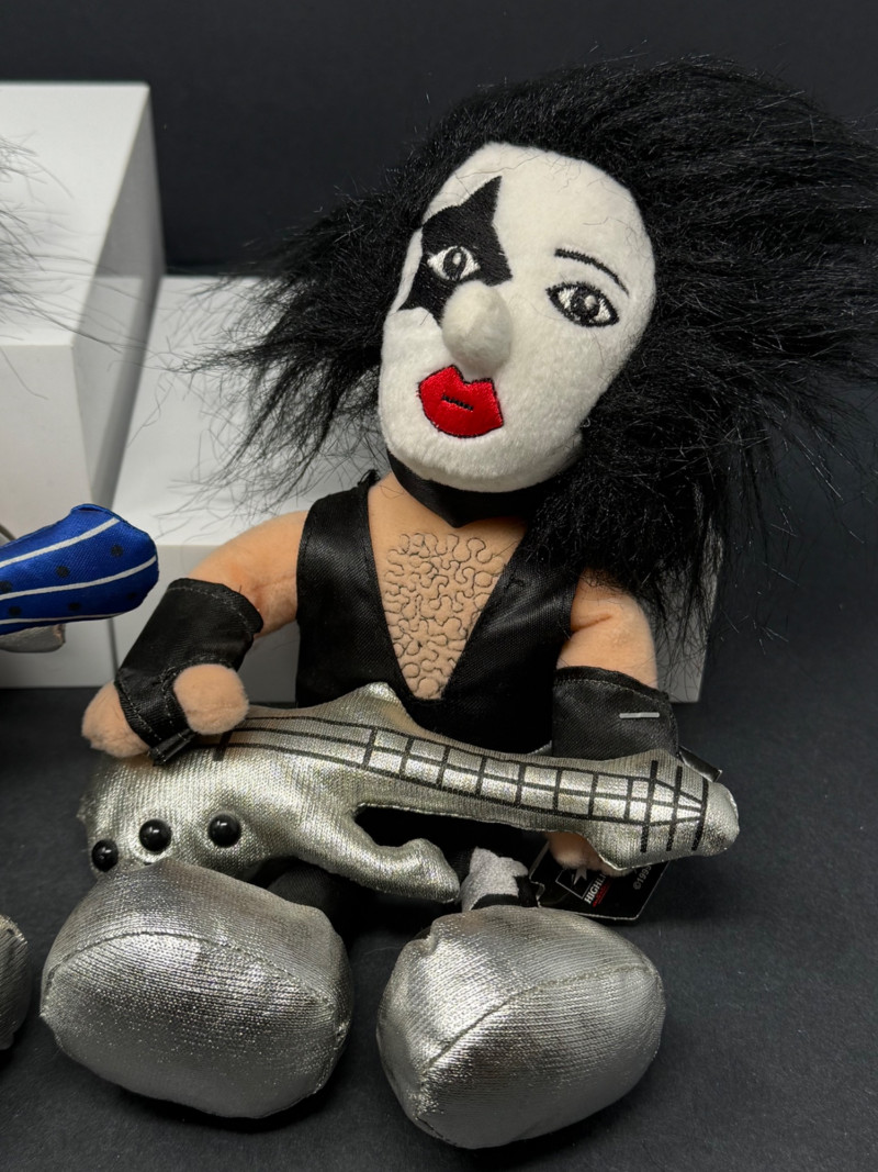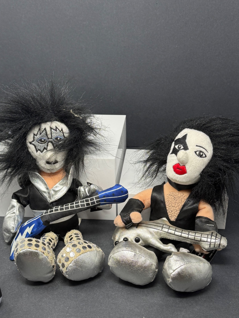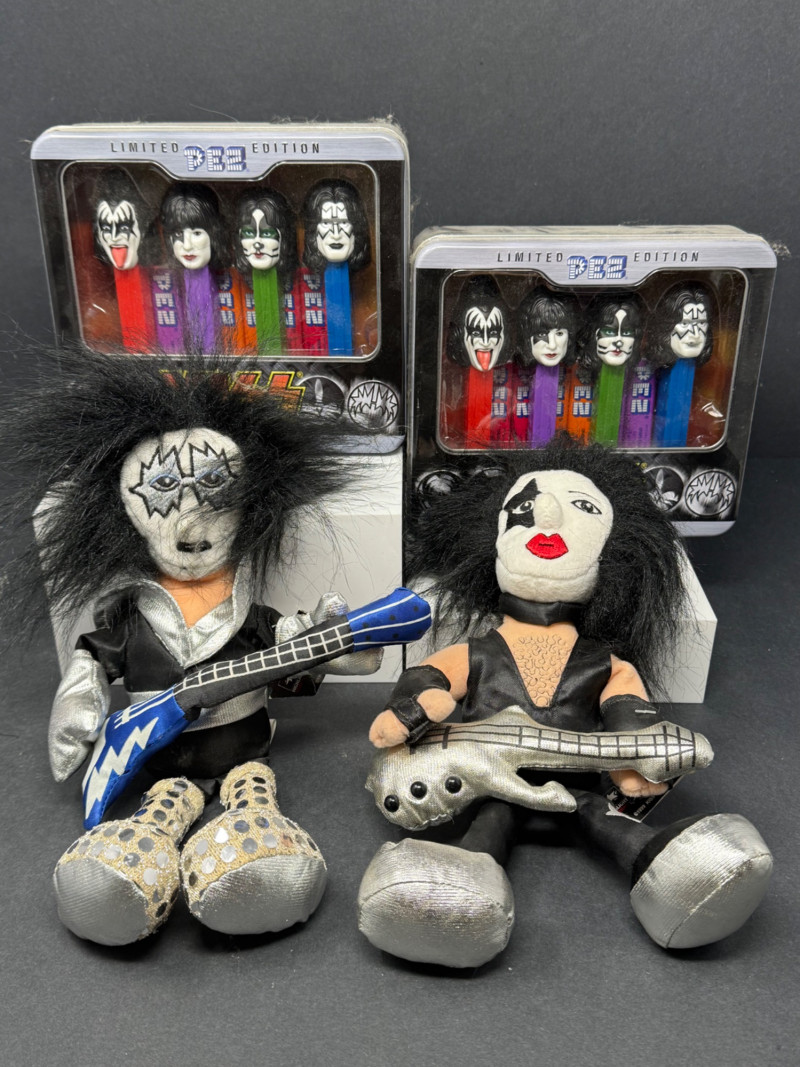 Limited Edition KISS PEZ Dispensers & Plush Dolls – Collectible Rock Memorabilia This exclusive collector’s set includes two limited edition KISS PEZ dispenser tins featuring vivid, detailed representations of each band member—Gene Simmons, Paul Stanley, Ace Frehley, and Peter Criss—complete with their iconic face paint. Accompanying the tins are two KISS plush dolls meticulously styled with signature costumes, guitars, metallic boots, and glam rock flair, capturing the band’s legendary stage presence. Maker: PEZ (dispensers), licensed KISS merchandise (plush dolls) PEZ Dispenser Tins: Approx. 7"W x 6"H Plush Dolls: Approx. 10"H each Why it’s special: