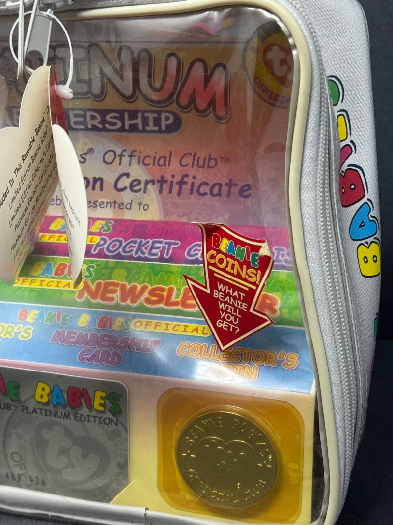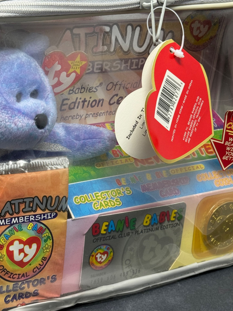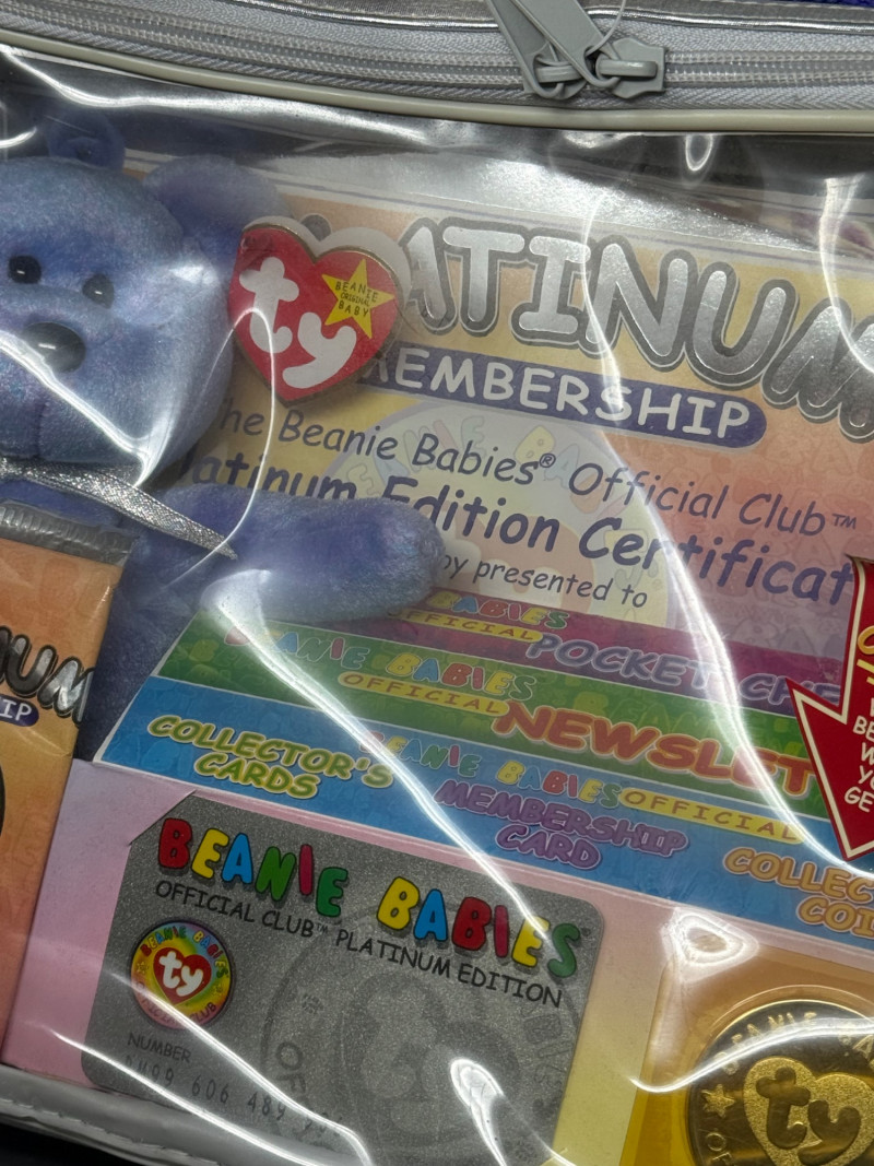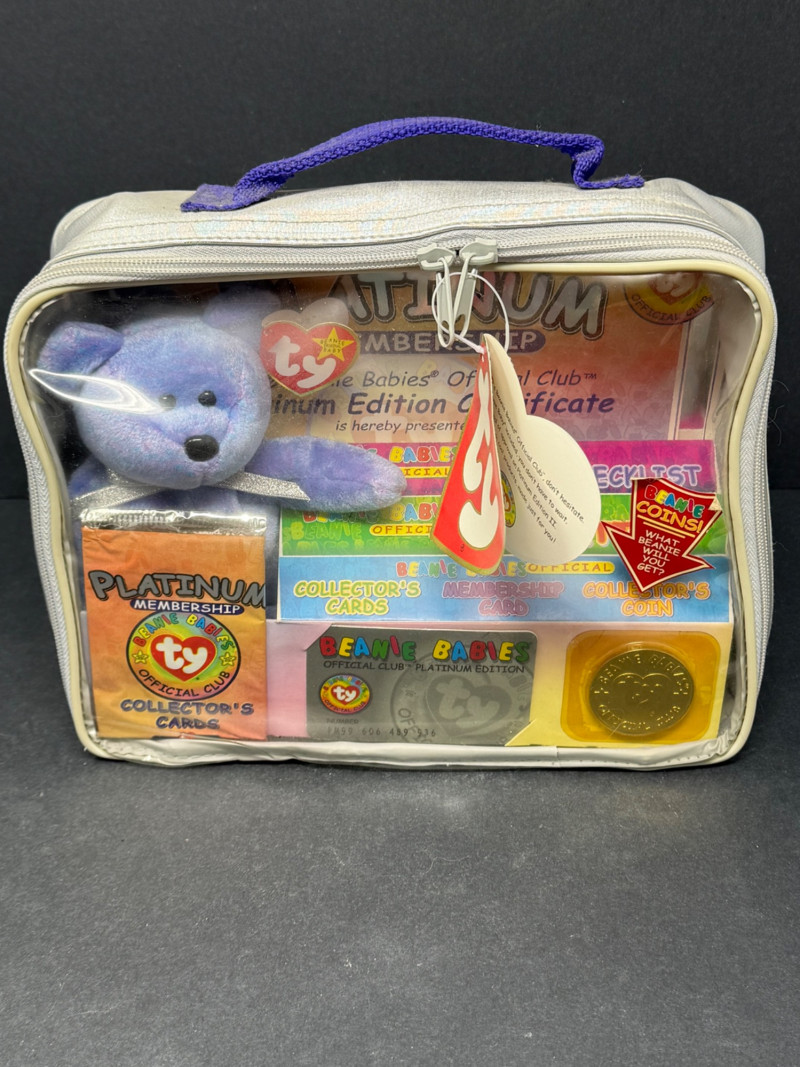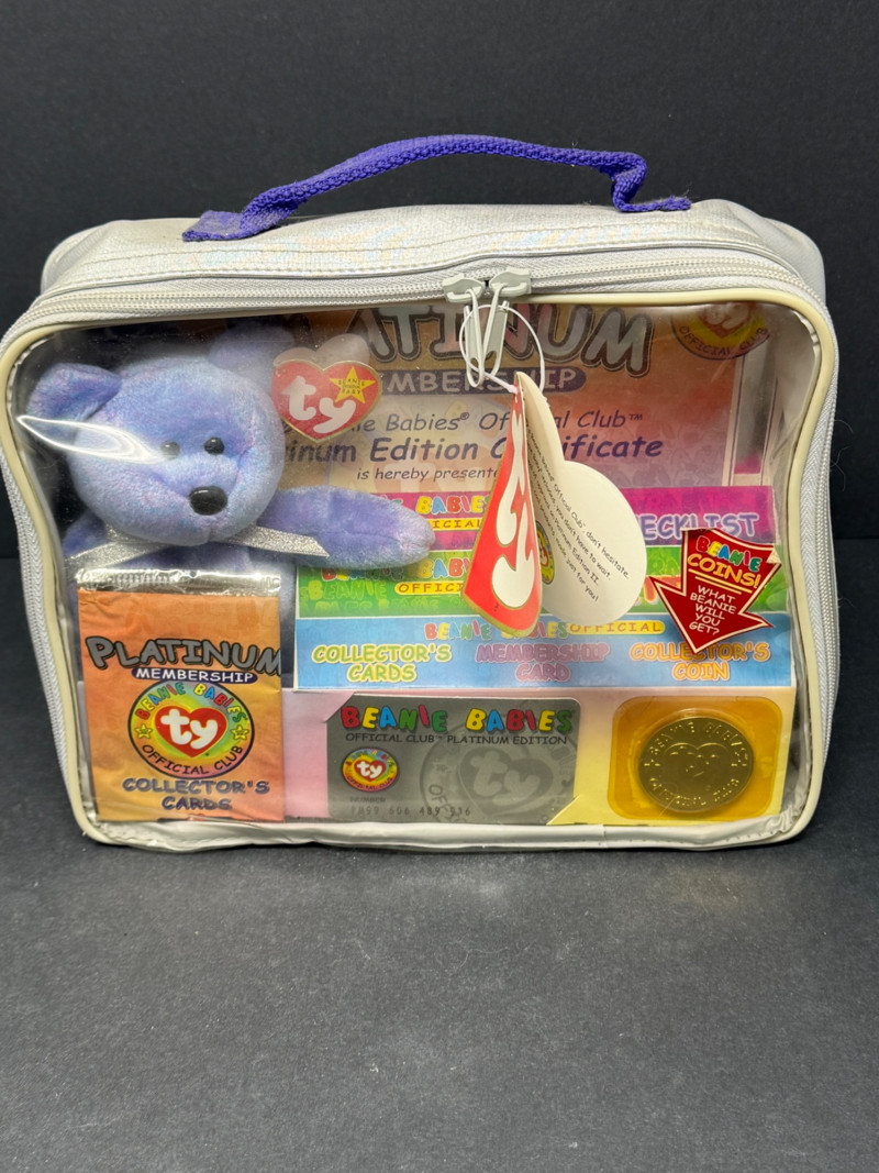 TY Beanie Babies Official Club Platinum Membership Kit – 1999 – Complete & Unopened This rare and collectible TY Beanie Babies Official Club Platinum Edition Kit from 1999 comes factory sealed in its original silver zippered case with purple handle. The set includes an exclusive light purple Beanie Baby bear with silver ribbon, a Platinum Edition membership certificate, collector’s cards, a checklist, official club membership card, and a collectible Beanie coin. Maker: TY Inc. Why it’s special: