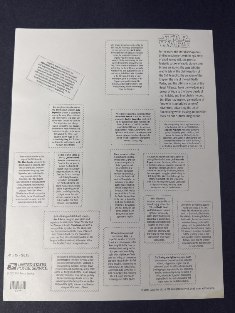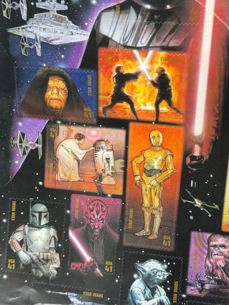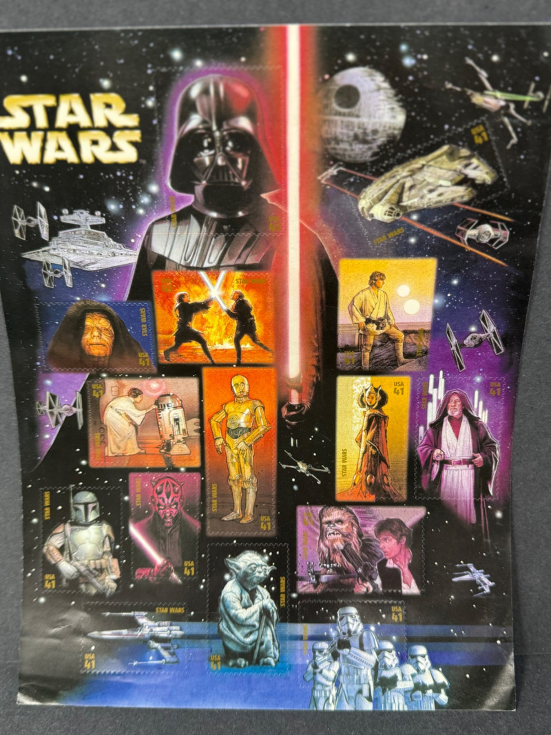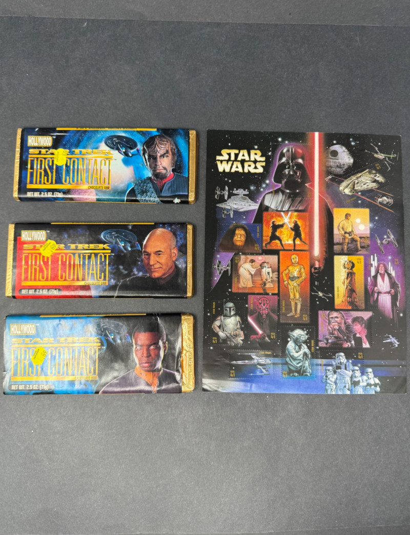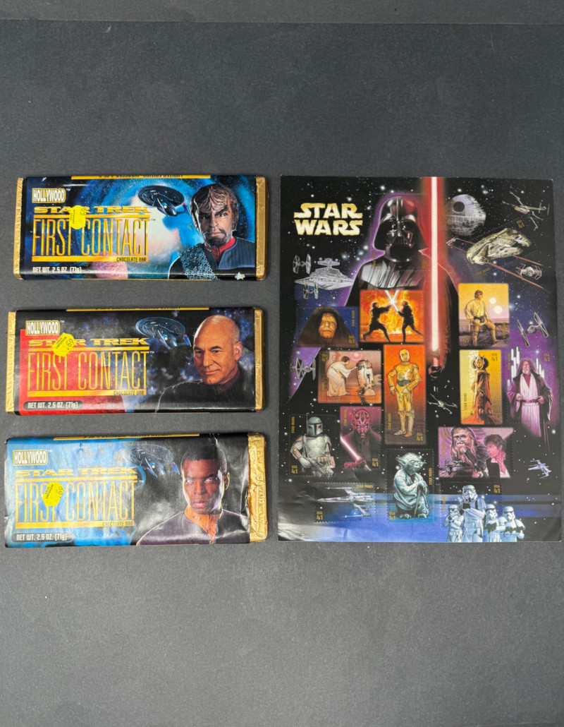 Star Trek “First Contact” Promo Chocolate Bars (Sealed) + 1990s Star Wars Stamp Sheet – Sci-Fi Collector’s Lot This rare vintage sci-fi duo features sealed Star Trek promotional chocolate bars and an original sheet of Star Warscollectible stamps—perfect for any Trekkie, Jedi, or intergalactic memorabilia collector. Included: Hollywood Star Trek: First Contact Chocolate Bars (x3) Movie Tie-In: Star Trek: First Contact (1996) Featured Characters: Worf (Michael Dorn) Captain Jean-Luc Picard (Patrick Stewart) Geordi La Forge (LeVar Burton) Size: 2.5 oz each (sealed; sold as collectibles only) Condition: Excellent vintage condition with original foil intact and price stickers visible Note: These bars were limited-time promotional items and are now very hard to find sealed. Star Wars USPS Stamp Sheet Issued: 1990s (Lucasfilm/USPS) Size: Approx. 8.5" x 11" Characters Featured: Darth Vader, Yoda, Luke, Leia, Chewbacca, R2-D2, C-3PO, Obi-Wan, and others Condition: Unused, light surface wear from age