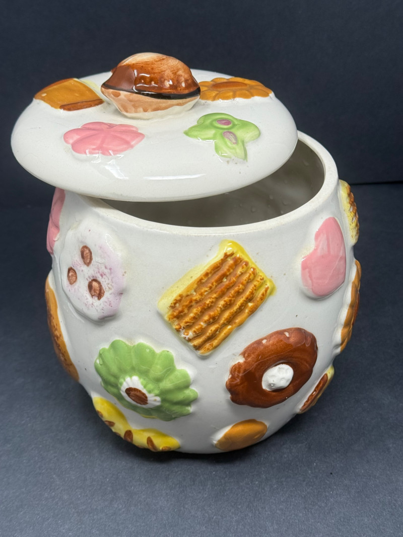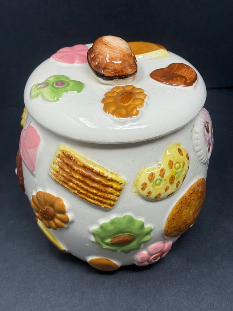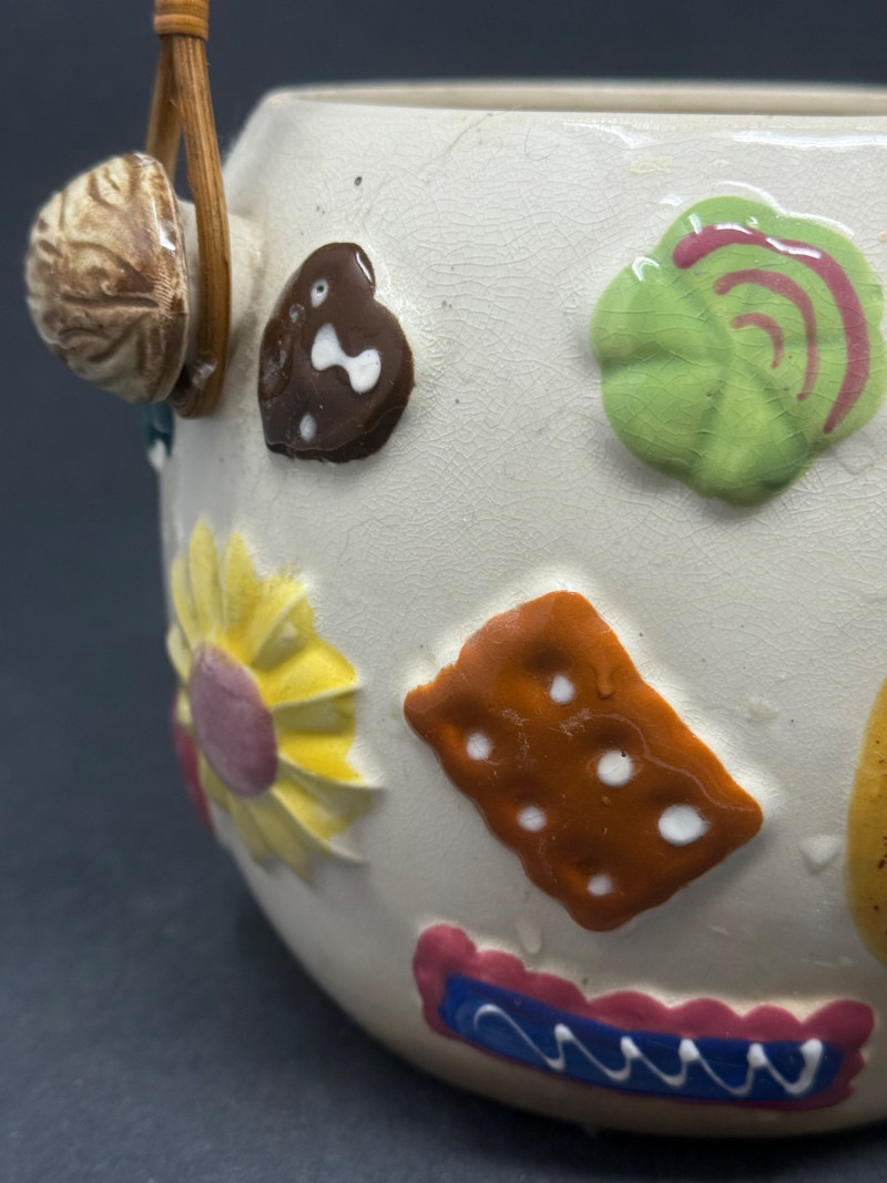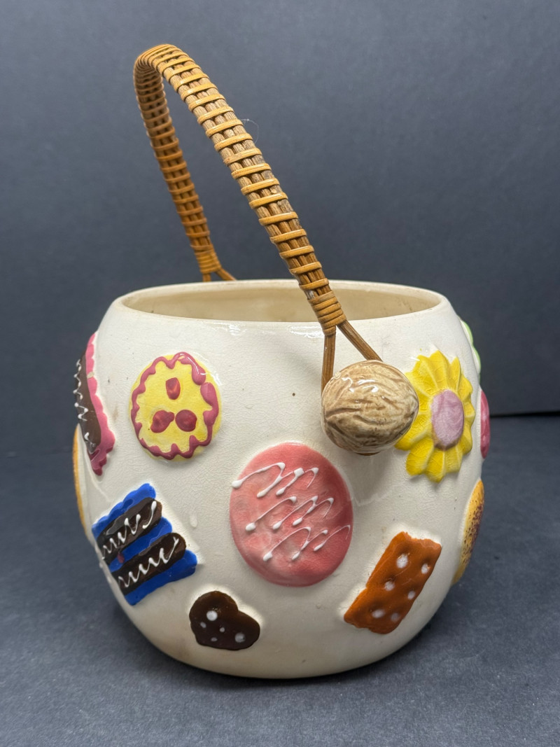 1950s Holt Howard Cookie-Themed Ceramic Jar & Basket Set – Mid-Century Kitsch Kitchen Collectibles This delightful mid-century ceramic set by Holt Howard features a whimsical all-over cookie and biscuit motif, with vibrant hand-painted accents and dimensional charm. A true gem for lovers of 1950s novelty kitchenware. Details: Authentic Holt Howard, circa 1950s Includes: Lidded cookie jar with molded pastry shapes and nut knob Open ceramic basket with rattan handle and figural walnut detail Features an assortment of raised and painted vintage cookie and cracker designs Material: Glazed ceramic with applied details and woven handle Dimensions: Approx. 7"–10" tall (including handle) Condition: Excellent vintage condition with vivid color retention; no chips or cracks noted Why It’s Special: