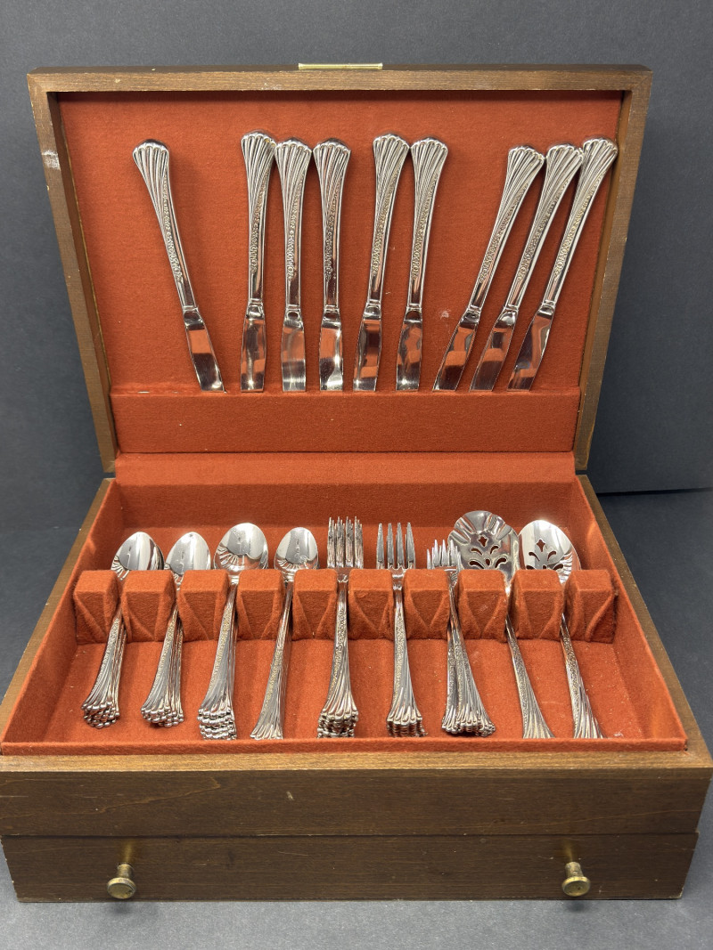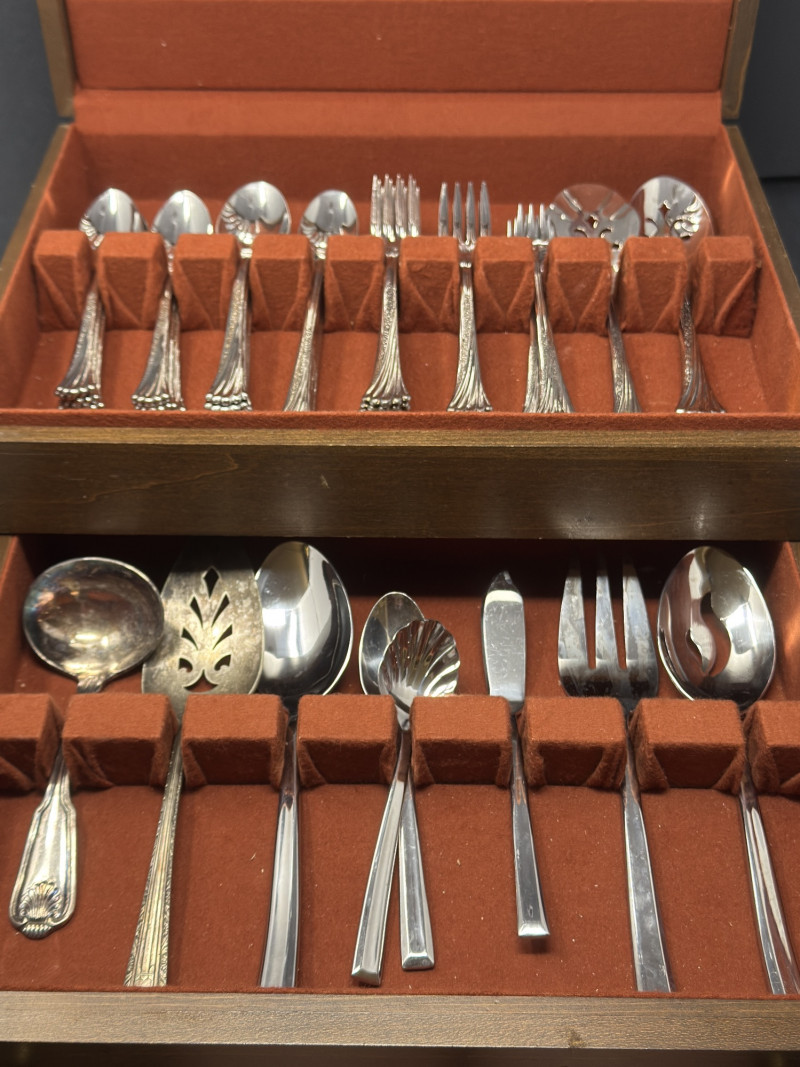 Vintage Oneida Silverplate Flatware Set in Box – Fan Tail Pattern (Mid-Century Service for 8+) This elegant Oneida silverplate flatware set features the timeless Fan Tail pattern, known for its flared, Art Deco–inspired lines and detailed floral scrollwork. Beautifully housed in its original felt-lined wooden case, this set is both display-worthy and dinner-ready. Flatware Count (from left to right): 9 dinner knives 13 teaspoons (little spoons) 8 tablespoons (big spoons) 7 dessert spoons 9 dinner forks (big forks) 9 salad forks (small forks) 9 cocktail/seafood forks (tiny forks) Additional Details: Brand: Oneida Pattern: Fan Tail (a.k.a. Broadlawn, circa 1950s) Material: Silverplate Case: Original 2-tier wooden box with brass knobs and rust-red felt lining Condition: Excellent vintage condition with light surface wear typical of age; all pieces present beautifully and are recently polished Also includes some misc silverware in bottom drawer Why It’s Special: