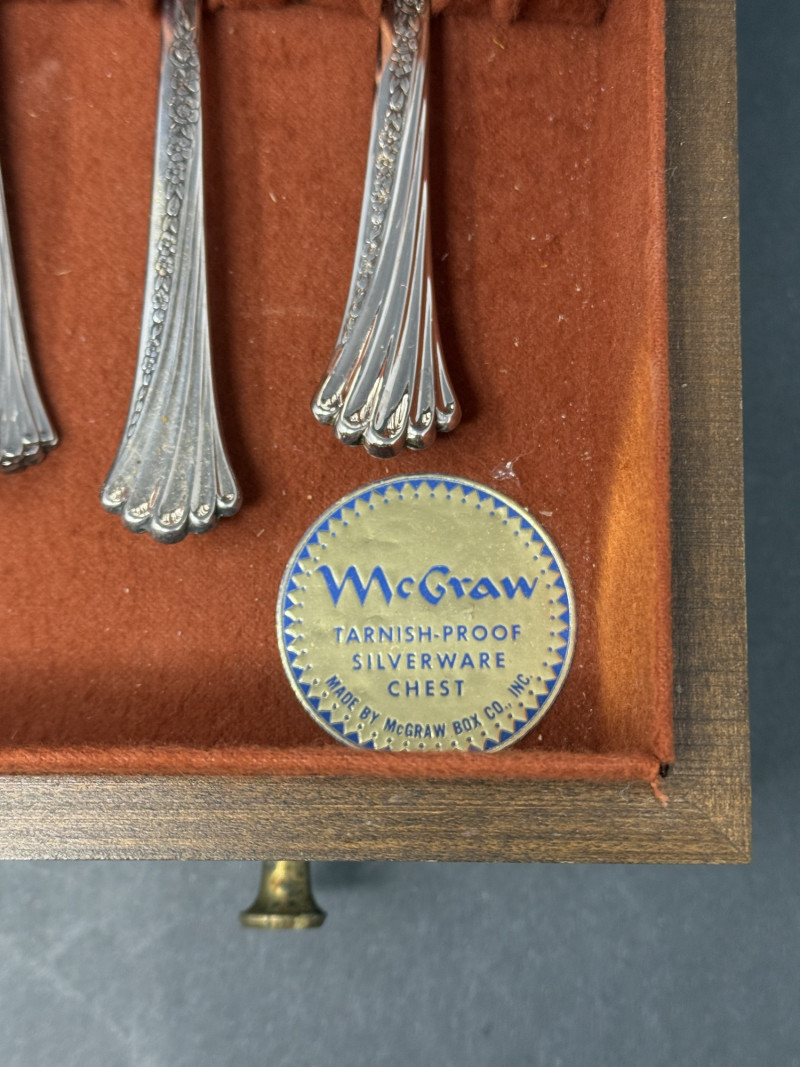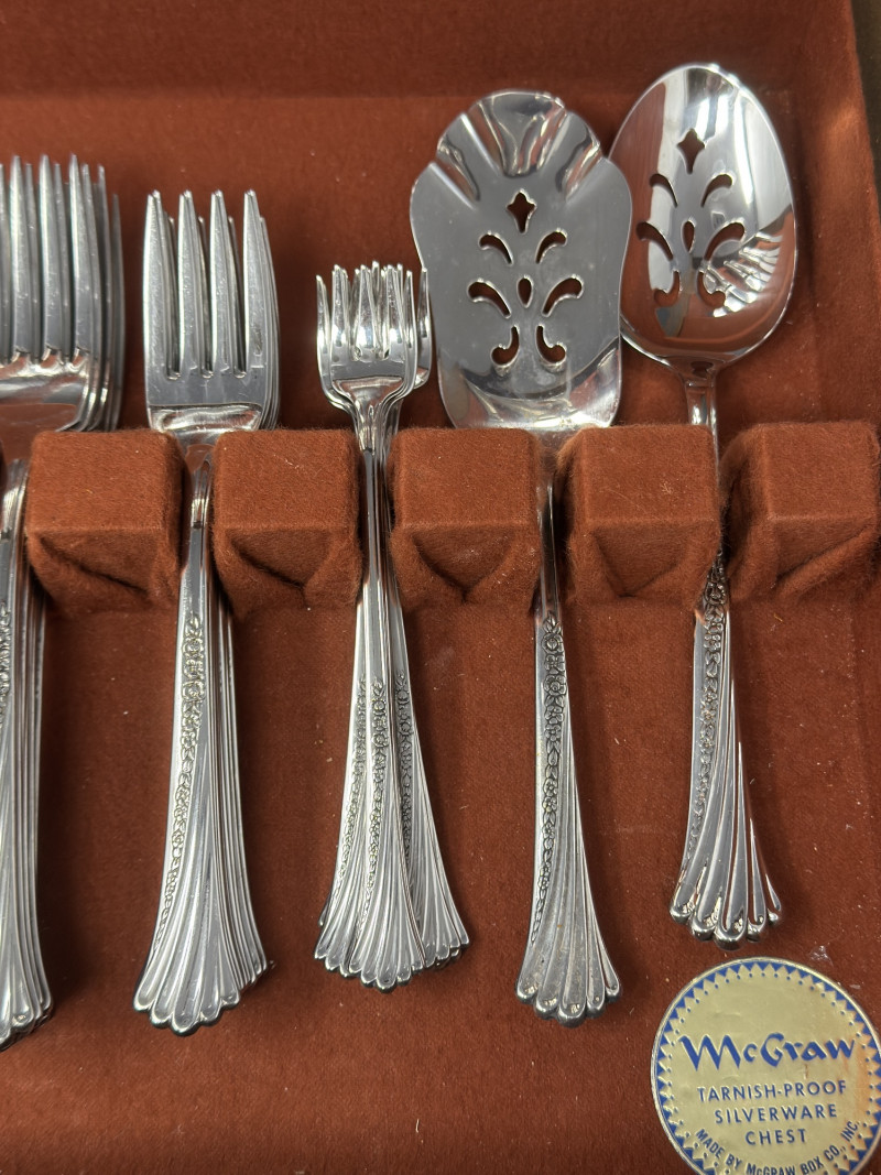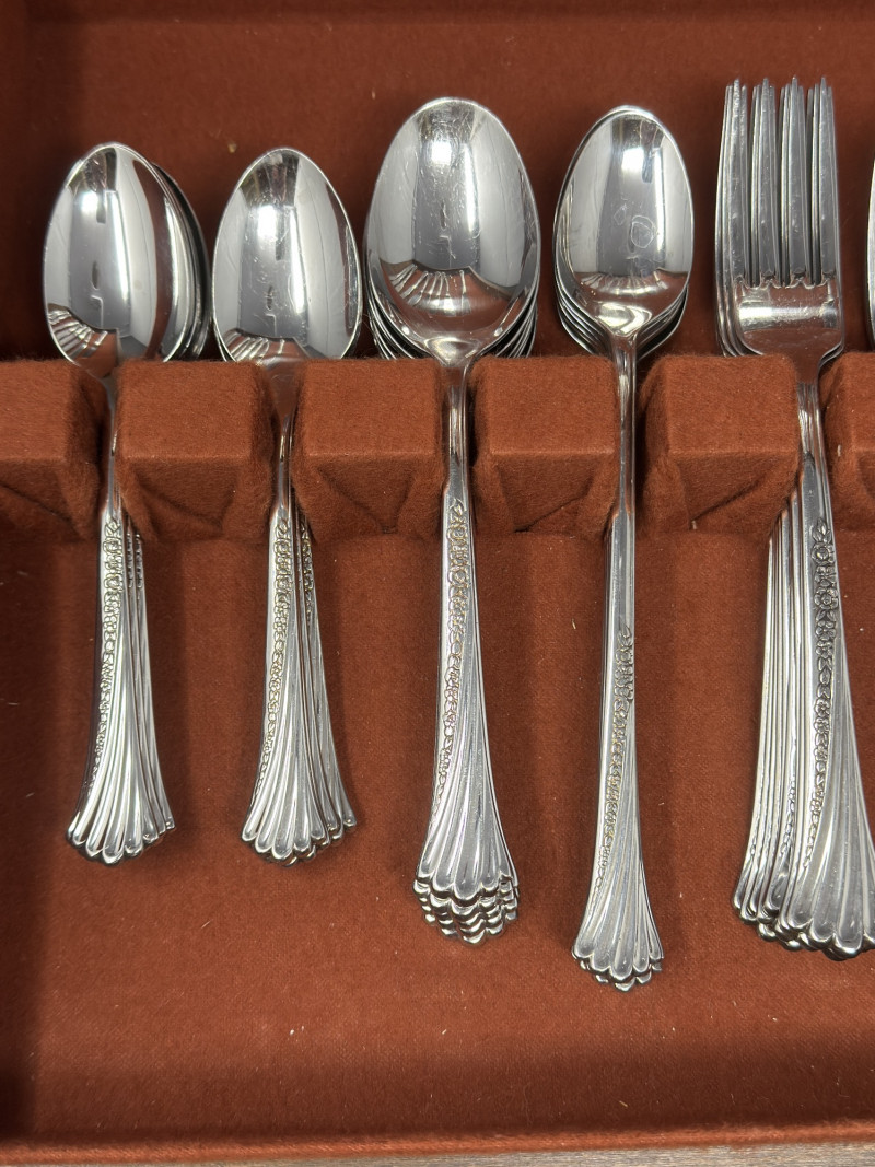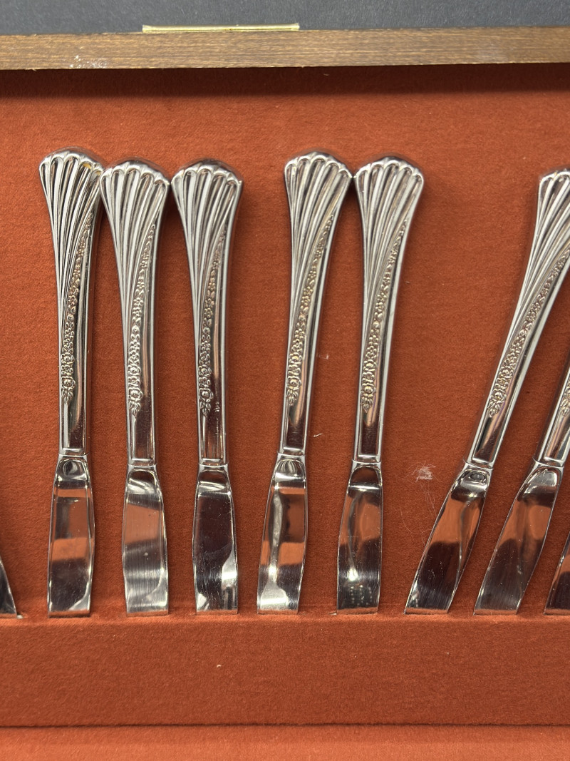A complete and stylish set for mid-century entertaining or heirloom-quality daily use. The extra forks and spoons beyond standard service make it perfect for large gatherings or vintage hosting with flair.