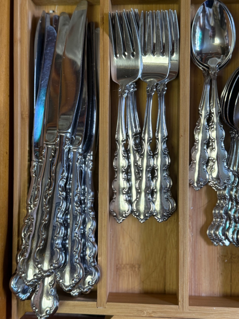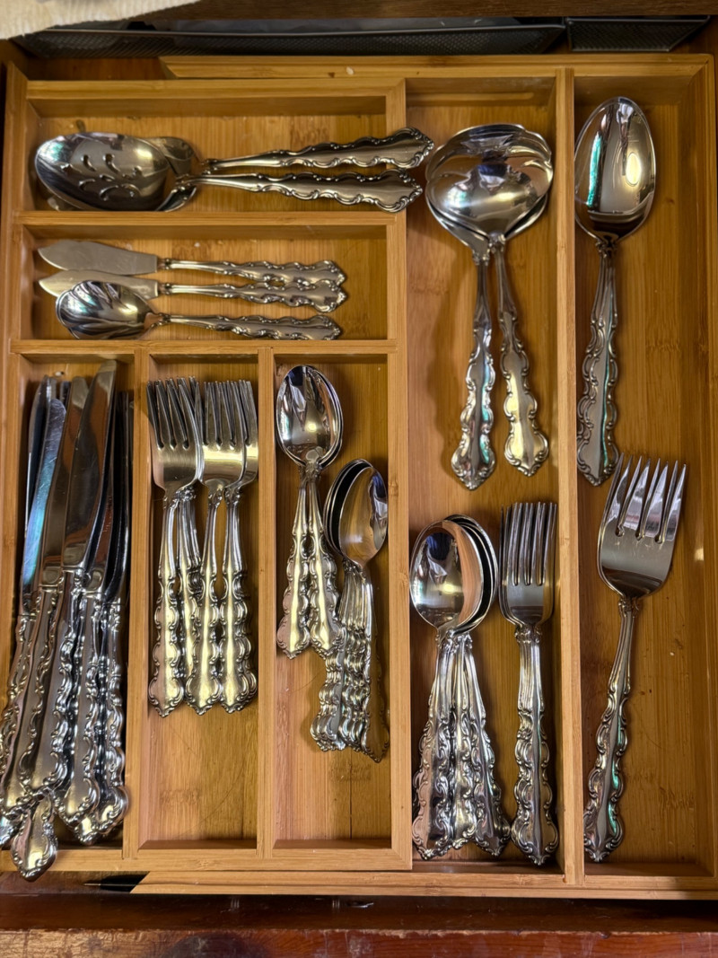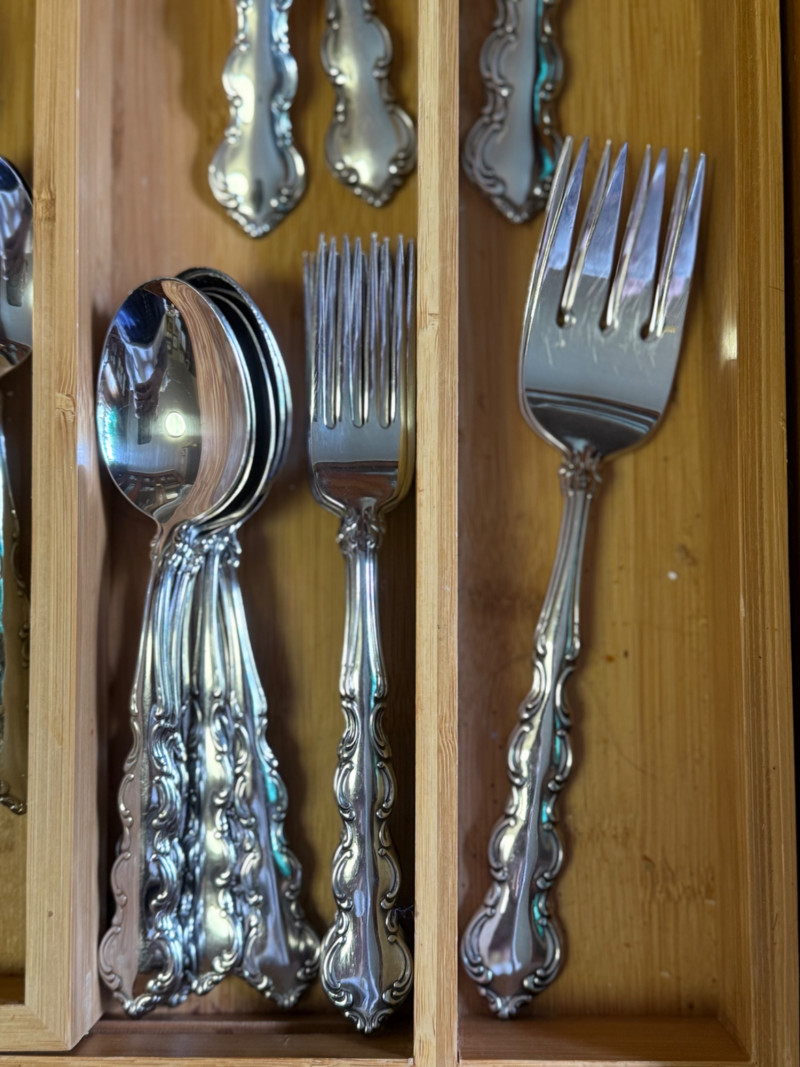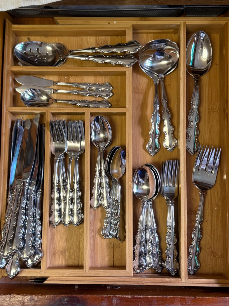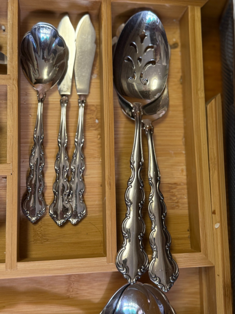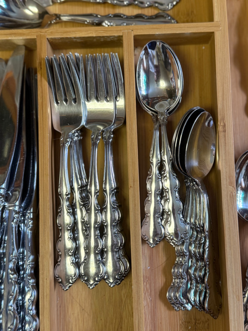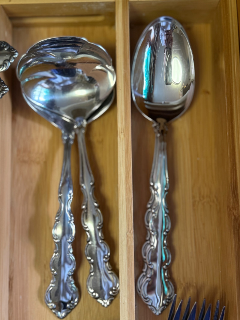 Vintage 1970s WM. Rogers & Son Silverplate Flatware Set – Ornate Scroll Pattern, 60+ Pieces with Serving Utensils This beautiful and complete 1970s silverplate flatware set by WM. Rogers & Son features an ornate scroll pattern with baroque-inspired detailing. With over 60 pieces, including multiple specialty serving utensils, this set is perfect for formal dining, vintage entertaining, or elegant daily use. Flatware Count (as arranged & counted): 14 dinner knives 15 salad forks (small forks) 10 dinner forks 15 teaspoons (small spoons) 9 tablespoons (large spoons) 2 serving spoons 2 serving forks 2 ladle spoons 2 cheese spreaders 2 shell dessert spoons 2 pierced (“holy”) serving spoons Details: Brand: WM. Rogers & Son Era: Circa 1970s Material: Silverplate Pattern: Unconfirmed, ornate scroll / baroque revival Storage: Does not include bamboo storage Condition: Excellent vintage condition with light surface wear; polished and table-ready Why It’s Special: