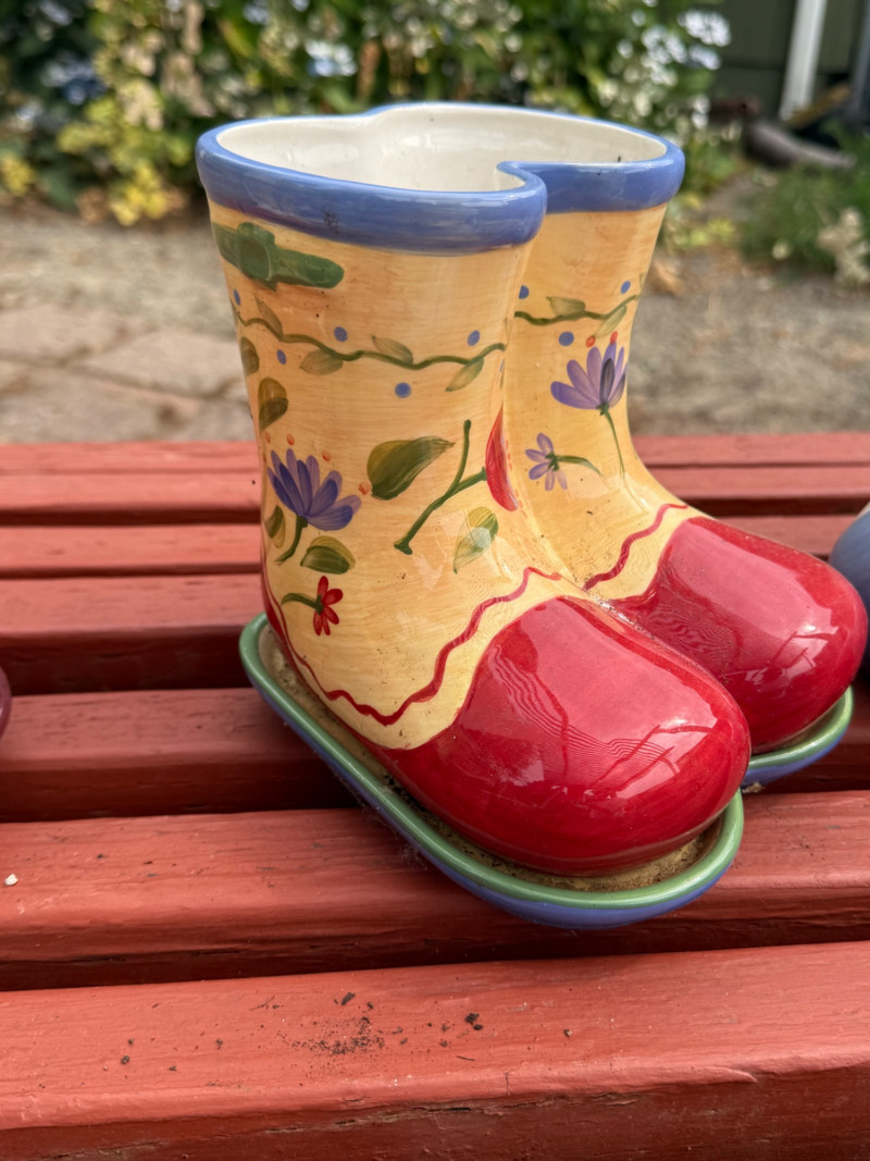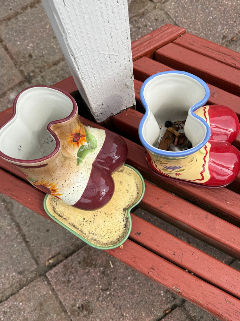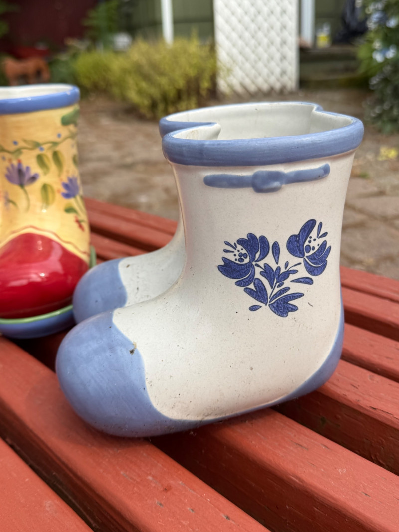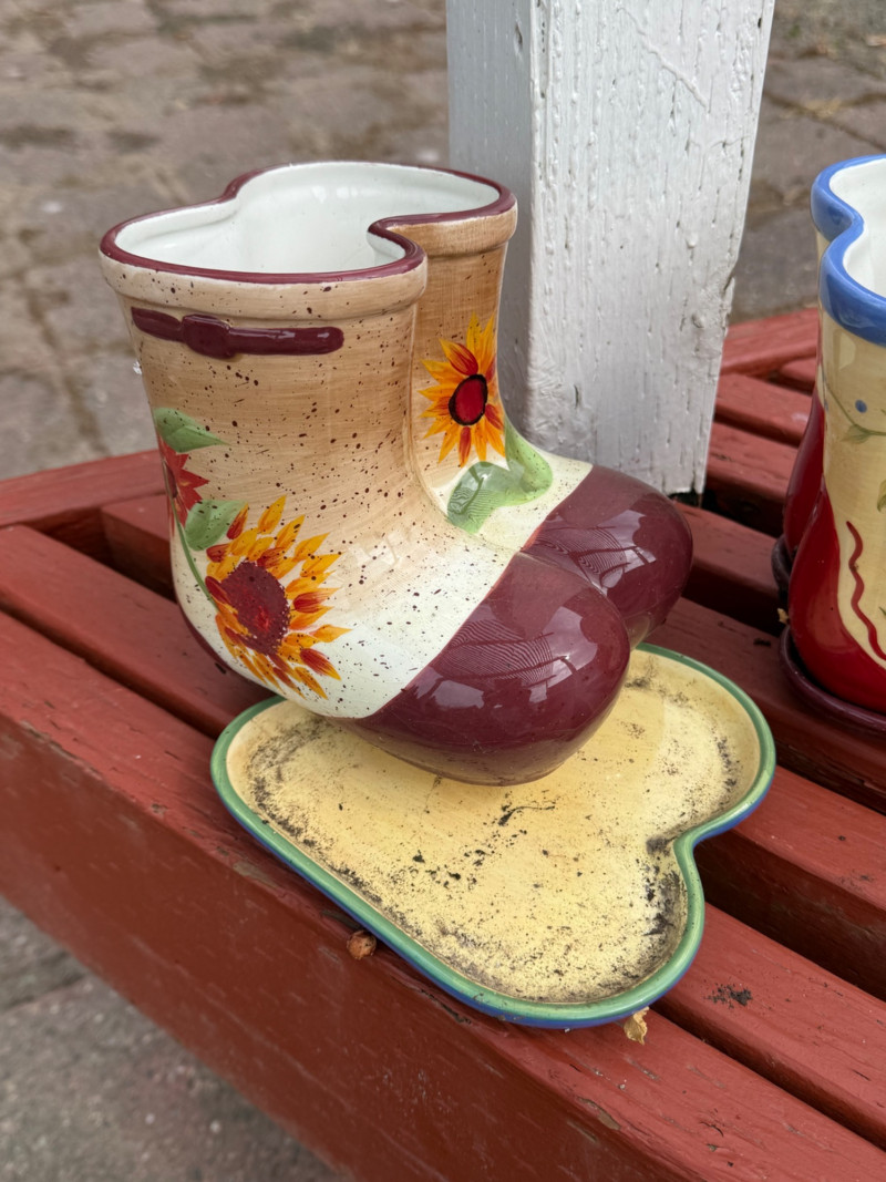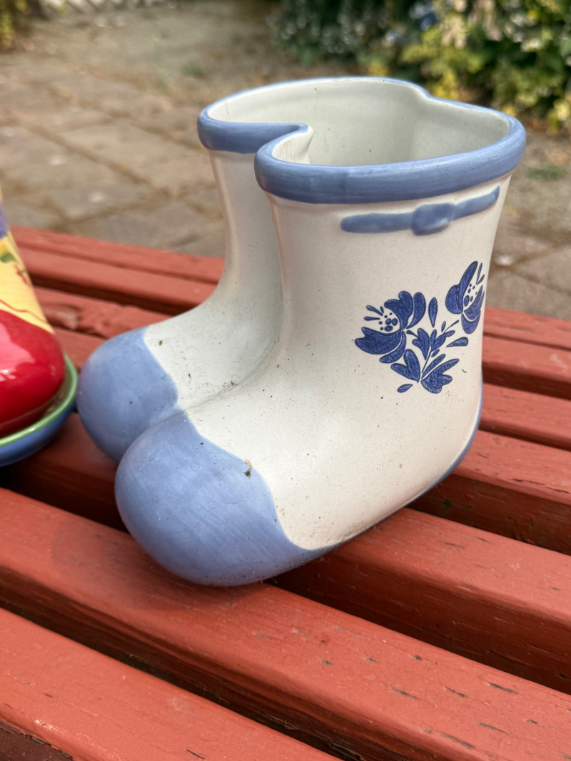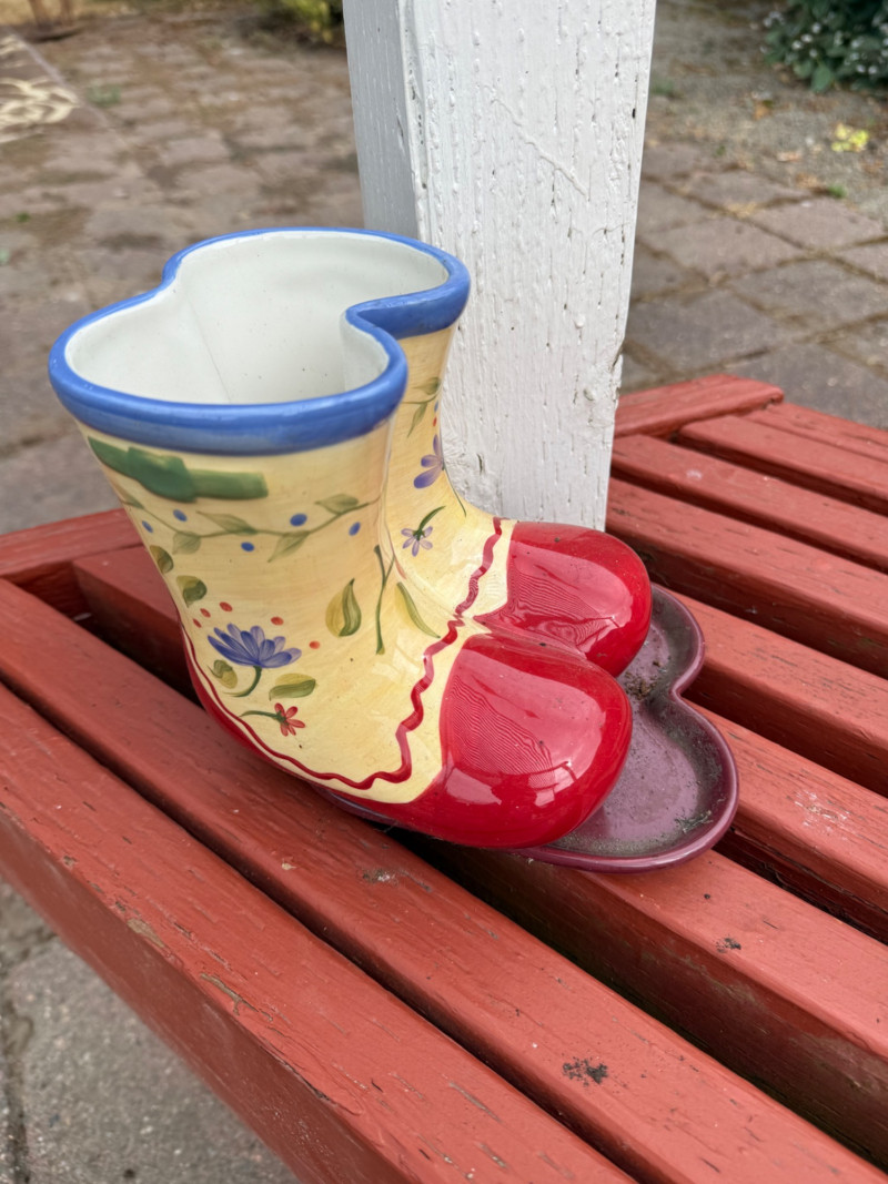 Set of 4 Fitz and Floyd Ceramic Rain Boot Planters – Hand-Painted – 1990s Garden Decor This whimsical set of four ceramic rain boot planters by Fitz and Floyd brings charm and color to any space. Known for their playful yet refined ceramic designs, Fitz and Floyd has been crafting collectible home accents since 1960. These boots, produced in the 1990s, showcase their signature style—rich glazes, hand-painted floral details, and creative forms. Perfect as planters, vases, or stand-alone decor, each boot features unique botanical artwork and a glossy finish. Display them together or scatter them throughout your home and garden for a cheerful vintage touch. Details: Brand: Fitz and Floyd Era: 1990s Material: Glazed ceramic Designs: 4 unique boots featuring vibrant florals and garden motifs Dimensions: Approx. 5"–6.5" tall, 4"–5.5" wide Condition: Excellent vintage condition; no chips or cracks. One planter is missing its bottom tray